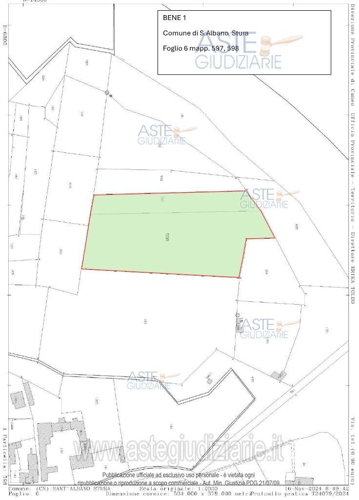 Vendita all'asta Senza incanto, con gara telematica asincrona - LOTTO 1: terreno agricolo ubicato a Sant'Albano Stura (CN) - via Carpeneta. Prezzo base € 82.650,00 (offerta minima € 61.987,00). Data inizio operazioni di vendita: 09/04/2026 ore 17:30. Giudice Roberta Bonaudi. Professionista delegato alla vendita Avv. Roberto Tesio - Email "mondino.tesio@multiwire.net"; Tel. 017441342. Custode Giudiziario Ifir Piemonte Ivg Srl - Email "richiestevisite.cuneo@ivgpiemonte.it"; Tel. 01711873923. Rif. Tribunale di Cuneo - Espropriazione immobiliare (cartabia) n. 56/2024