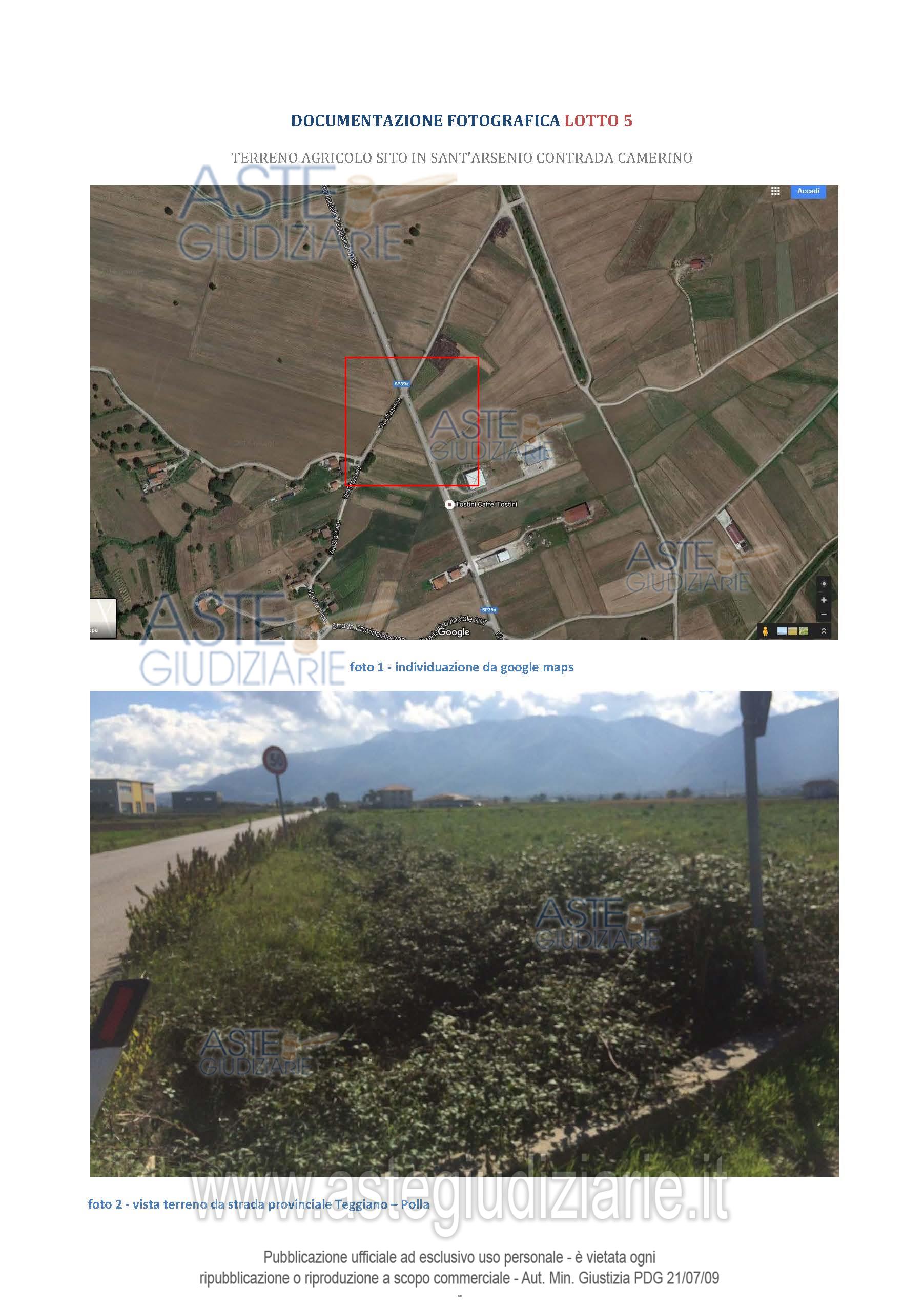 Vendita all'asta Senza incanto - LOTTO UNICO: Terreno agricolo ubicato nel Comune di Sant’Arsenio Contrada Camerino. Il terreno dista circa 7 km dal centro di Sant'Arsenio, in direzione sud. La particella è autonomamente accessibile percorrendo la Strada Provinciale Teggiano - Polla, su cui è posta in affaccio diretto proprio in un quadrivio tra la via Stazione e la via Provinciale Teggiano - Polla. Prezzo base € 6.041,25 (offerta minima € 4.530,94). Data vendita 26/03/2026 ore 11:00. Giudice Aniello Maria De Piano. Professionista delegato alla vendita Dott. Michele Iuliano - Email "dott.micheleiuliano@gmail.com"; Cell. 3477062963; Tel. 0818141646. Custode Giudiziario Dott. Michele Iuliano - Email "dott.micheleiuliano@gmail.com"; Cell. 3477062963; Tel. 0818141646. Rif. Tribunale di Lagonegro ex Tribunale di Sala Consilina - Esecuzione immobiliare post legge 80 n. 48/2012