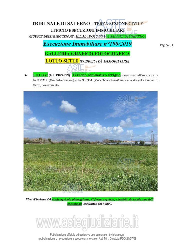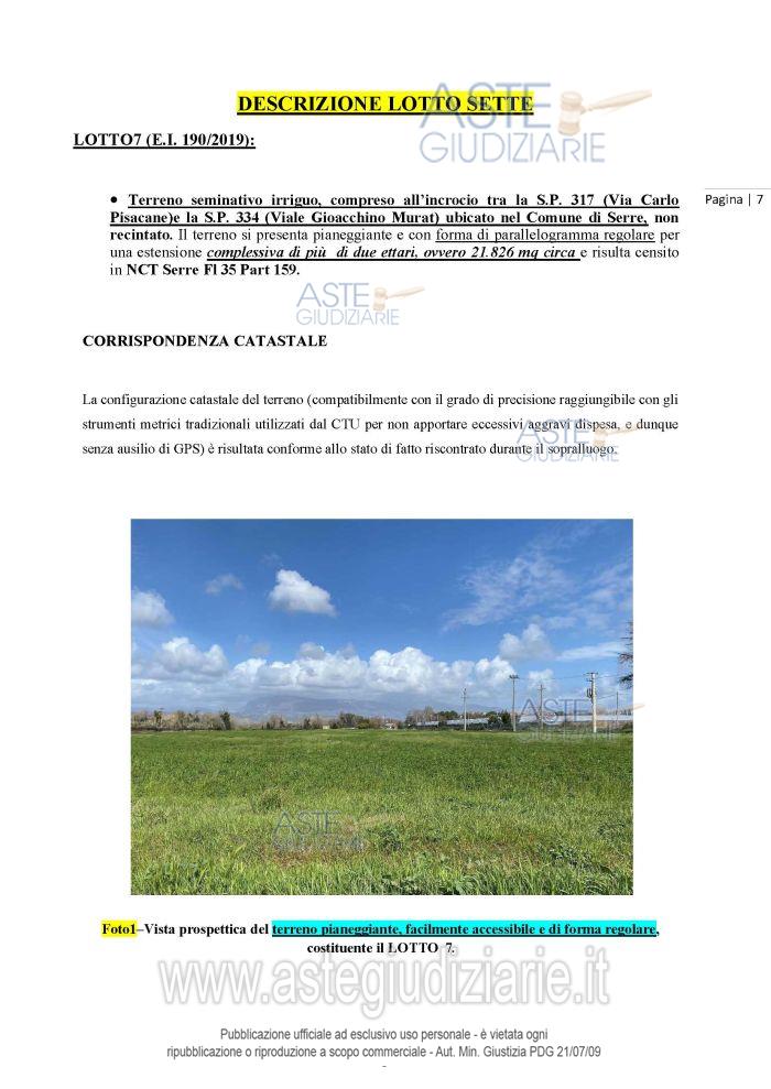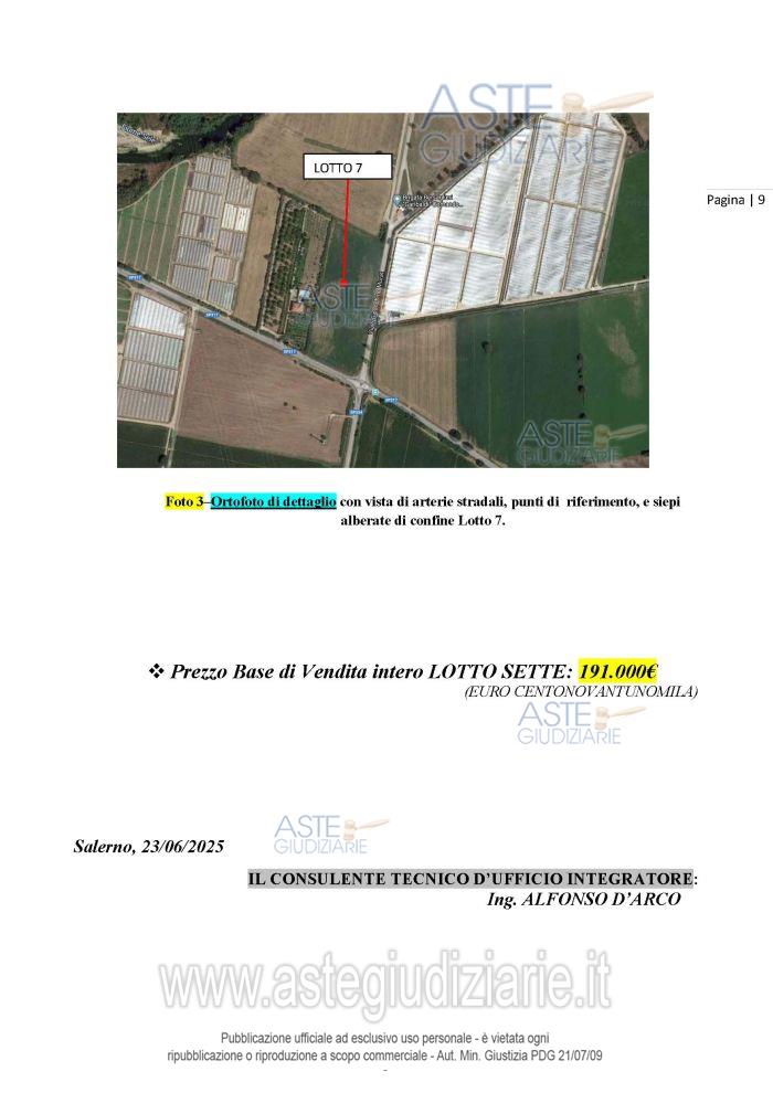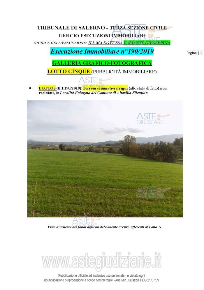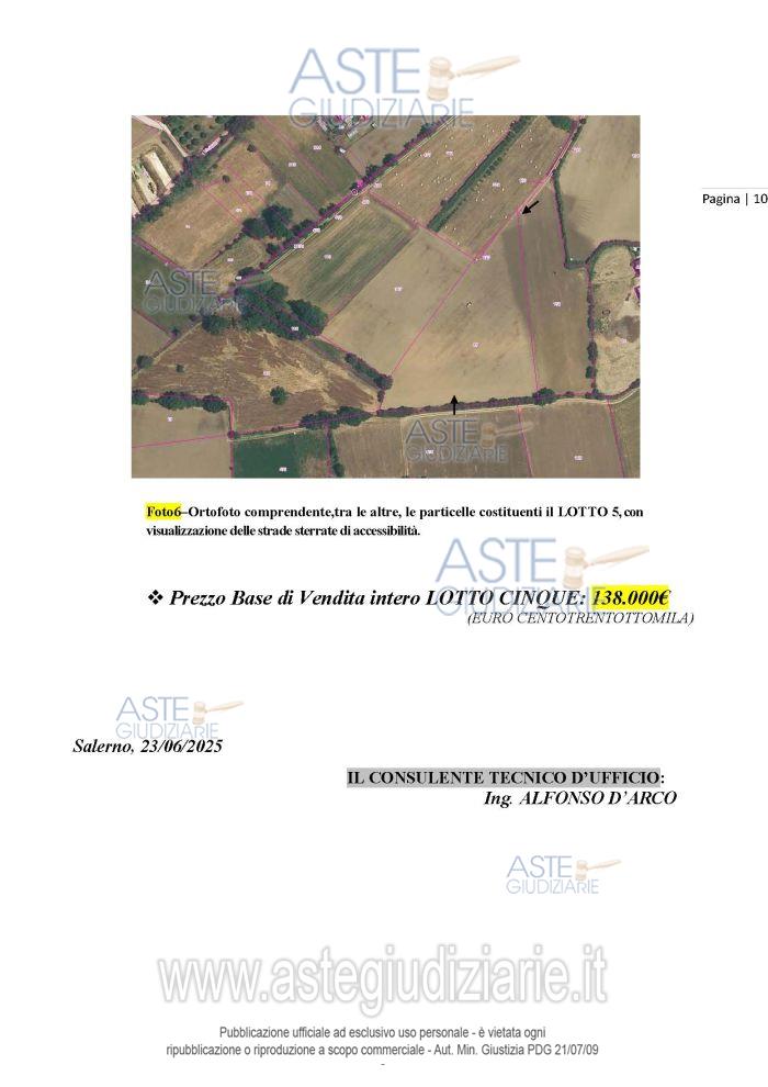 Vendita all'asta Senza incanto, con gara telematica asincrona - LOTTO 5: Terreni seminativi irrigui solo parzialmente recintati, accessibili tramite strada vicinale, perun’estensione complessiva di: 24.183 mq circa. Prezzo base € 138.000,00 (offerta minima € 103.500,00). Data inizio operazioni di vendita: 09/06/2026 ore 16:00. Professionista delegato alla vendita Avv. Francesco Marino. Custode Giudiziario Avv. Francesco Marino - Email "avvfrancescomarinoa@gmail.com". Rif. Tribunale di Salerno - Esecuzione immobiliare post legge 80 n. 190/2019