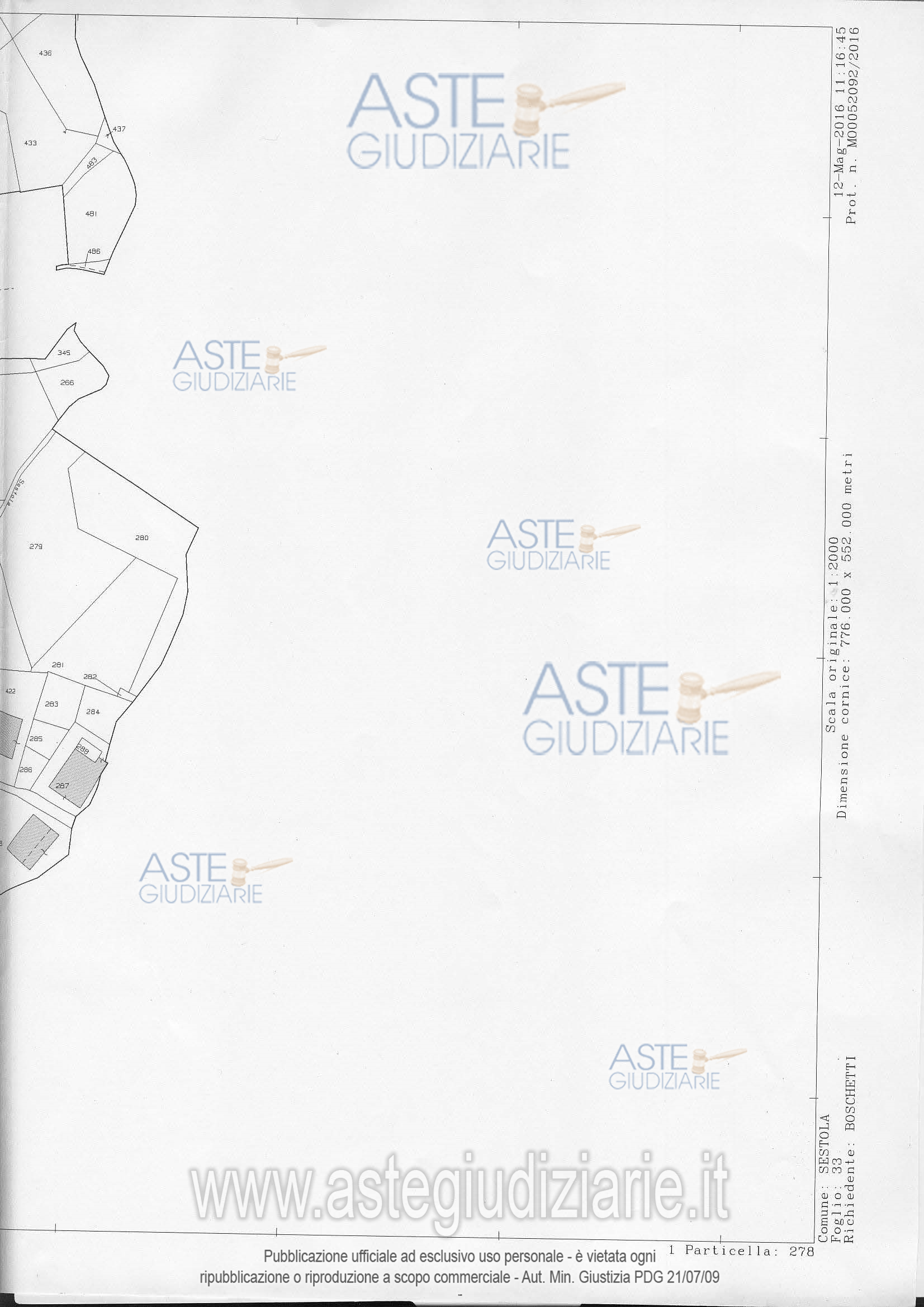 Vendita all'asta Senza incanto, con gara telematica asincrona - LOTTO UNICO: Sestola (MO), Loc. Sassaia, Via al Maneggio. Piena proprietà di 5 terreni agricoli (tot. 9.162 mq) di cui circa 2.200 mq edificabili (Ut=0,30 mq/mq). Identificazione Catasto Terreni: Fg. 33, mapp. 278 (mq 1.628, bosco ceduo); mapp. 279 (mq 3.392, seminativo); mapp. 280 (mq 2.129, bosco misto); mapp. 281 (mq 1.992, prato); mapp. 282 (mq 21, incolto). Per le quote specifiche di edificabilità di ogni particella e i dettagli d'uso, si rimanda integralmente alla perizia di stima allegata. Prezzo base € 32.000,00 (offerta minima € 24.000,00). Data inizio operazioni di vendita: 14/05/2026 ore 10:30. Professionista delegato alla vendita Dott. Laura Molteni - Email "laura@stmoltenimucciarini.it"; Tel. 053623031. Custode Giudiziario Alex Manelli - Email "visiteimmobili@ivgmodena.it"; Cell. 059847301. Rif. Tribunale di Modena - Esecuzione immobiliare post legge 80 n. 94/2016