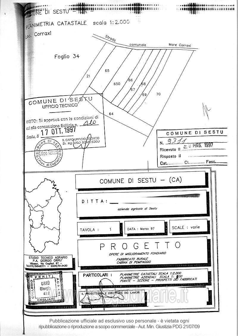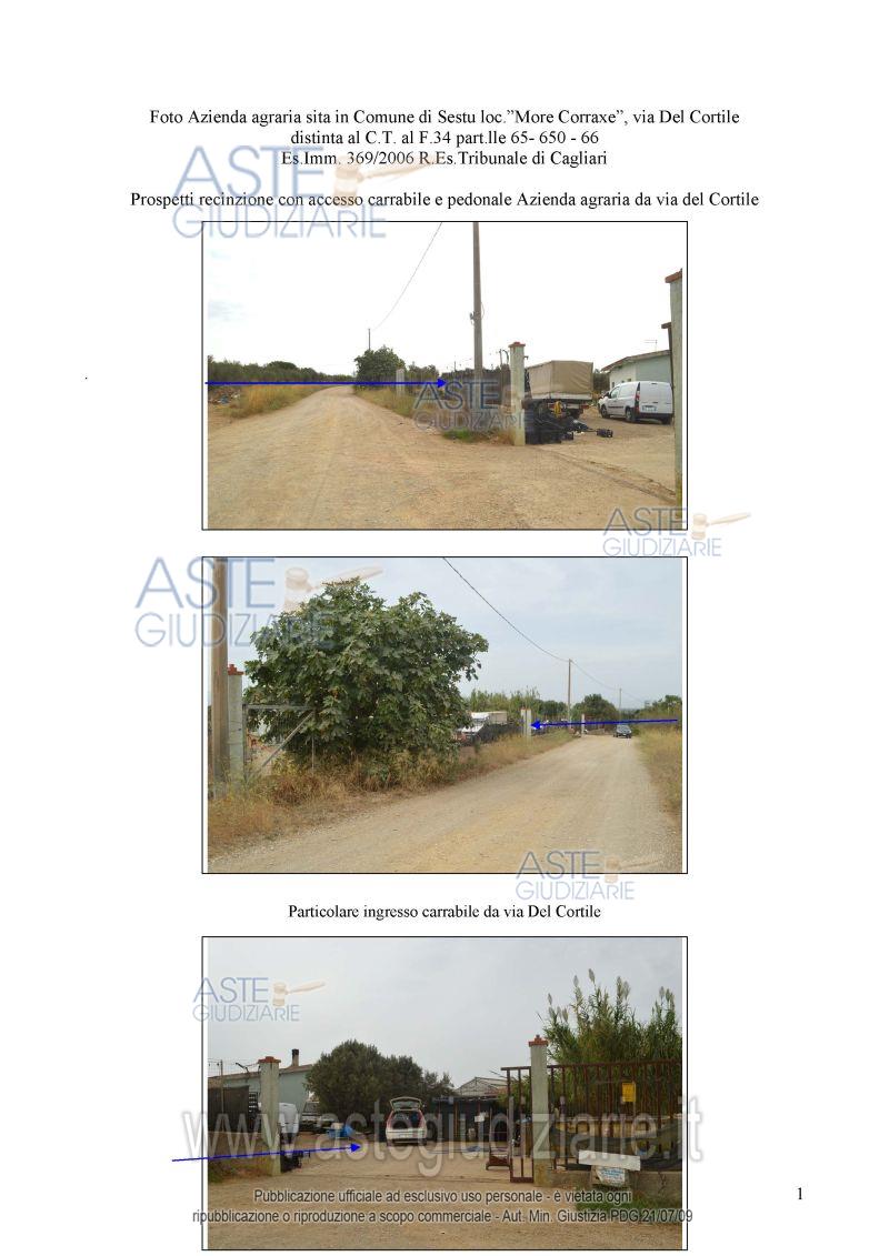 Vendita all'asta Senza incanto, con gara telematica asincrona - LOTTO UNICO: Quota pari all’intero del diritto di proprietà sui terreni costituenti una azienda agricola sita in agro del Comune di Sestu, località “More Corraxe" della superficie complessiva di mq 5.675 circa. I terreni sono ubicati a circa 1,2 Km dal centro abitato del Comune di Sestu e su di essi insistono una serra, un fabbricato rurale adibito ad abitazione rustica composto da salone con angolo cottura, camera da letto, bagno con antibagno; oltre un soppalco e un piccolo magazzino (ex locale impianto di pompaggio). Prezzo base € 75.100,00 (offerta minima € 56.325,00). Data inizio operazioni di vendita: 27/05/2026 ore 11:00. Giudice Flaminia Ielo. Professionista delegato alla vendita Not. Paolo Tardiola - Email "ufficiouniconotai@pec.it"; Tel. 07060222574. Custode Giudiziario Ivg Cagliari - Email "ivg.visiteimmobili@tiscali.it"; Tel. 0702299036. Rif. Tribunale di Cagliari - Esecuzione immobiliari n. 369/2006