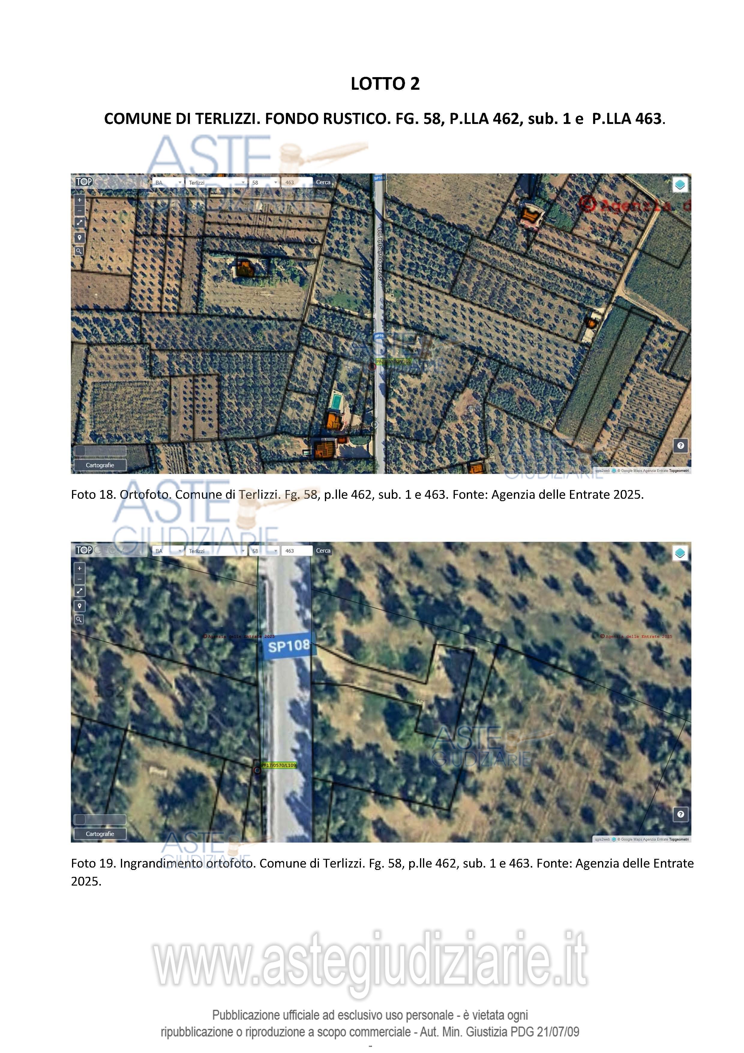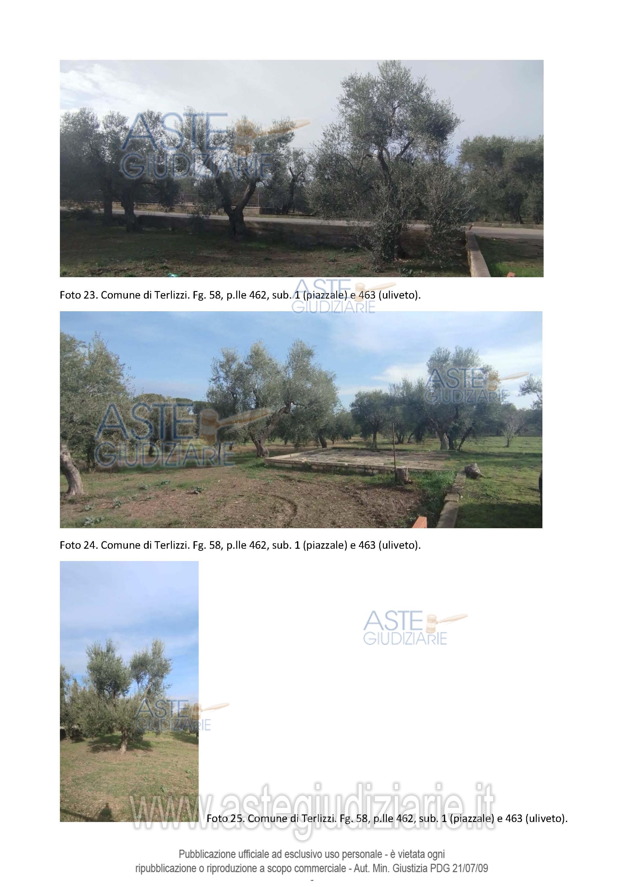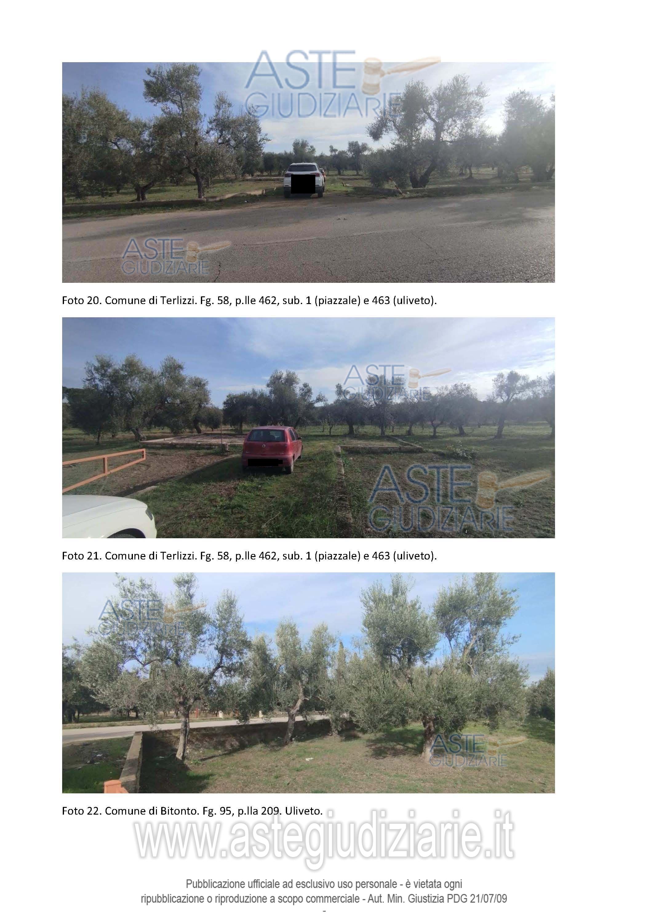Vendita all'asta Senza incanto, con gara telematica asincrona - LOTTO 2: Full and perfect ownership of a rural property with adjoining access, avenue, and square, as well as 17 olive trees in good condition, located in the Conca d’Oro district, with access from the Provincial Road 108 Terlizzi-Mariotto at Km 4.420, with a total area of approximately 844 square meters. Prezzo base € 14.775,00 (offerta minima € 11.081,25). Data inizio operazioni di vendita: 20/05/2026 ore 10:00. Giudice Dott. Maria Azzurra Guerra. Professionista delegato alla vendita Dott. Giovanna Panzuto. Custode Giudiziario Aste Giudiziarie Inlinea S.P.A. - Email "vendite@astegiudiziarie.it"; Tel. 0586 201480. Rif. Tribunale di Trani - Liquidazione controllata(cci) n. 36/2024