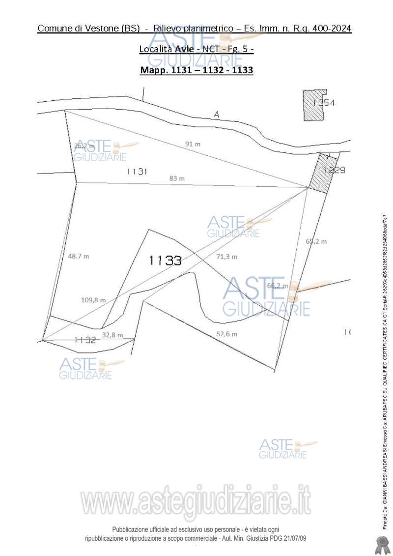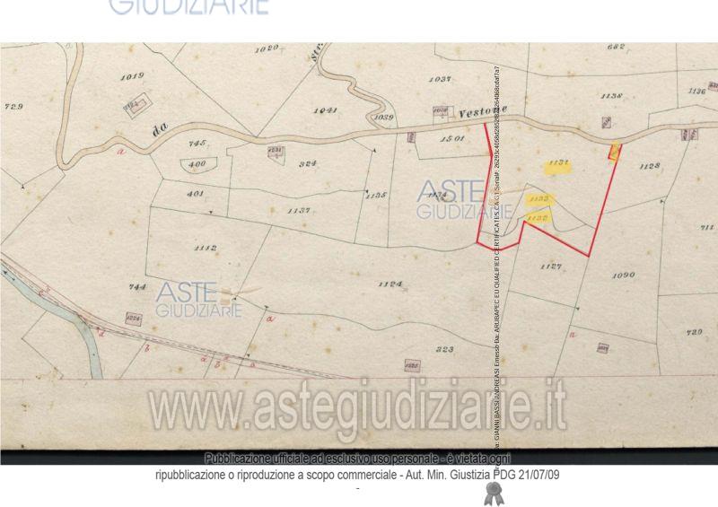 Vendita all'asta Senza incanto, con gara telematica asincrona - LOTTO 2: Piena proprietà. Trattasi, ex perizia, di terreni su pendio premontano, il tutto censito al Catasto Terreni - Fg. 5 mapp. 1131 - prato arborato Cl.4, RD Euro 8,82, RA Euro 8,82mapp. 1132 - prato Cl.5, RD Euro 1,23, RA Euro 1,23 mapp. 1133 - prato Cl.5, RD Euro 0,91, RA Euro 0,91 con le proporzionali quote delle parti comuni ai sensi di legge. Prezzo base € 8.648,44 (offerta minima € 6.486,33). Data inizio operazioni di vendita: 10/06/2026 ore 09:30. Giudice: Dellesecuzione Giudice.