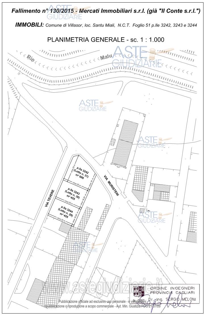 Vendita all'asta Senza incanto, con gara telematica asincrona - LOTTO 1: Quota pari al 100% della piena proprietà del terreno sito nel comune di Villasor, località Santu Miali, distinto al N.C.T. al Foglio 51 particelle 3242, 3243 e 3244, identificate rispettivamente come lotti nn. 31, 30 e 29 della lottizzazione "Bia Santu Sparau", della superficie complessiva di 1.510 m². Prezzo base € 60.000,00 (offerta minima € 60.000,00). Data inizio operazioni di vendita: 09/06/2026 ore 10:00. Curatore Dott. Giuseppe Marongiu - Email "studio@studiomarongiu.it"; Tel. 0704560865. Rif. Tribunale di Cagliari - Fallimentare (nuovo rito) n. 130/2015