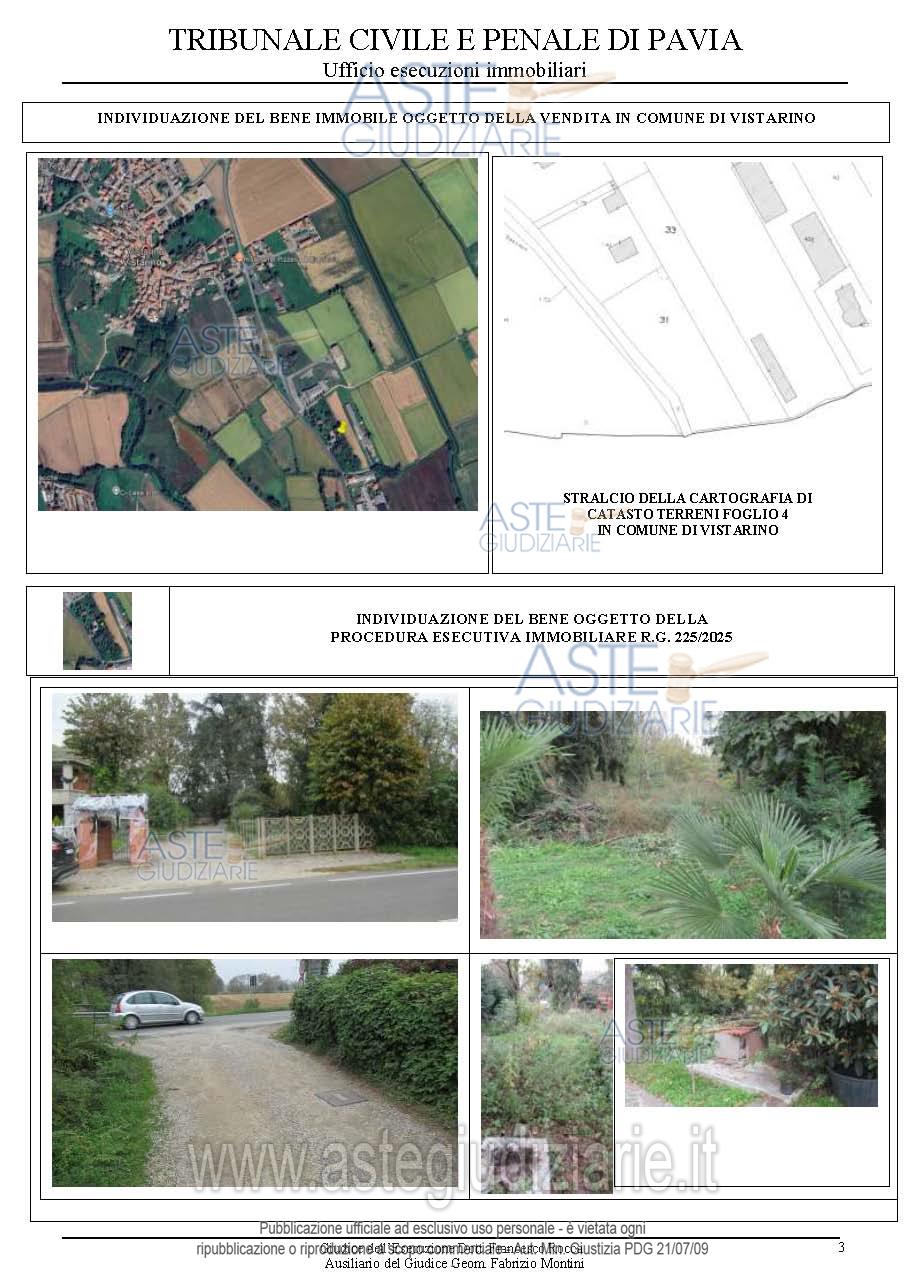Vendita all'asta Senza incanto, con gara telematica asincrona - LOTTO 1: Trattasi di un lotto di terreno attualmente non coltivato ed è in stato boschivo e in abbandonato. Prezzo base € 21.168,50 (offerta minima € 15.876,00). Data inizio operazioni di vendita: 03/06/2026 ore 10:00. Giudice Erminio Rizzi. Professionista delegato alla vendita Dott. Elena Gazzaniga. Custode Giudiziario Ivg Pavia-Lodi - Email "immobiliare@ivgpavialodi.it". Rif. Tribunale di Pavia - Espropriazione immobiliare (cartabia) n. 225/2025