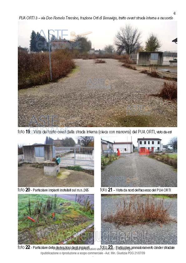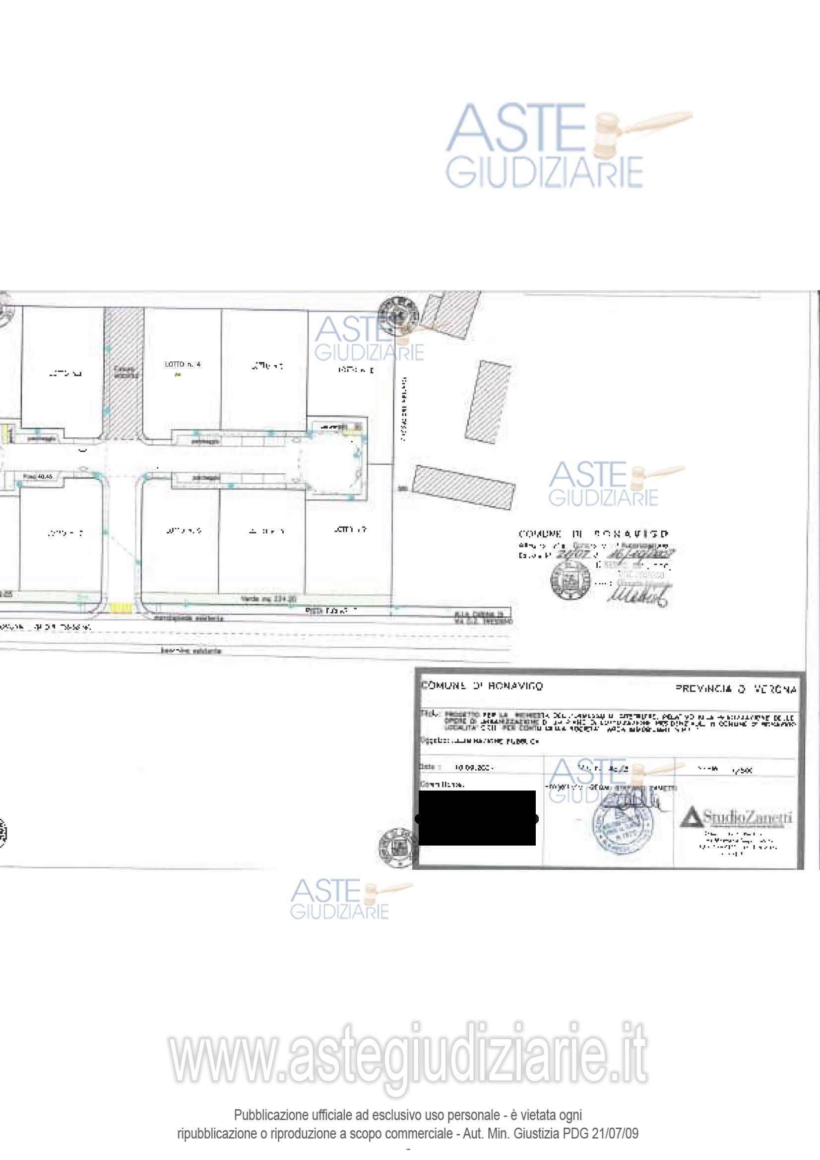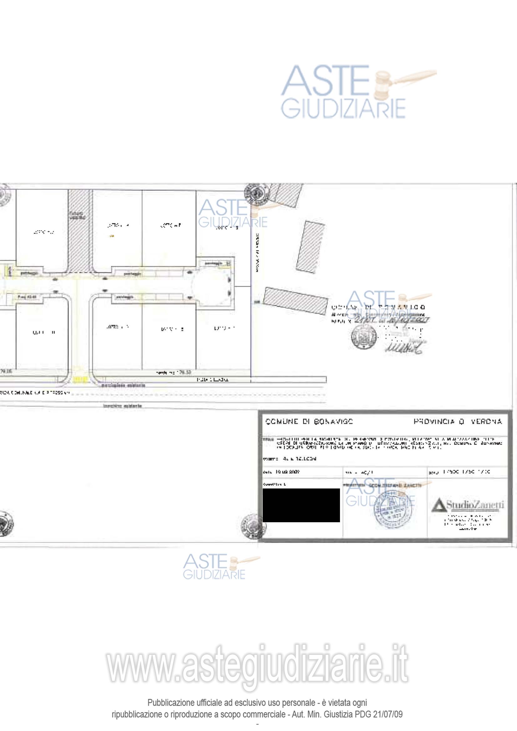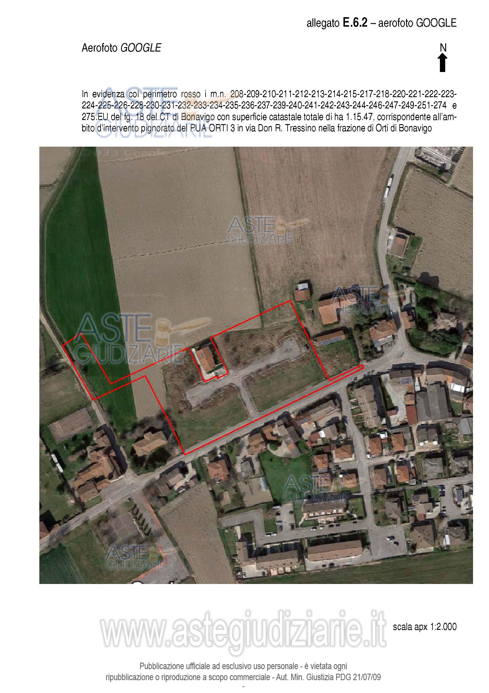 Vendita all'asta Senza incanto, con gara telematica sincrona mista - LOTTO UNICO: Bonavigo (VR), frazione di Orti, via Don Romolo Tressino, piena proprietà di terreni oggetto di lottizzazione residenziale in corso di urbanizzazione (lottizzazione con opere interrotte e confini da ridefinire) di 11.547 m² (di cui sup. fondiaria m² 6.786, sup. strada, V, P m² 3.166, sup. urb. secondaria m² 1.595) costituito da: 11 lotti con volume edificabile di m³ 700 ciascuno per un totale di volume edificabile di m³ 9.727. Prezzo base € 63.000,00 (offerta minima € 47.250,00). Data vendita 07/05/2026 ore 14:00. Giudice Francesco Fontana. Professionista delegato alla vendita Not. Melchiorre Saraceno - Email "notes@notariato.it"; Tel. 0458006661. Custode Giudiziario Avv. Silvia Fiorio - Email "info@studiolegalecrema.com"; Tel. 045592260. Rif. Tribunale di Verona - Espropriazione immobiliare (cartabia) n. 308/2023