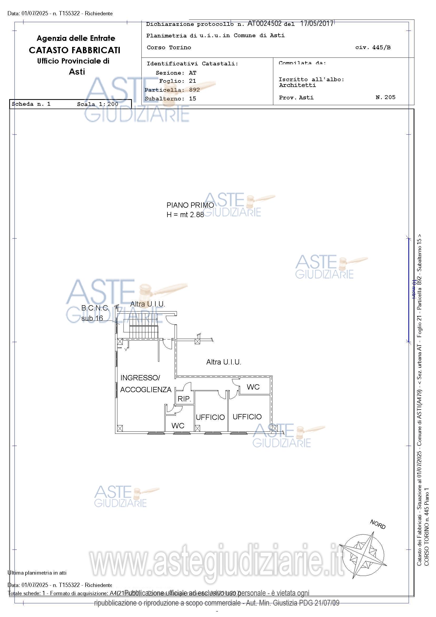 Vendita all'asta Senza incanto, con gara telematica sincrona - LOTTO 4: Piena e perfetta proprietà di una porzione di capannone al piano primo, ubicato nel Corso Torino n. 445 B/C, attualmente con destinazione uffici, composta di una sala riunioni, n. 2 uffici e servizi; Superficie complessiva, metri quadri 103,97 circa. Prezzo base € 88.150,00 (offerta minima € 88.150,00). Data vendita 15/04/2026 ore 12:00. Giudice Dott. Daniele Dagna. Rif. Tribunale di Asti - Nuovo concordato preventivo n. 5/2020