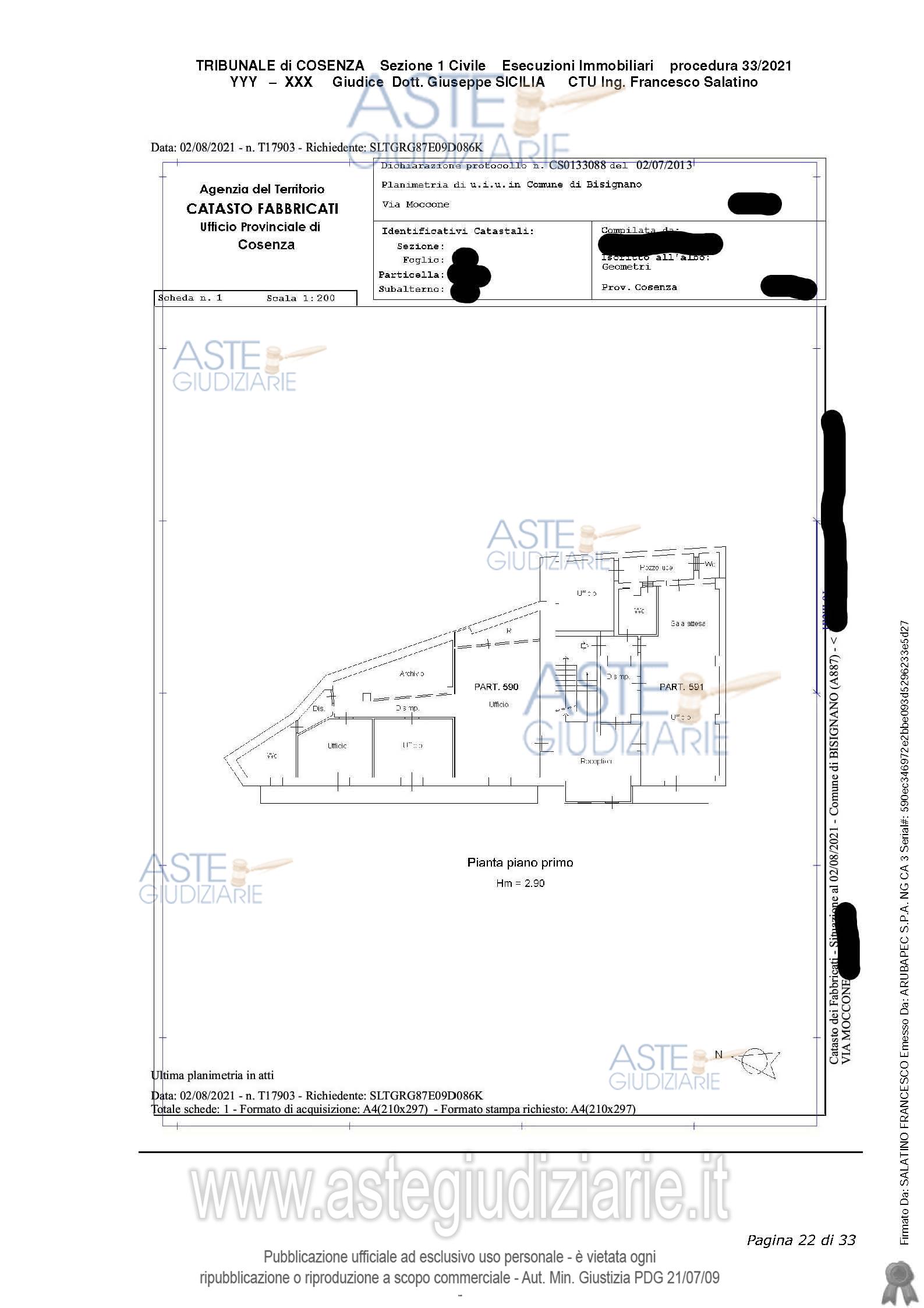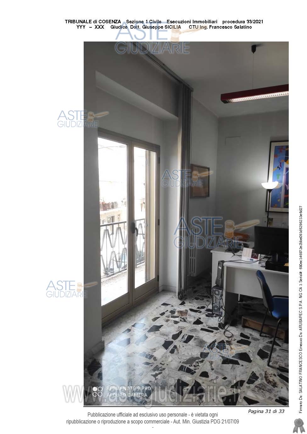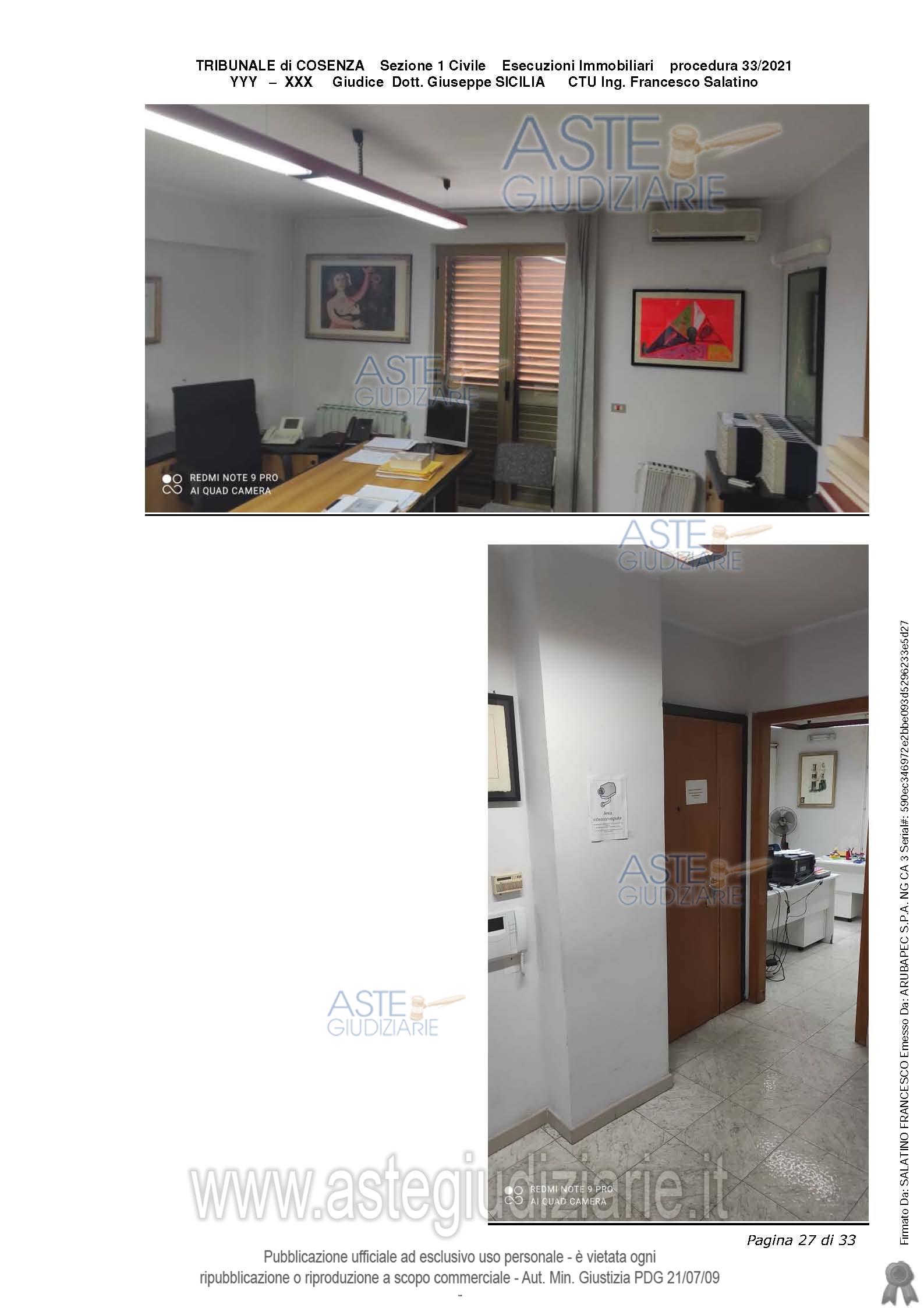 Vendita all'asta Senza incanto, con gara telematica sincrona mista - LOTTO UNICO: Appartamento unico, derivato dall’unione di due appartamenti, avente 10.5 vani, classificato come U ed avente per destinazione ufficio, attualmente adibito a studio notarile. Sup cat. 260 mq. Prezzo base € 96.230,00 (offerta minima € 72.175,00). Data vendita 17/04/2026 ore 09:45. Giudice Dott. Assunta Gioia. Professionista delegato alla vendita Avv. Maria Agovino - Email "mariellaagovino@gmail.com"; Tel. 3355388666. Custode Giudiziario Avv. Maria Agovino - Email "mariellaagovino@gmail.com"; Tel. 3355388666. Rif. Tribunale di Cosenza - Esecuzione immobiliare post legge 80 n. 33/2021