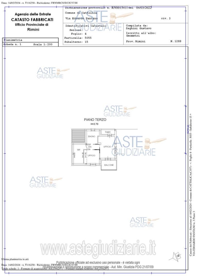 Vendita all'asta Senza incanto, con gara telematica asincrona - LOTTO 1: Piena proprietà di porzioni di condominio sito in Comune di CATTOLICA (RN), Via Edoardo Pantano n.12:- ufficio al piano terzo composto da due locali ad uso ufficio, disimpegno e bagno avente una superficie lorda circa mq 43,28, ripostiglio sottotetto con altezza minore di mt 1,50 superficie lorda di circa mq 14,11, loggia e balcone superficie lorda complessiva di circa mq 9,59, - autorimessa al piano terra superficie lorda circa mq 21,74 con corte esclusiva di pertinenza superficie lorda circa mq 18,58. Prezzo base € 157.000,00 (offerta minima € 117.750,00). Data inizio operazioni di vendita: 27/01/2026 ore 09:00. Giudice Corvetta. Professionista delegato alla vendita Not. Giorgia Dondi - Email "gdondi.2@notariato.it"; Tel. 054129305. Custode Giudiziario Not. Giorgia Dondi - Email "gdondi.2@notariato.it"; Tel. 054129305. Rif. Tribunale di Rimini - Espropriazione immobiliare (cartabia) n. 113/2023