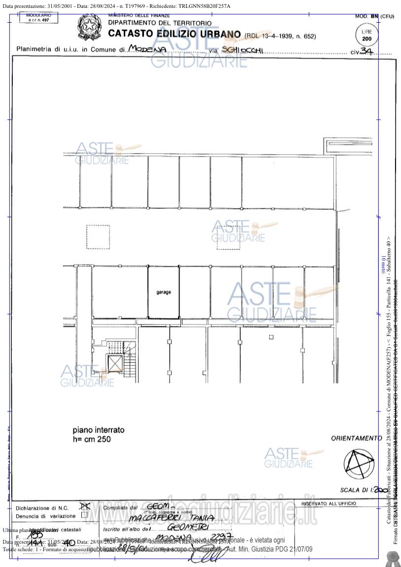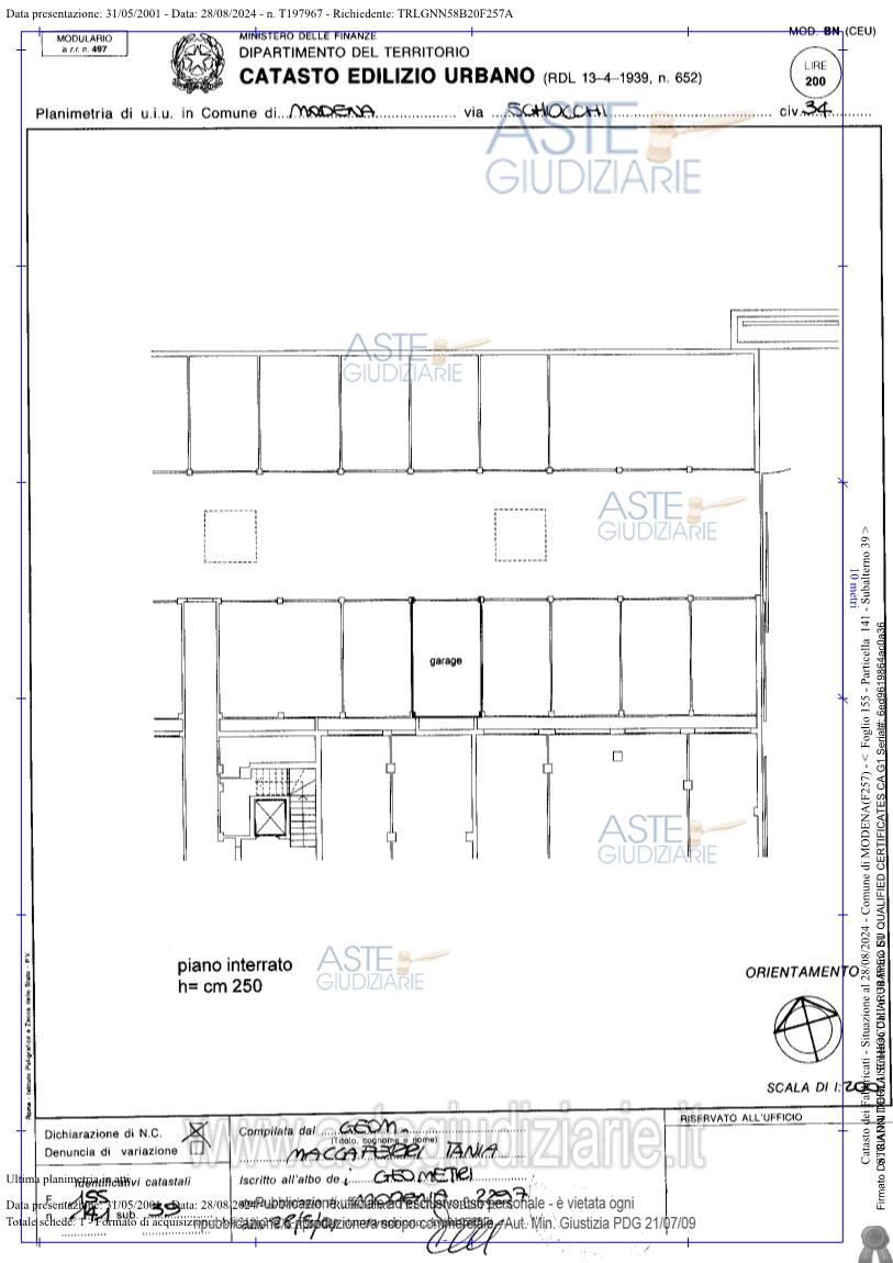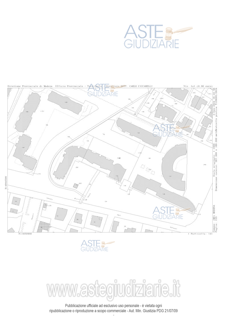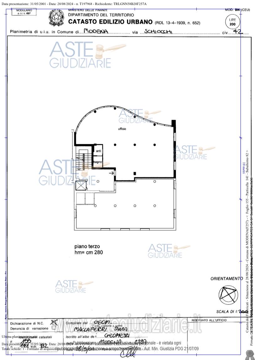 Vendita all'asta Senza incanto, con gara telematica asincrona - LOTTO UNICO: Piena proprietà di porzione di fabbricato ad Uso Ufficio con servizio igienico posto al piano terzo e due autorimesse pertinenziali al piano interrato, sito nel Comune di Modena (MO), Via degli Schiocchi n. 42, occupato da soggetto esecutato da liberarsi al decreto di trasferimento. Prezzo base € 238.000,00 (offerta minima € 178.500,00). Data inizio operazioni di vendita: 18/11/2025 ore 10:30. Professionista delegato alla vendita Avv. Roberto Bonaretti - Email "avv.r.bonaretti@gmail.com"; Tel. 059690086. Custode Giudiziario Alex Manelli - Email "visiteimmobili@ivgmodena.it"; Tel. 059847301. Rif. Tribunale di Modena - Espropriazione immobiliare (cartabia) n. 282/2023