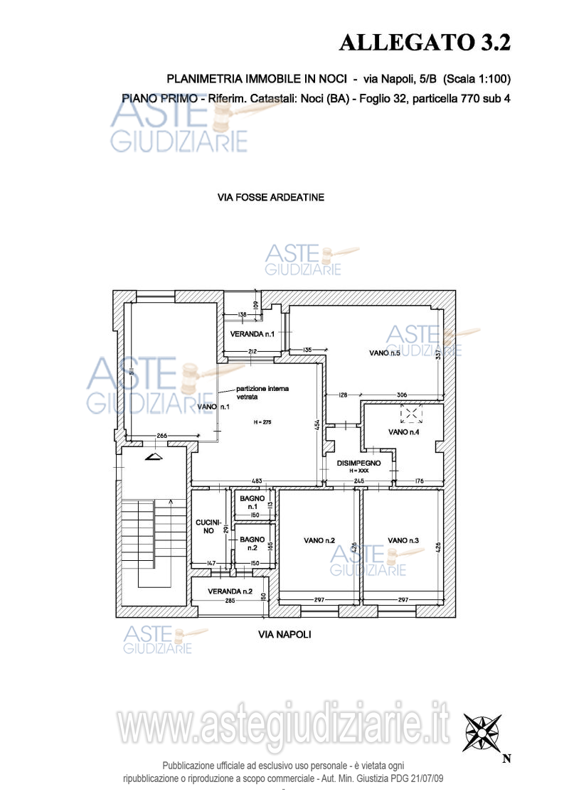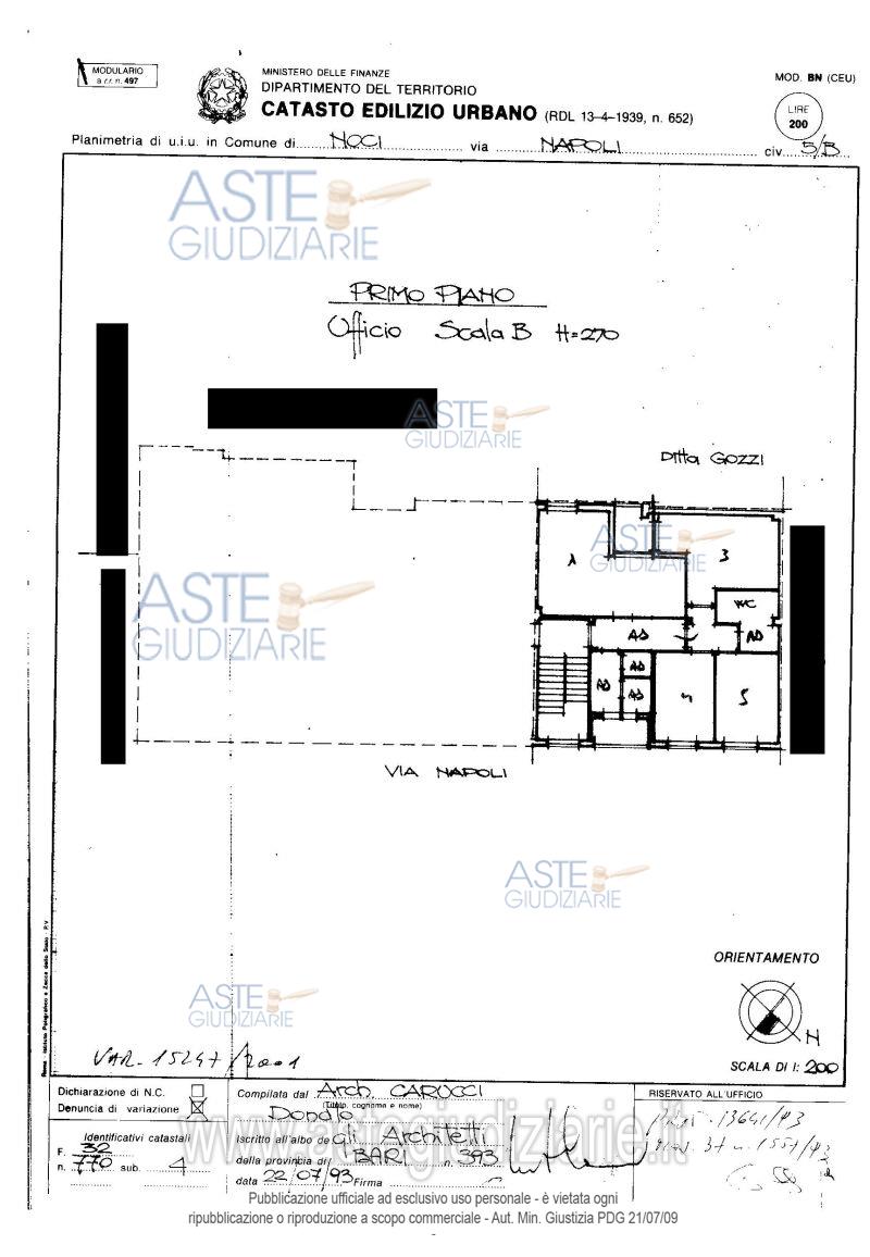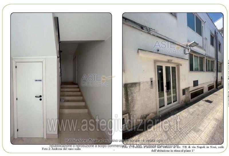 Vendita all'asta Senza incanto, con gara telematica asincrona - LOTTO 55: Full ownership rights of the office space located in Noci (BA) on the first floor, with access from Via Napoli civic number 5/B, consisting of 6 rooms, with a cadastral area of 127 square meters, and part of a condominium building. The property currently consists of: 5 rooms, a hallway, a small kitchen, two bathrooms, and two verandas. Prezzo base € 103.400,00 (offerta minima € 77.550,00). Data inizio operazioni di vendita: 05/05/2026 ore 10:00. Giudice Dott. Giuseppe Marseglia.