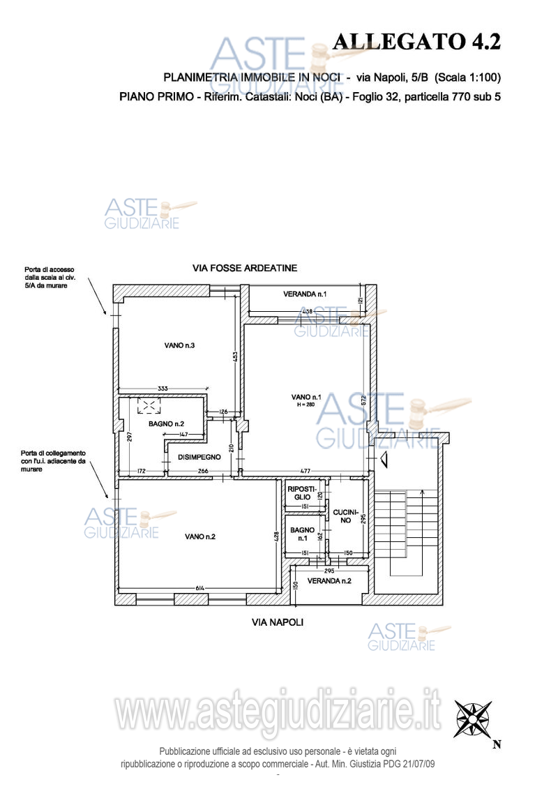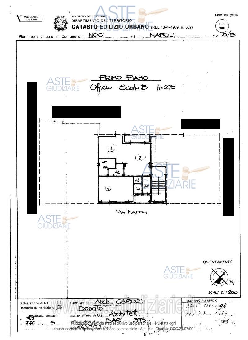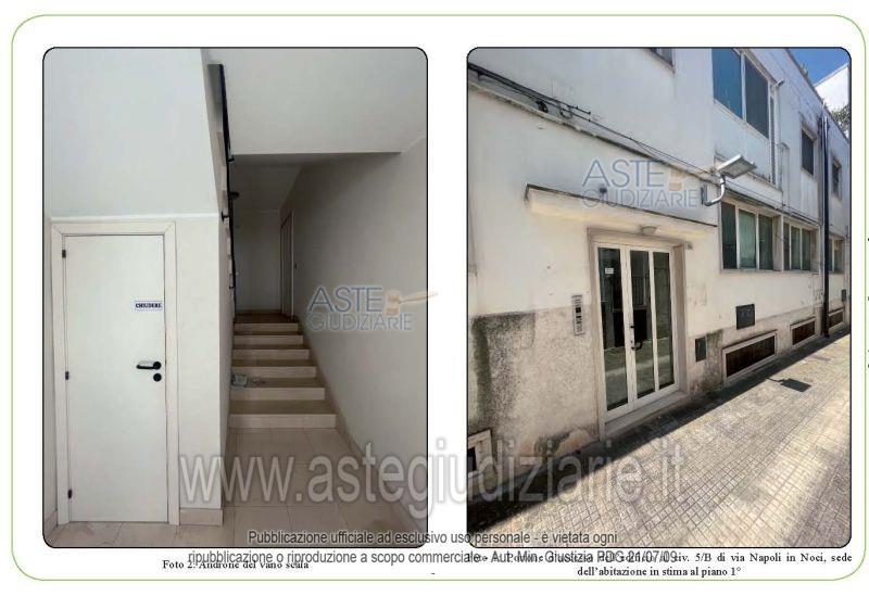 Vendita all'asta Senza incanto, con gara telematica asincrona - LOTTO 56: Full ownership rights of an office space located in Noci (BA), on the first floor, with access from via Napoli civ. 5/B, comprising 5 rooms, with a cadastral area of 103 square meters, part of a condominium building. The current layout of the property includes: three rooms, a small kitchen, two bathrooms, a storage room, a hallway, and two verandas. Prezzo base € 86.900,00 (offerta minima € 65.175,00). Data inizio operazioni di vendita: 05/05/2026 ore 10:00. Giudice Dott. Giuseppe Marseglia.