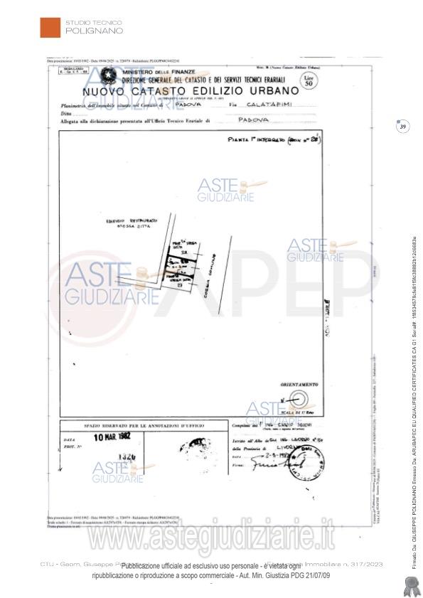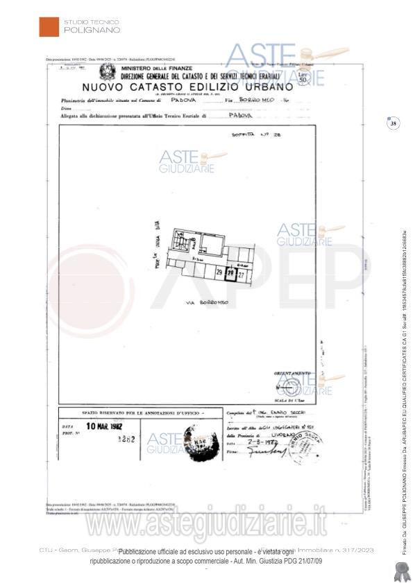 Vendita all'asta Senza incanto, con gara telematica sincrona - LOTTO UNICO: Lotto Unico - piena proprietà di unità immobiliari facenti parte del fabbricato condominiale denominato "Condominio Borromeo", sito in Comune di Padova, Centro Storico, via Dei Borromeo n. 16/B int. 19 (per l'ufficio) e via Calatafimi int. 28 (per il garage) e precisamente trattasi di ufficio al piano secondo composto dalla reception e tre locali ufficio, oltre al wc per mq. 97, una soffitta di mq. 5 al piano quarto e locale autorimessa di mq. 14,50 al piano primo sottostrada. In corso di liberazione. Prezzo base € 233.000,00 (offerta minima € 174.750,00). Data vendita 16/04/2026 ore 10:45. Giudice Amenduni. Professionista delegato alla vendita Not. Alessandro Nazari - Email "aste@apepnotai.it"; Tel. 049651228. Custode Giudiziario Apep - Email "visita@apepnotai.it"; Tel. 049651228. Rif. Tribunale di Padova - Espropriazione immobiliare (cartabia) n. 317/2023