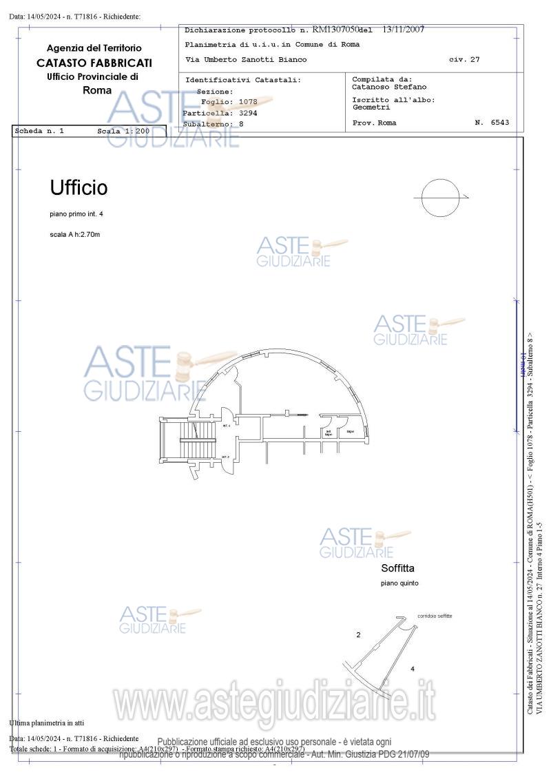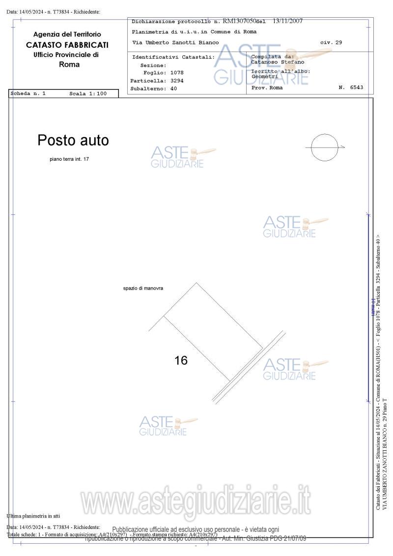 Vendita all'asta Senza incanto, con gara telematica asincrona - LOTTO 4: Quota pari a 1/1 del diritto di proprietà superficiaria sua)Ufficio sito in Roma (RM) - via Umberto Zanotti Bianco 27, piano primo, interno 4, mq. 66 circa, con annessa soffitta, piano 5, interno 3. Identificato al NCEU del Comune di Roma al foglio n. 1078, part. 3294, sub. 8, cat. A10, rendita € 2.566,79. b)posto auto sito in Roma (RM), Via Zanotti Bianco n. 29, piano terra, interno 17. Identificato al NCEU del Comune di Roma al foglio n. 1078, part. 3294, sub. 40, cat. C6, mq 13, rend. € 28,20. Prezzo base € 51.200,00 (offerta minima € 38.400,00). Data inizio operazioni di vendita: 18/12/2025 ore 12:00. Giudice Dott. Romolo Ciufolini. Professionista delegato alla vendita Avv. Valentina Rombola'. Custode Giudiziario Ivg Di Roma Srl - Email "Pvp@visiteivgroma.it"; Tel. 0689569801. Rif. Tribunale di Roma - Espropriazione immobiliare (cartabia) n. 1056/2023