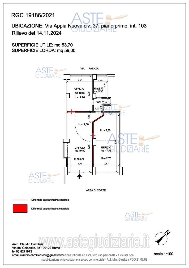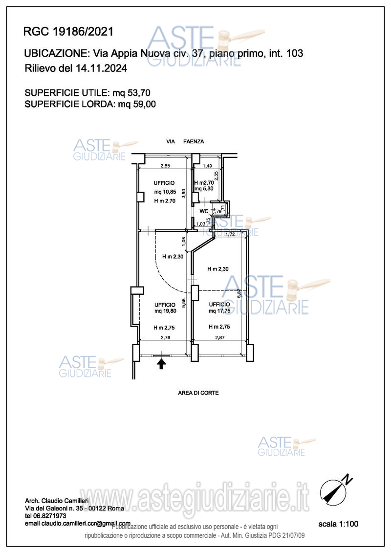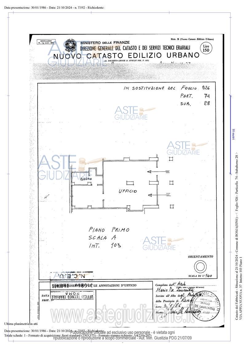 Vendita all'asta Senza incanto, con gara telematica asincrona - LOTTO UNICO: Quota pari al 100/100 del diritto di proprietà su Appartamento ad uso ufficio ubicato a Roma (RM) - Via Appia Nuova 37, interno 103, piano 1, composto da tre stanze e un bagno per complessivi mq. 59 superficie lorda, Categoria A10. Prezzo base € 175.000,00 (offerta minima € 131.250,00). Data inizio operazioni di vendita: 17/11/2025 ore 15:00. Giudice Dott. Miriam Iappelli. Professionista delegato alla vendita Dott. Giovanni Dott. Caravetta. Custode Giudiziario Ivg Di Roma Srl - Email "ivgroma@associazioneivg.legalmail.it"; Cell. 0683751500; Tel. 0683751500. Rif. Tribunale di Roma - Contenzioso civile n. 19186/2021