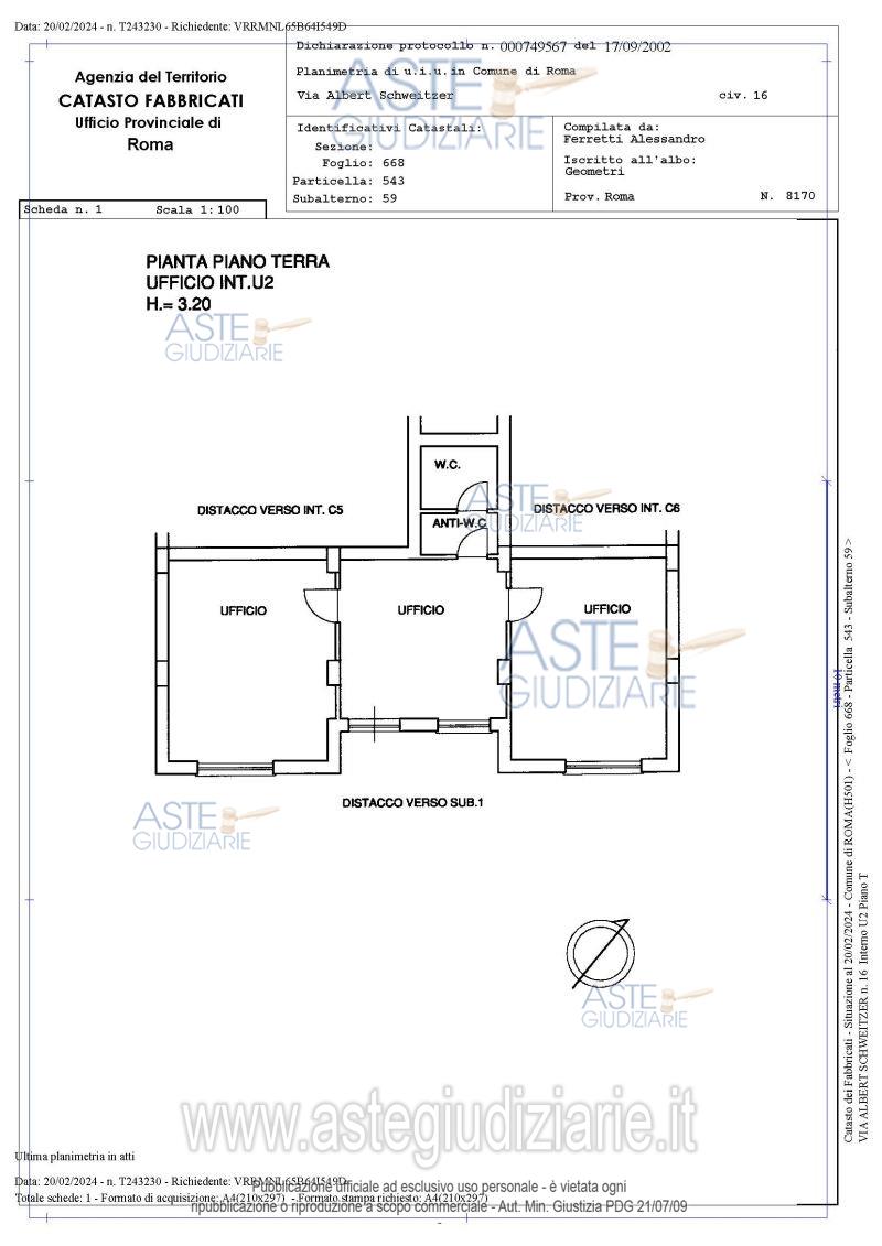 Vendita all'asta Senza incanto, con gara telematica asincrona - LOTTO 5: Quota pari a 1/1 del diritto di superficie su Ufficio ubicato a Roma (RM) - via Albert Schweitzer 16, interno U2, piano terra Identificato al Catasto Fabbricati del Comune di Roma al foglio 668 part 543 sub 59 zc 6 cat A10 cl 2 cons 2,5 vani, sup cast 67 mq RC € 2136,81 piano T.L'ufficio confina con le scale M ed N, oltre al cortile di accesso salvo altri. Prezzo base € 38.792,00 (offerta minima € 29.094,00). Data inizio operazioni di vendita: 26/03/2026 ore 11:00. Giudice Dott. Raffaele Russo. Professionista delegato alla vendita Not. Cesare Felice Giuliani. Custode Giudiziario Ivg Di Roma Srl - Email "pvp@visiteivgroma.it"; Tel. 0689569801. Rif. Tribunale di Roma - Esecuzione immobiliare post legge 80 n. 1090/2022