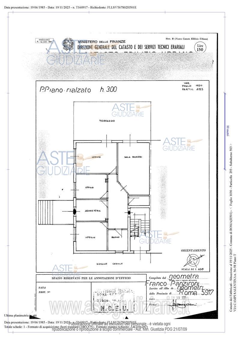 Vendita all'asta Senza incanto, con gara telematica asincrona - LOTTO 7: Quota pari a 1/1 del diritto di proprietà su porzioni di fabbricato sito in Comune di Roma, località Borghesiana, con ingresso da Via Campi Salentina n. 54, 56 e 58, e precisamente:-unità immobiliare a uso ufficio posta al piano T (in planimetria e nello stato dei luoghi piano rialzato), catastalmente composta da: ingresso/segreteria, tre stanze, una sala riunioni, disimpegno, un bagno, ripostiglio e terrazzo-locale a uso garage, con accesso mediante rampa carrabile dal civico n. 60, posto al piano S1. Prezzo base € 225.000,00 (offerta minima € 168.750,00). Data inizio operazioni di vendita: 26/05/2026 ore 14:00. Giudice Scolaro. Professionista delegato alla vendita Avv. Angela Maria Lorena Cordaro. Custode Giudiziario Ivg Di Roma Srl - Email "pvp@visiteivgroma.it"; Tel. 0683751500. Rif. Tribunale di Roma - Esecuzione immobiliare post legge 80 n. 1656/2013