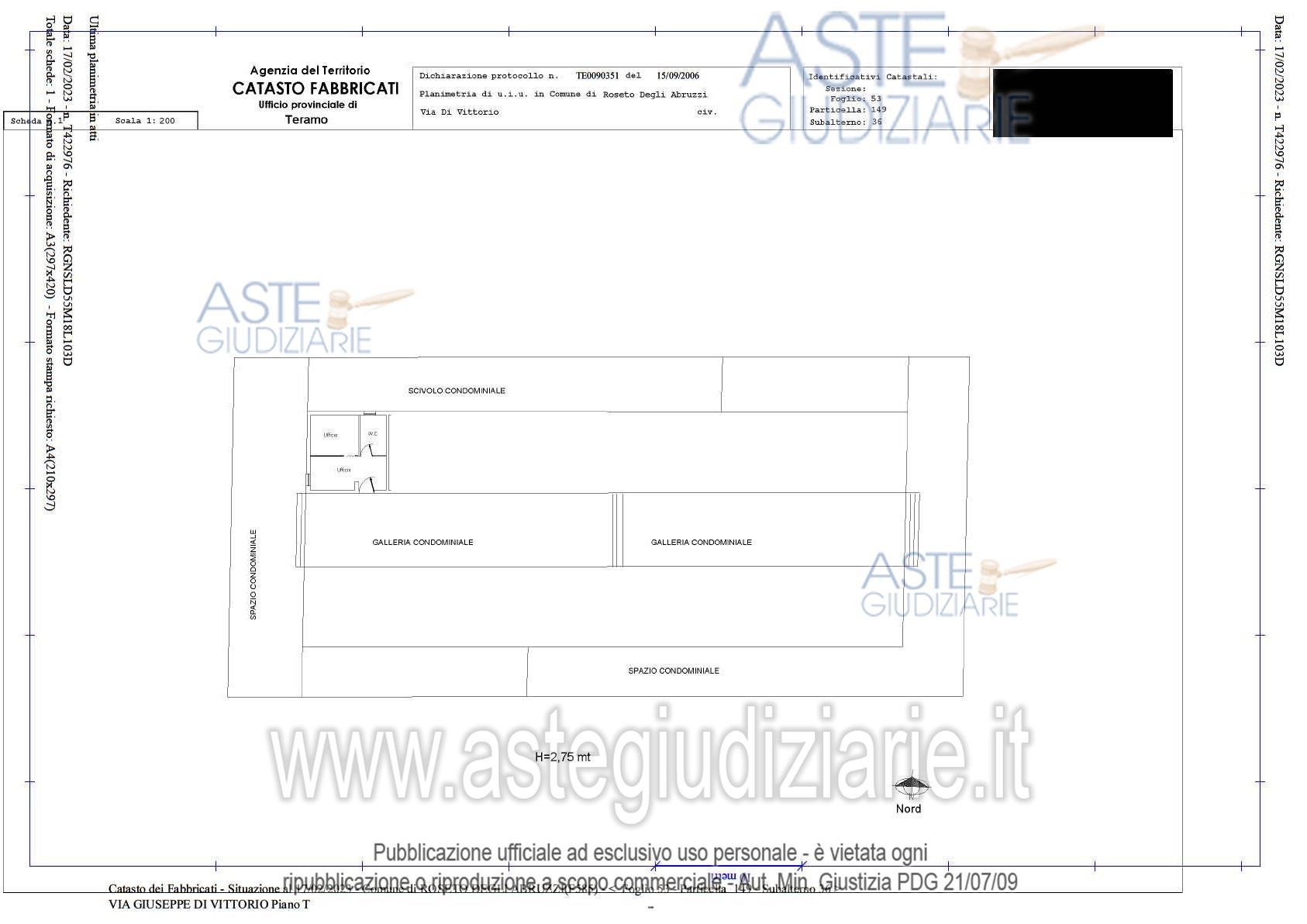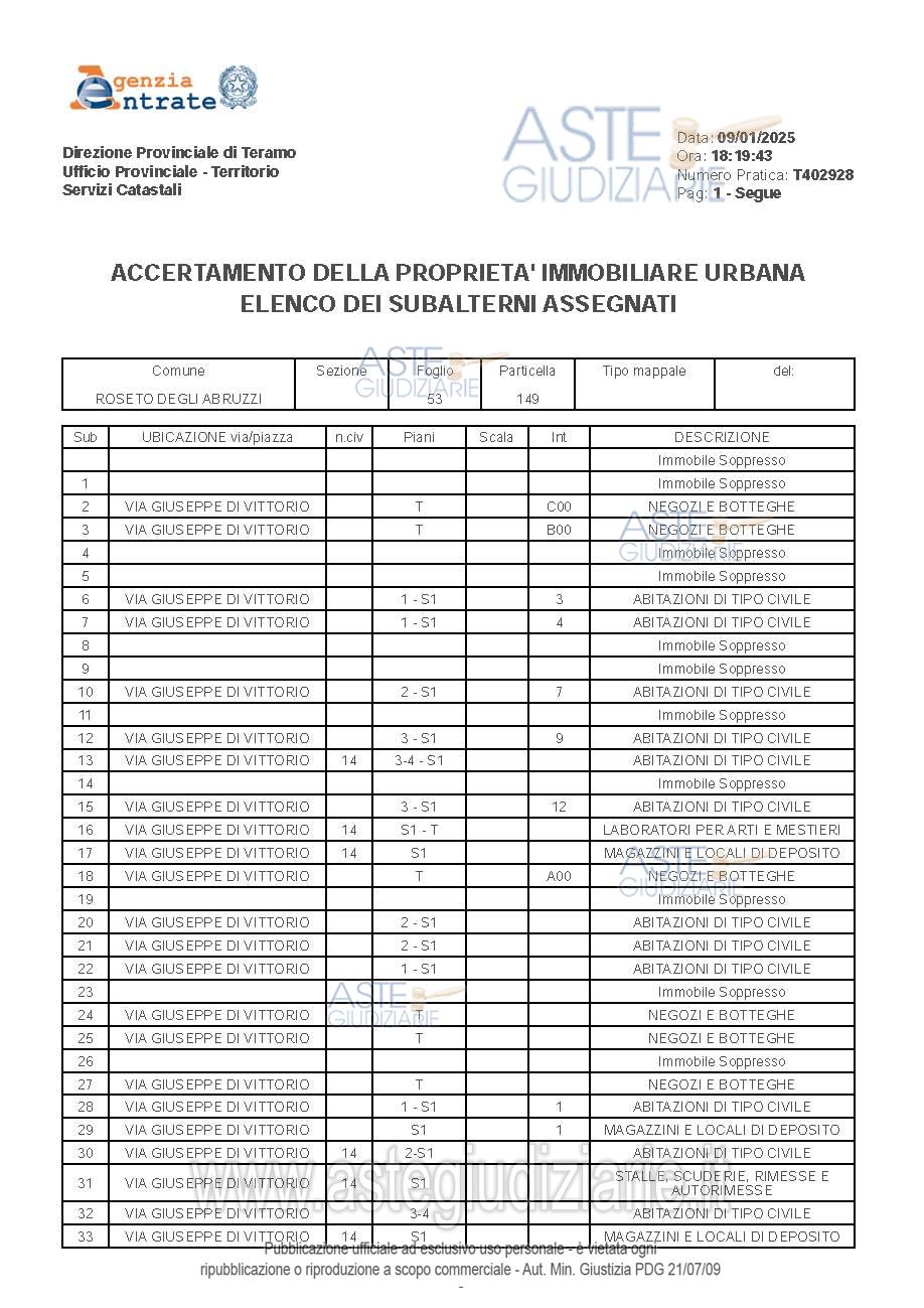 Vendita all'asta Senza incanto, con gara telematica asincrona - LOTTO 24: Diritti pari alla piena proprietà per la quota di 1/1 di Locale ufficio sito in Roseto degli Abruzzi (TE), Via Giuseppe di Vittorio n. 12, piano terra, Foglio 53, p.lla 149, sub. 36, cat. A/10, Classe U, Zona Cens. 2, Rendita € 664,94, superficie convenzionale mq 30,20.L'immobile, inserito in un contesto condominiale, risulta in sufficiente stato conservativo con necessità di interventi su porte interne parzialmente deteriorate, infiltrazioni pregresse di umidità. Prezzo base € 21.500,00 (offerta minima € 21.500,00). Data inizio operazioni di vendita: 22/04/2026 ore 15:30. Giudice Flavio Conciatori. Custode Giudiziario Geom. Osvaldo Reginelli - Email "info@reginelliandpartners.com"; Tel. 0861587190. Curatore Avv. Caterina Crescenzo - Email "caterina.crescenzo@gmail.com"; Cell. 3485840594; Tel. 0861416166. Rif. Tribunale di Teramo - Fallimentare (nuovo rito) n. 39/2022