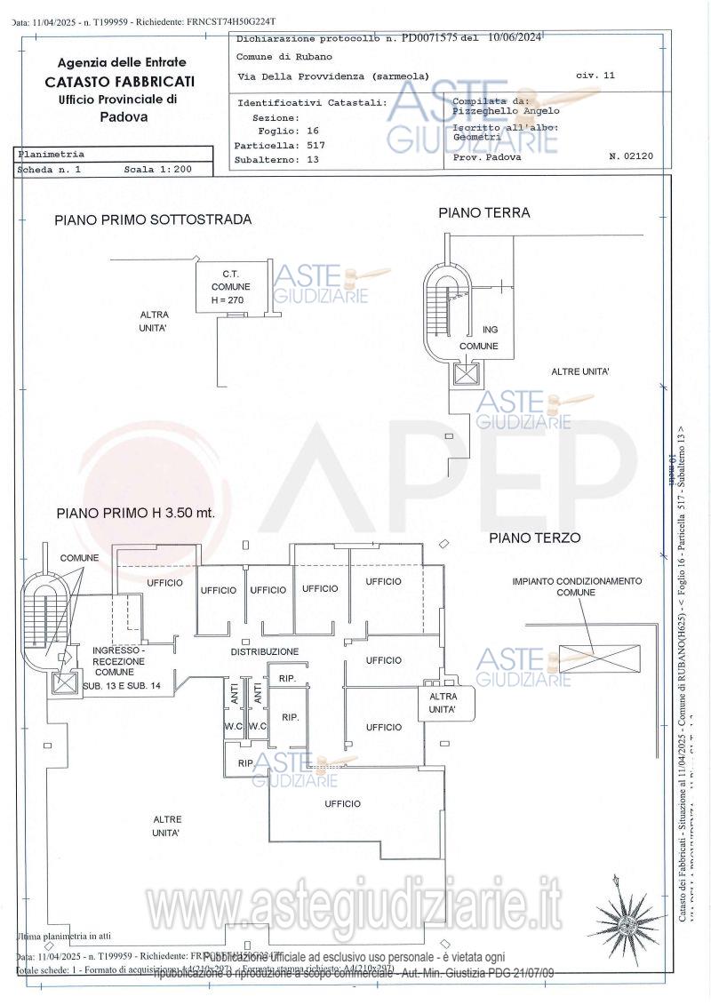 Vendita all'asta Senza incanto, con gara telematica sincrona - LOTTO 5: Lotto 5 - piena proprietà di unità immobiliare ad uso direzionale, facente parte del fabbricato condominiale sito in Comune di Rubano (PD), località Sarmeola, via Della Provvidenza con ingresso dai civici nn. 13 e 15 e precisamente consiste in un ufficio al piano primo (altezza interna mt. 3,50 - risultano presenti dei controsoffitti), suddiviso in vari locali mediante pareti mobili attrezzate, due W.C. con antibagno e tre ripostigli, per una superficie commerciale di mq. 251. Occupato con titolo. Prezzo base € 211.000,00 (offerta minima € 158.250,00). Data vendita 21/04/2026 ore 11:30. Giudice Rossi. Professionista delegato alla vendita Not. Michelangelo Casciano - Email "aste@apepnotai.it"; Tel. 049651228. Custode Giudiziario Apep - Email "visita@apepnotai.it"; Tel. 049651228. Rif. Tribunale di Padova - Espropriazione immobiliare (cartabia) n. 36/2025