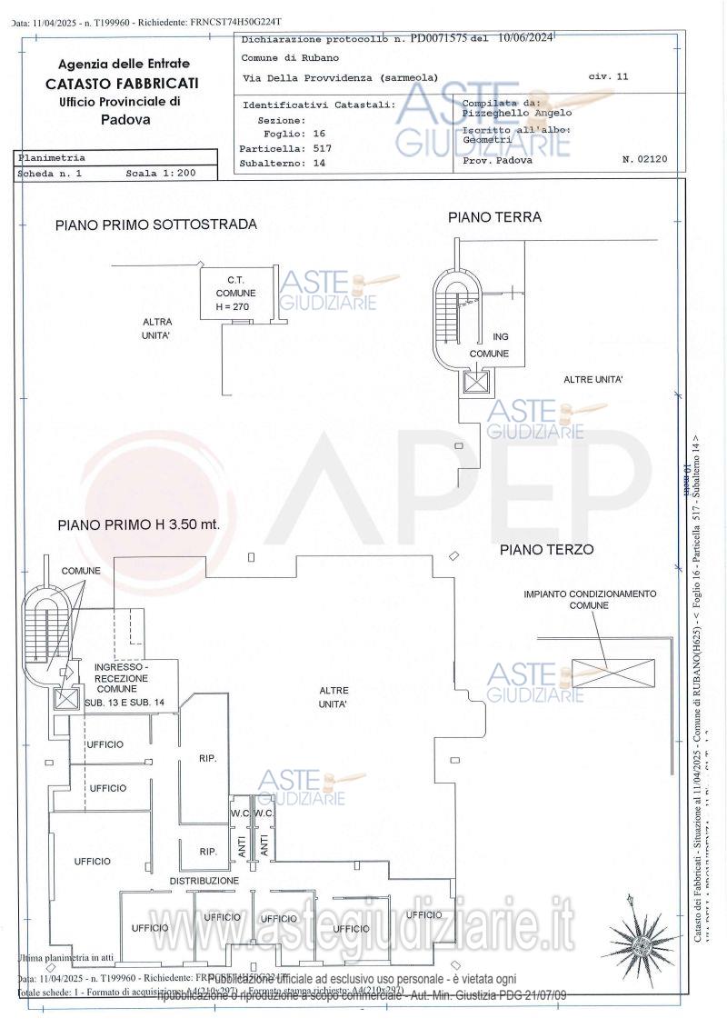 Vendita all'asta Senza incanto, con gara telematica sincrona - LOTTO 6: Lotto 6 - piena proprietà di unità immobiliare ad uso direzionale, facente parte del fabbricato condominiale sito in Comune di Rubano (PD), località Sarmeola, via Della Provvidenza con ingresso dai civici nn. 13 e 15 e precisamente consiste in un ufficio al piano primo (altezza interna mt. 3,30 - risultano presenti dei controsoffitti), suddiviso in vari locali mediante pareti mobili attrezzate, due W.C. con antibagno e due ripostigli, per una superficie commerciale di mq. 232. Occupato con titolo. Prezzo base € 195.600,00 (offerta minima € 146.700,00). Data vendita 21/04/2026 ore 12:00. Giudice Rossi. Professionista delegato alla vendita Not. Michelangelo Casciano - Email "aste@apepnotai.it"; Tel. 049651228. Custode Giudiziario Apep - Email "visita@apepnotai.it"; Tel. 049651228. Rif. Tribunale di Padova - Espropriazione immobiliare (cartabia) n. 36/2025