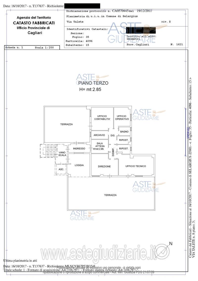 Vendita all'asta Senza incanto, con gara telematica asincrona - LOTTO 6: Intera Proprietà - Unità immobiliare sita in Comune di Selargius (CA) Via Talete, censita al N.C.E.U. al fg 35 mappale 4096 sub 15, cat. A/10, classe 4, vani 7,5, R.C. Euro 1.565,74; è ubicato al piano terzo del maggior fabbricato. L’immobile nel progetto ha destinazione quale ufficio. Si sviluppa su una superficie lorda di mq 197,00 di cui mq 71,00 abusivi non sanabili (netta mq 152,05, di cui 49,00 abusivi non sanabili), due terrazze della superficie complessiva di 188,30 mq. Prezzo base € 115.668,00 (offerta minima € 86.751,00). Data inizio operazioni di vendita: 13/01/2026 ore 16:00. Giudice Dott. Silvia Cocco. Professionista delegato alla vendita Avv. Marco Di Fortunato - Cell. 3356185295. Custode Giudiziario Ivg Di Cagliari - Email "ivg.visiteimmobili@tiscali.it"; Tel. 0702299036. Rif. Tribunale di Cagliari - Esecuzione immobiliare post legge 80 n. 266/2015