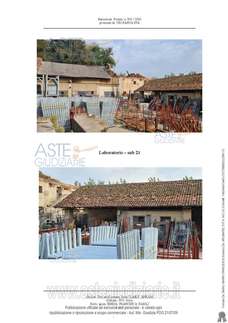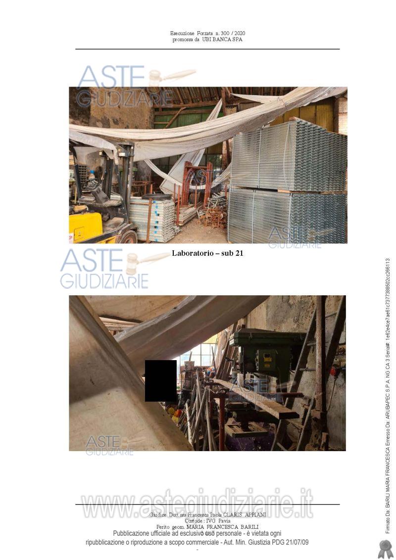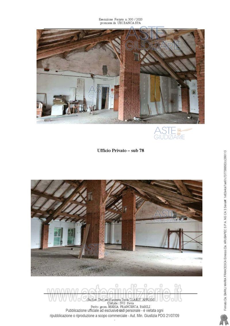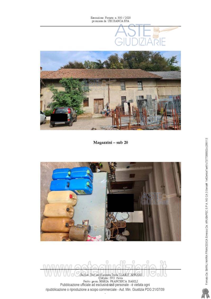 Vendita all'asta Senza incanto, con gara telematica asincrona - LOTTO UNICO: magazzini e locali di deposito (sub 20), che presentano pavimenti in battuto di cemento, pareti verticali intonacate, serramenti in legno con vetri semplici e inferriate, porte in ferro, non sono presenti impianti. Laboratori. Unità collabente. Ufficio privato. Prezzo base € 45.703,00 (offerta minima € 34.278,00). Data inizio operazioni di vendita: 14/01/2026 ore 09:30. Giudice Francesca Paola Claris Appiani. Professionista delegato alla vendita Dott. Patrizia Galati - Email "p.galati@associatigriffini.it"; Tel. 0382539824. Custode Giudiziario Istituto Vendite Giudiziarie Pavia - Email "immobiliare@ivgpavialodi.it"; Tel. 0382539013. Rif. Tribunale di Pavia - Esecuzione immobiliare post legge 80 n. 300/2020