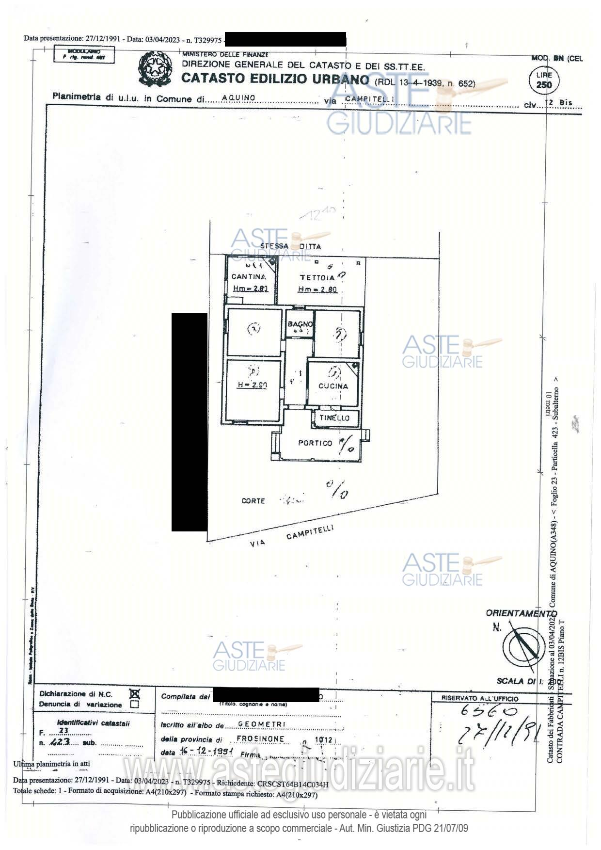 Vendita in attesa dell'emissione del nuovo bando d'asta. LOTTO UNICO: piena propr. (1/1) di appartamento a piano terra (bene1) + terreno (bene2) siti in Aquino (FR), contrada Campitelli, 12bis. Appartamento (bene 1): in CF, fg 23, part. 423, cat. A2 – sup.: 115,45 m². Composizione: ingresso-disimpegno centrale, cucina con camino e piccolo tinello, soggiorno, 2 camere da letto ed 1 bagnetto. Terreno (bene 2): seminativo, cl. 3, 544 m², pertinenza del bene 1. In CT, fg 23, part. 148. I Beni ricadono nel Vincolo Paesistico PTPR 38B "protezione delle aree boscate" art. 39 NTA. Ultimo prezzo base € 20.000,00 (offerta minima € 15.000,00). Professionista delegato alla vendita Avv. Christian Franchitti - Email "christianfranchitti@yahoo.it"; Tel. 07761770393. Custode Giudiziario Avv. Christian Franchitti - Email "christianfranchitti@yahoo.it"; Tel. 07761770393. Rif. Tribunale di Cassino - Esecuzione immobiliare post legge 80 n. 109/2020