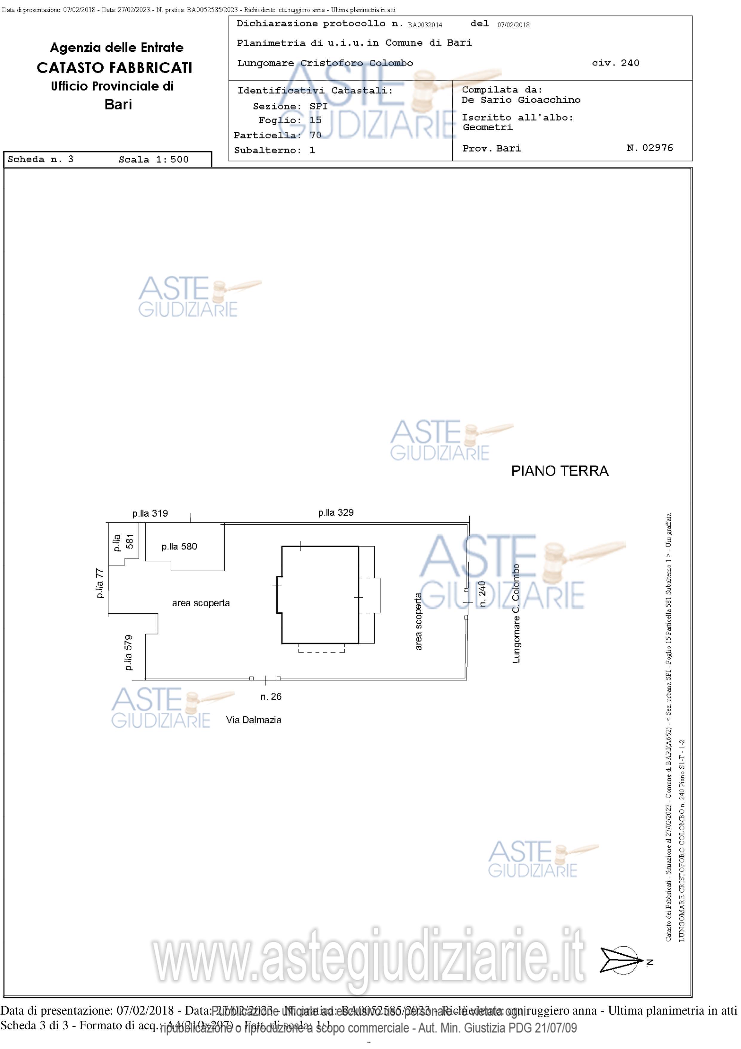 Vendita all'asta Senza incanto, con gara telematica asincrona - LOTTO UNICO: Casa di abitazione su più livelli (villa) sita in Bari – Quartiere Santo Spirito, composta da piano seminterrato, un piano terra composto da ampio soggiorno, ampia zona adibita a cucina-pranzo e ampio bagno con vasca idromassaggio, oltre ad un vano scala nonché vano ascensore a servizio del primo e del secondo piano. Il primo piano presenta tre vani ed accessori (n. 2 bagni, ripostiglio e disimpegno). Sussiste anche un lastrico sovrastante con vano lavanderia ed il circostante giardino recintato. Prezzo base € 704.590,00 (offerta minima € 528.442,50). Data inizio operazioni di vendita: 22/05/2026 ore 16:00. Giudice Dott. Antonio Ruffino. Professionista delegato alla vendita Avv. Giuseppe Vulpis - Email "avvocatovulpis@gmail.com". Custode Giudiziario Avv. Giuseppe Vulpis - Email "avvocatovulpis@gmail.com". Rif. Tribunale di Bari - Esecuzione immobiliare post legge 80 n. 405/2022