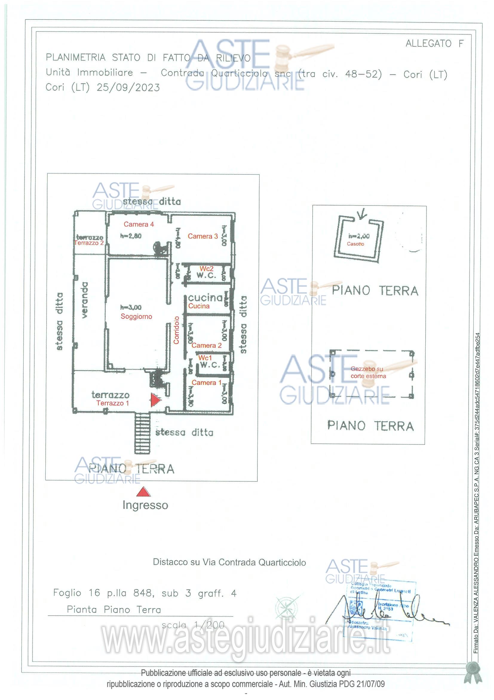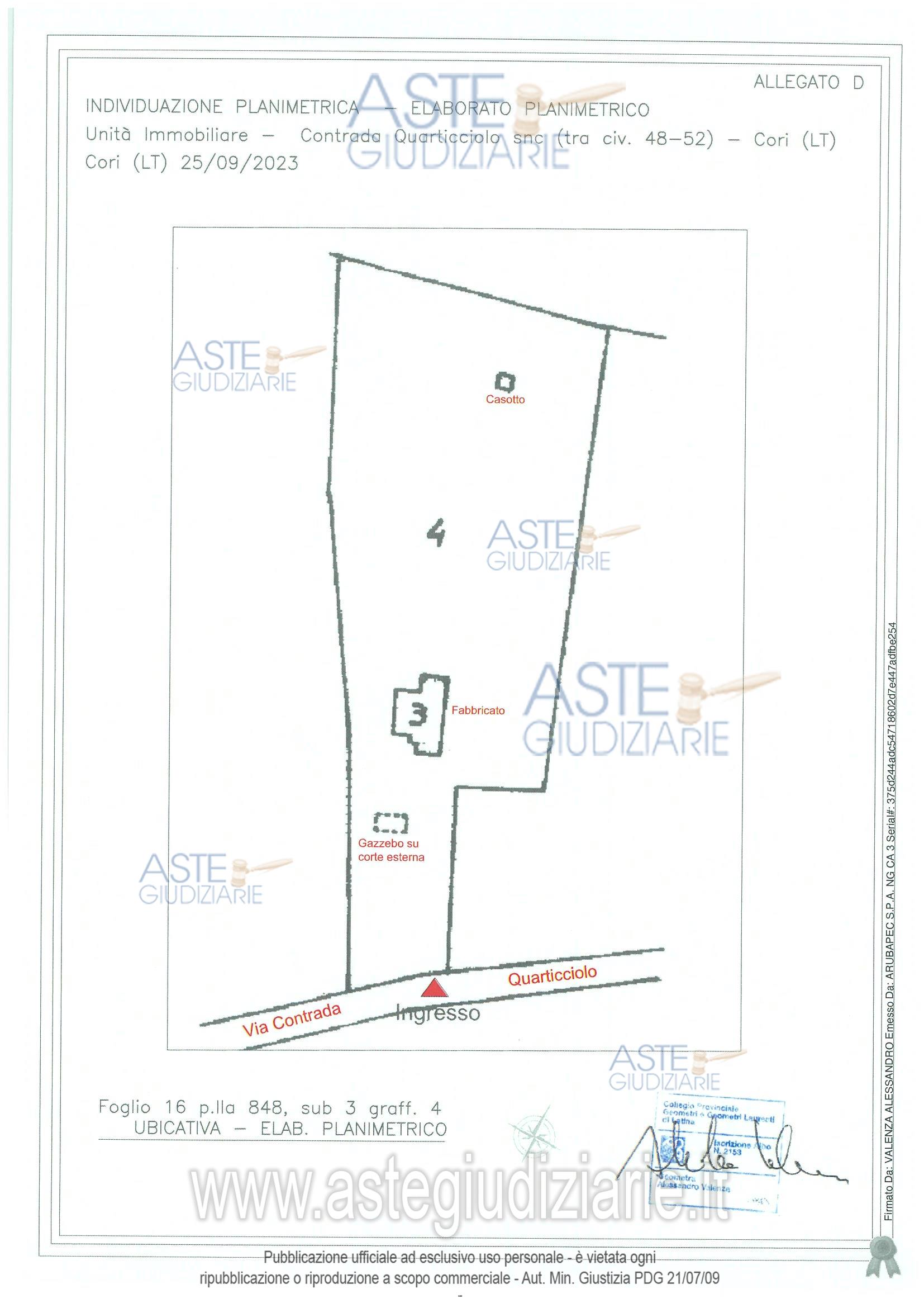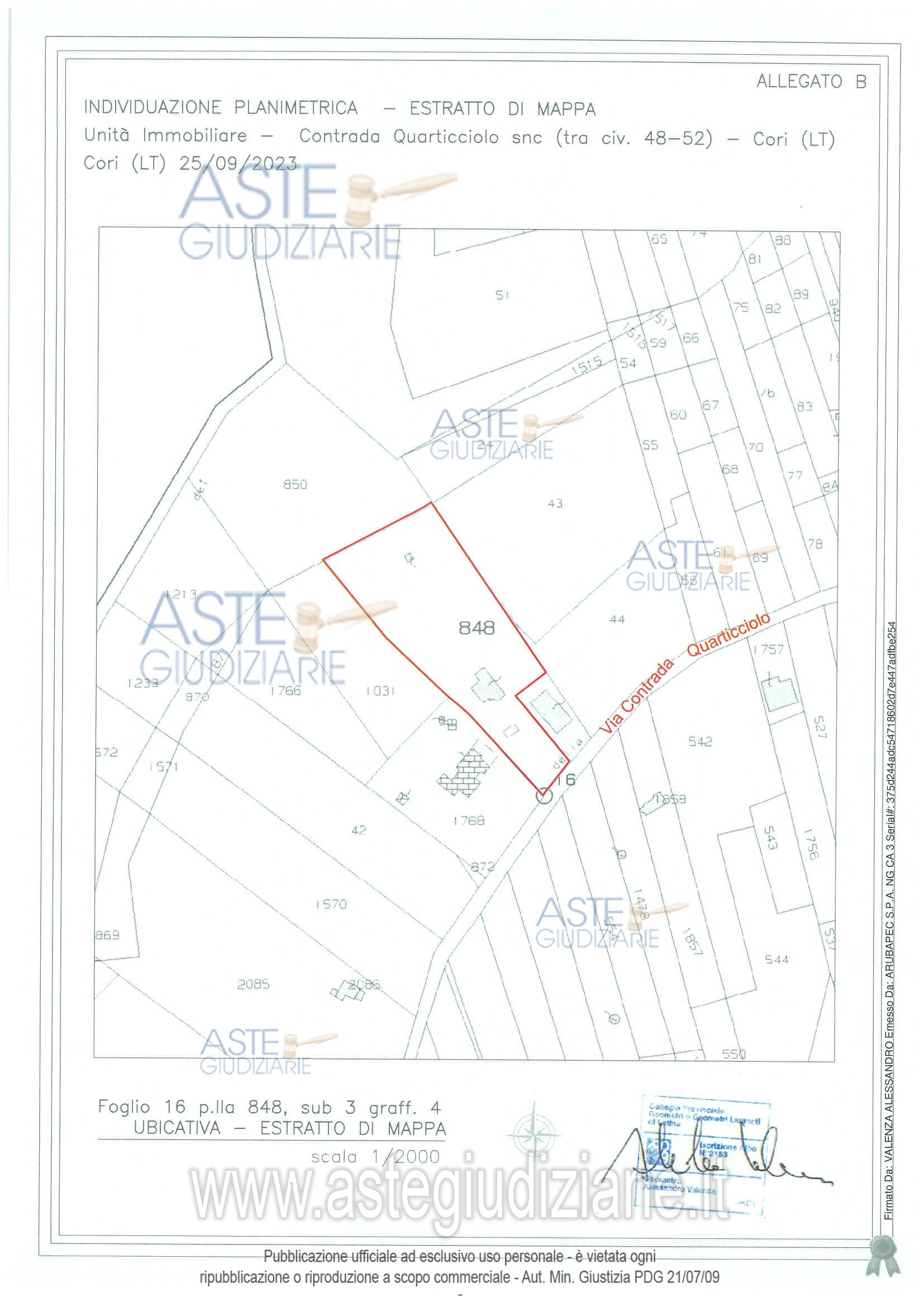 Vendita all'asta Senza incanto, con gara telematica asincrona - LOTTO UNICO: bene 1-Villetta ubicata a Cori (LT) - Contrada Quartacciolo snc, piano S1 - T - 1; bene 2-Terreno ubicato a Cori (LT) - Contrada Quarticciolo snc, piano Terra; bene 3-Bosco ceduo ubicato a Cori (LT) - Contrada Quarticciolo snc, piano Terra; bene 4-Bosco ceduo ubicato a Cori (LT) - Contrada Quarticciolo snc, piano Terra. Prezzo base € 101.629,69 (offerta minima € 76.222,27). Data inizio operazioni di vendita: 24/03/2026 ore 15:00. Professionista delegato alla vendita Avv. Vincenzo Coluccio - Email "colucciovincenzo@tiscali.it"; Cell. 3394755613; Tel. 0773486467. Custode Giudiziario Avv. Vincenzo Coluccio - Email "colucciovincenzo@tiscali.it"; Cell. 3394755613; Tel. 0773486467. Rif. Tribunale di Latina - Esecuzione immobiliare post legge 80 n. 190/2022