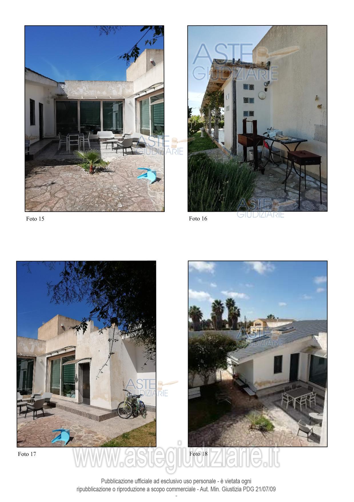 Vendita all'asta Senza incanto, con gara telematica asincrona - LOTTO 1: Villetta destinata a civile abitazione, costituita da un salotto con angolo cottura, una camera daletto, un bagno lavanderia due ripostigli ed un locale tecnico al piano seminterrato; da unacucina, salotto, due bagni, tre camere da letto ed un ripostiglio al piano terra; da una stanza alprimo piano, con giardino pertinenziale avente superficie di circa 2.560 mq. ad uso esclusivonel quale sono presenti una piscina e delle piccole costruzioni dedicate alla cura del giardino eal ricovero di an. Prezzo base € 791.600,00 (offerta minima € 593.700,00). Data inizio operazioni di vendita: 14/04/2026 ore 16:30. Giudice Filippetta Signorello. Professionista delegato alla vendita Avv. Vito Darienzo. Custode Giudiziario Avv. Vito Darienzo - Email "vito.darienzo70@gmail.com"; Cell. 3471935106. Rif. Tribunale di Marsala - Volontaria giurisdizione n. 602/2025