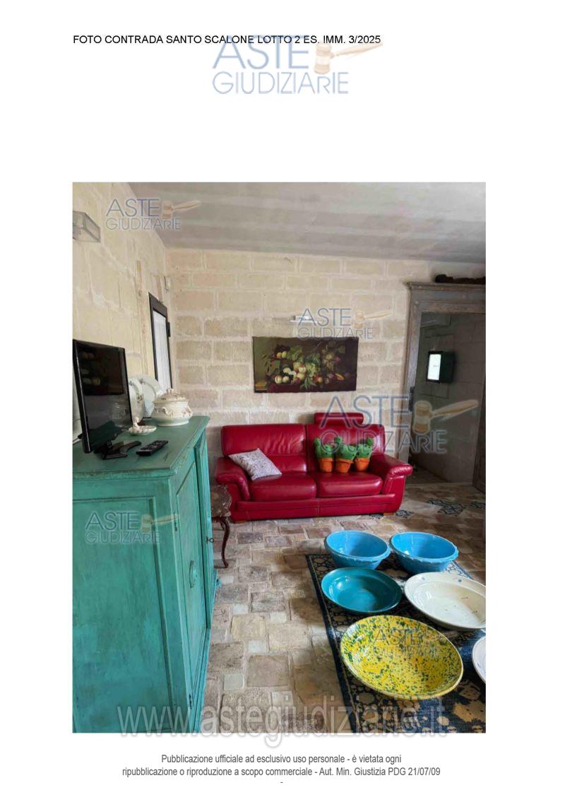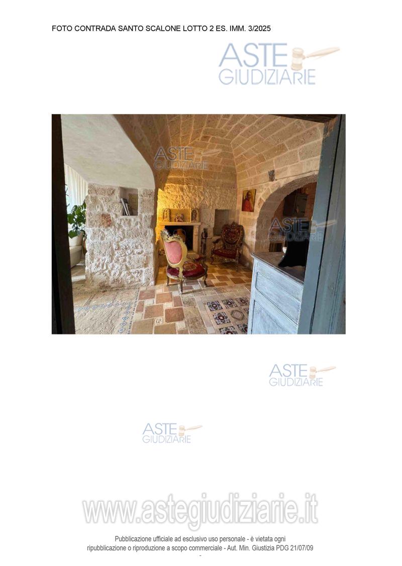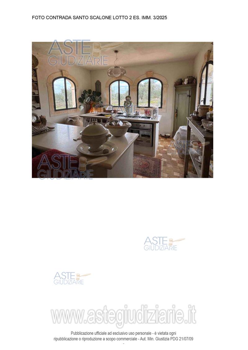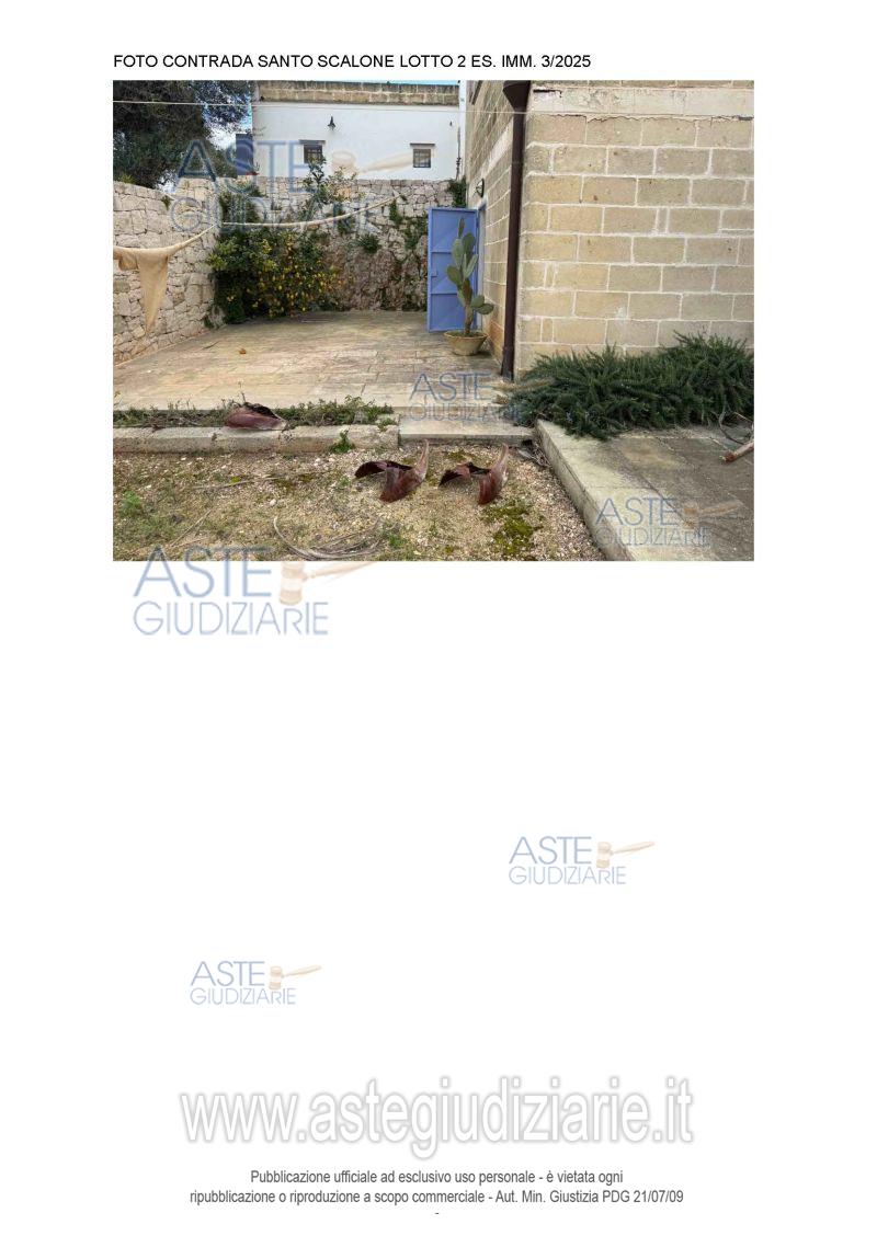 Vendita all'asta Senza incanto, con gara telematica asincrona - LOTTO 02: Villa singola a Ostuni Contrada Santo Scalone, della superficie commerciale di 449,88 mq per la quota di 100/100 di piena proprietà L’immobile, ubicato in agro di Ostuni, alla Contrada "Santo Scalone" dista circa km 5,00 dal centro di Ostuni, si sviluppa al piano terra con ampio giardino e grande piscina di pertinenza. L'unità immobiliare oggetto di vendita è posta al piano Terra, ha un'altezza interna di 3,00 ml. Identificazione catastale in perizia. Prezzo base € 487.702,80 (offerta minima € 365.777,10). Data inizio operazioni di vendita: 25/05/2026 ore 10:50. Professionista delegato alla vendita Avv. Anna De Nitto - Email "annadenitto@libero.it"; Cell. 3497415144. Custode Giudiziario Avv. Anna De Nitto - Email "annadenitto@libero.it"; Cell. 3497415144. Rif. Tribunale di Brindisi - Espropriazione immobiliare (cartabia) n. 3/2025
