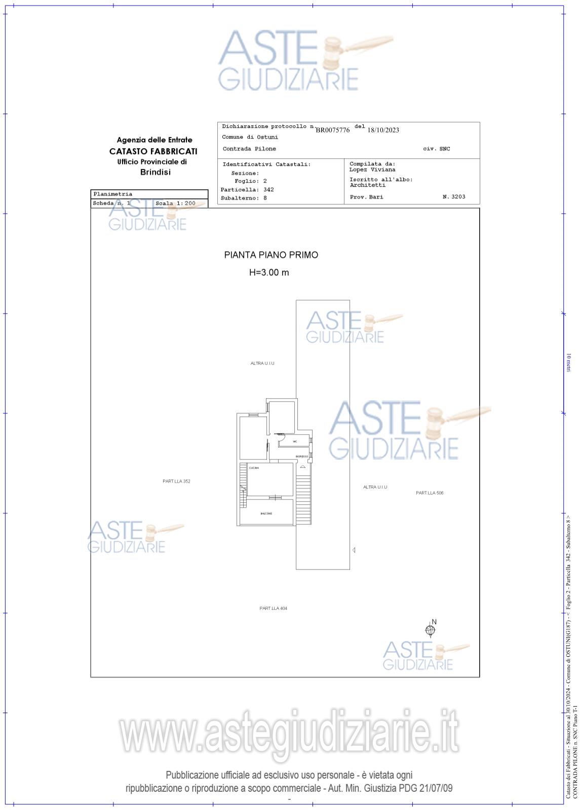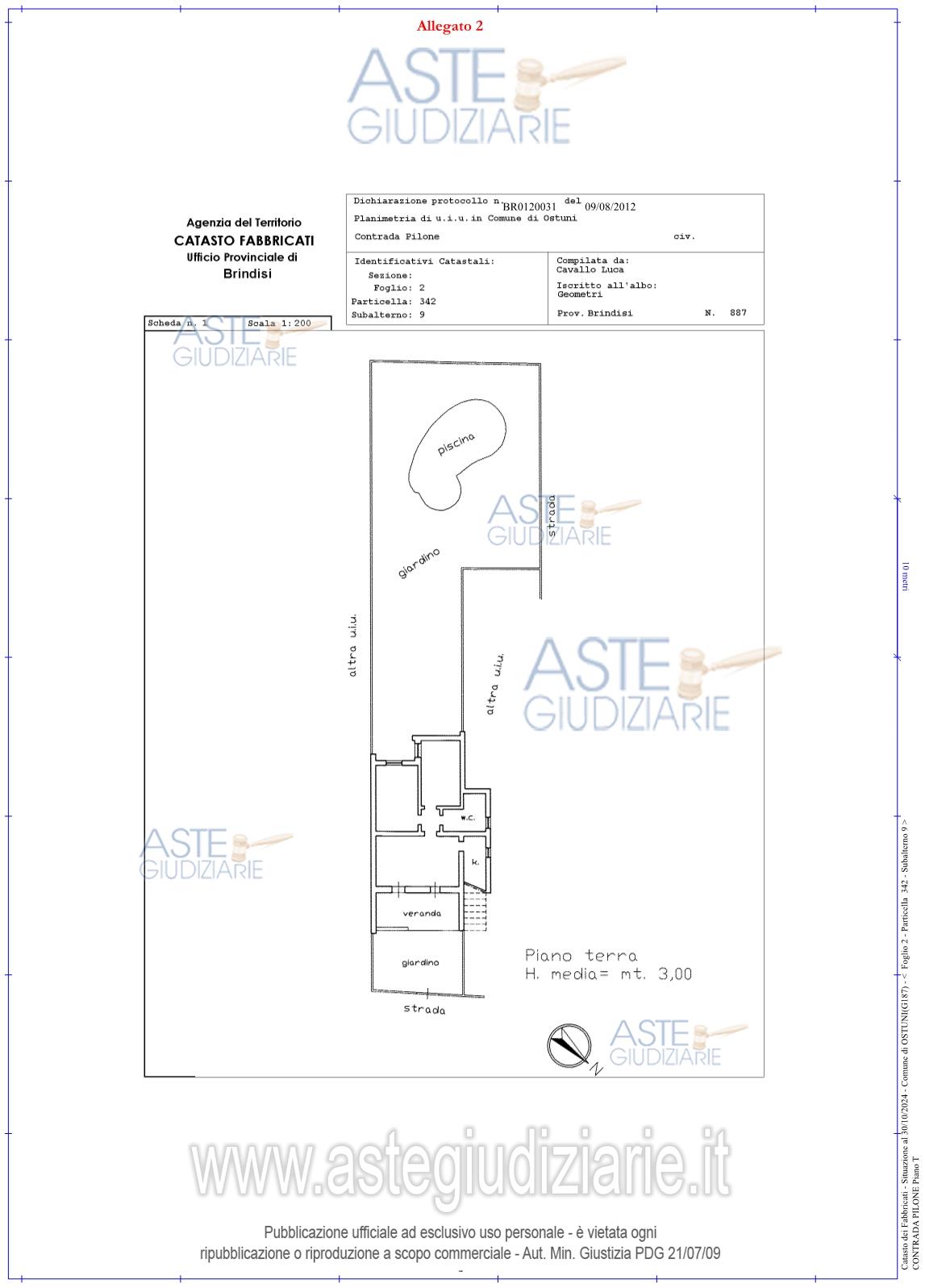Vendita all'asta Senza incanto, con gara telematica asincrona - LOTTO UNICO: Piena proprietà di immobile sito in Ostuni (Brindisi), Contrada Pilone.a) Immobile in Ostuni, via del Boschetto, 2, piano terra;b) Immobile in Ostuni, via del Poggio n°19, piano primo.L’immobile in oggetto, della superficie commerciale di 241,23 m2, risulta costituito da due piani fuori terra. Si accede da un cancello principale e da un cancello pedonale ubicati su via del Poggio. Il perimetro dell’intero lotto è recintato. Prezzo base € 379.334,18 (offerta minima € 284.500,64). Data inizio operazioni di vendita: 27/04/2026 ore 10:10. Professionista delegato alla vendita Dott. Brandi - Email "VINCENZOBRANDI@TIN.IT". Custode Giudiziario Dott. Brandi - Email "VINCENZOBRANDI@TIN.IT". Rif. Tribunale di Brindisi - Espropriazione immobiliare (cartabia) n. 99/2024