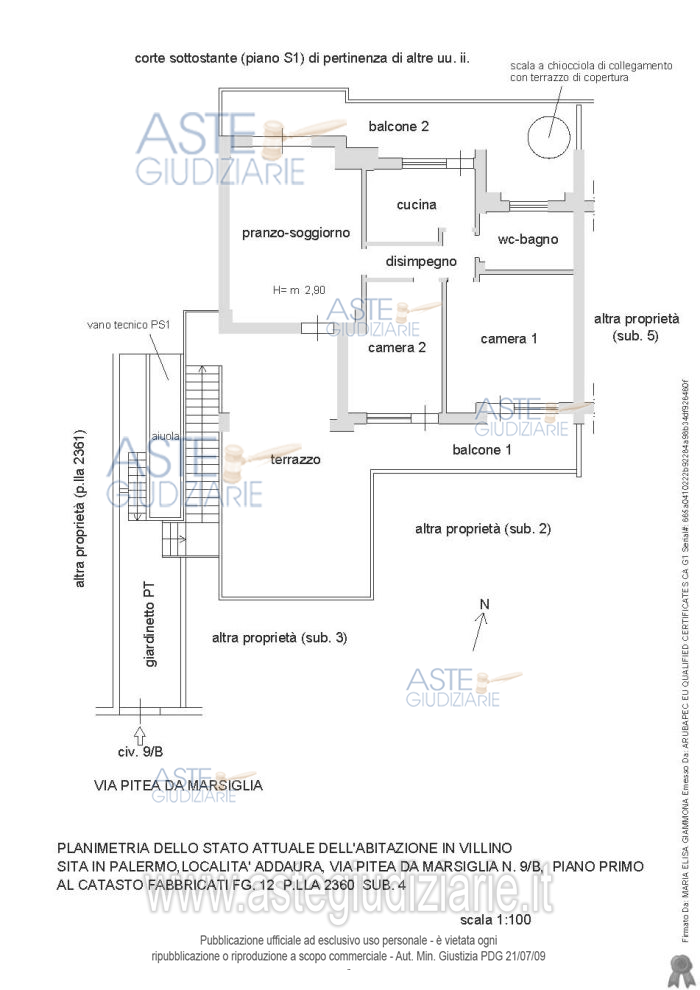 Vendita all'asta Senza incanto, con gara telematica sincrona mista - LOTTO 2: abitazione in villino sito in Palermo (Pa), località Addaura, Via Pitea da Marsiglia n. 9/B, piano primo. Prezzo base € 170.000,00 (offerta minima € 127.500,00). Data vendita 21/05/2026 ore 09:00. Professionista delegato alla vendita Avv. Davide Garretto - Email "avv.garretto.aste@virgilio.it". Custode Giudiziario Avv. Davide Garretto - Email "avv.garretto.aste@virgilio.it". Rif. Tribunale di Palermo - Esecuzione immobiliare post legge 80 n. 88/2021
