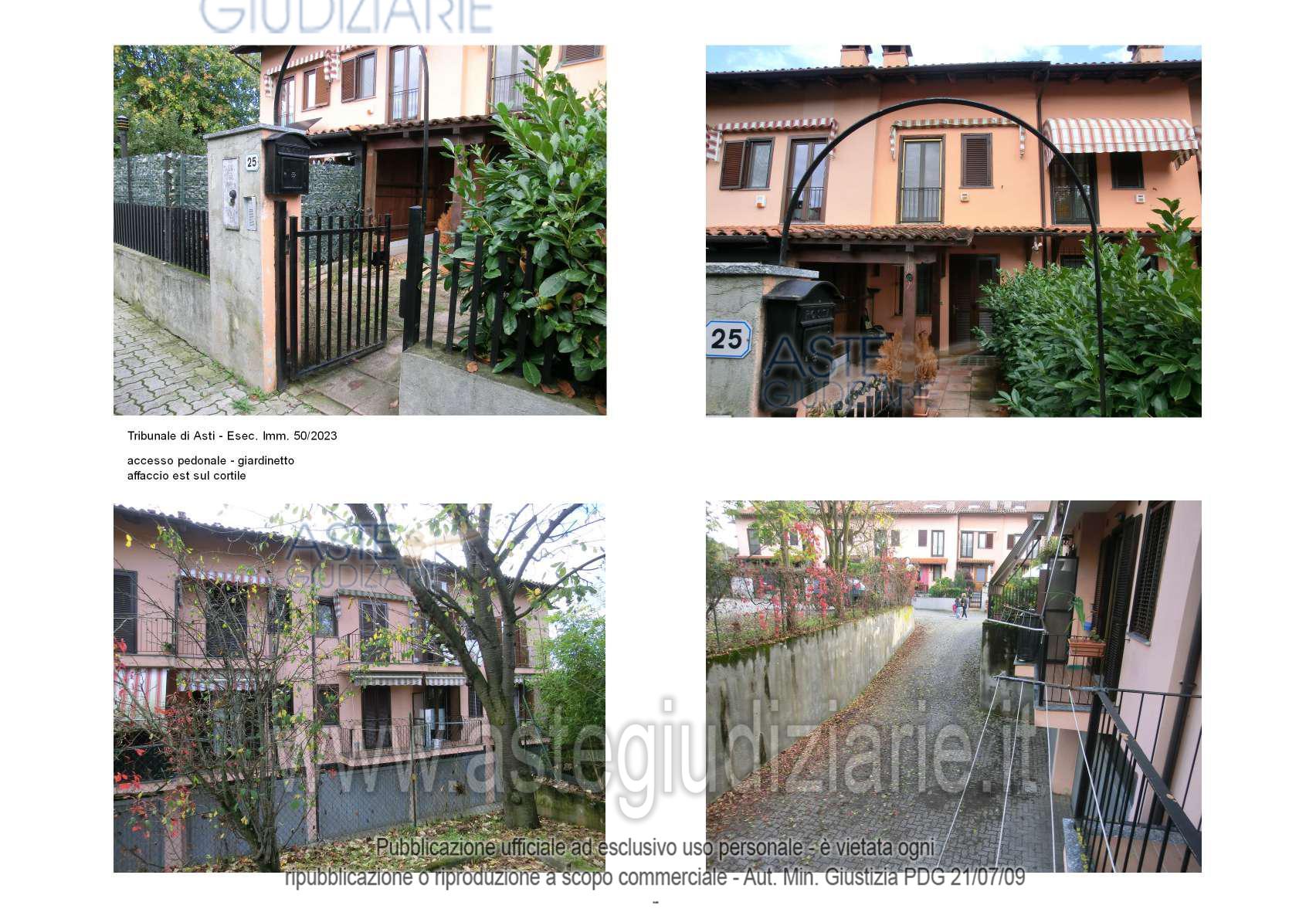 Vendita all'asta Senza incanto, con gara telematica asincrona - LOTTO 1: Villetta a schiera ad uso civile abitazione conrelative pertinenze (rimessa e giardinetto) facente parte di un complesso di 4 blocchi di edificia schiera. Prezzo base € 144.000,00 (offerta minima € 108.000,00). Data inizio operazioni di vendita: 22/05/2026 ore 16:00. Giudice Dott. Laura Brizi. Professionista delegato alla vendita Avv. Elisabetta Arrobbio. Custode Giudiziario Ifir Piemonte Ivg Srl - Email "richiestevisite.asti@ivgpiemonte.it". Rif. Tribunale di Asti - Espropriazione immobiliare (cartabia) n. 50/2023