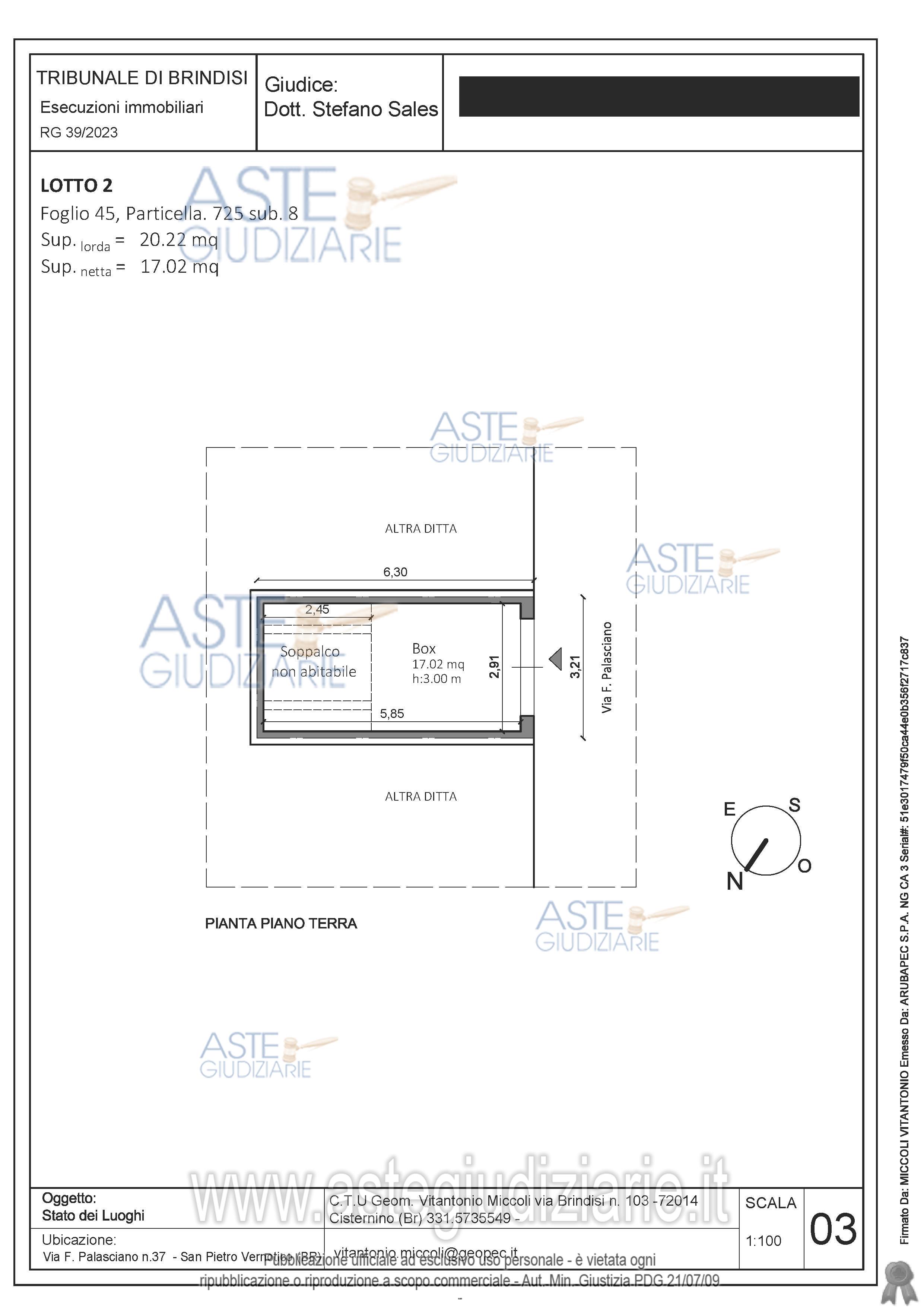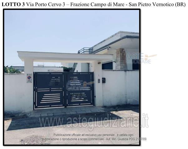 Vendita all'asta Senza incanto, con gara telematica asincrona - LOTTO 03: villa singola a San Pietro Vernotico, località Campo di Mare, Via Porto Cervo 3, frazione Campo di Mare, con giardino pertinenziale della superficie commerciale di 190,14 mq per la quota di 1/2 di piena proprietà. composto da 6,5 vani. La villa è stata costruita sulla particella n. 686 così come si evince dal progetto approvato dal Comune di San Pietro Vernotico. Identificazione catastale: foglio 13 particella 686 (catasto fabbricati), categoria A/7, classe 3, consistenza 6,5 vani, rendita 839,24 Euro. Prezzo base € 50.307,03 (offerta minima € 37.730,28). Data inizio operazioni di vendita: 15/06/2026 ore 10:30. Professionista delegato alla vendita Avv. Roberta De Castro - Email "avv.robertadecastro@gmail.com"; Cell. 3495369920. Custode Giudiziario Avv. Roberta De Castro - Email "avv.robertadecastro@gmail.com"; Cell. 3495369920. Rif. Tribunale di Brindisi - Esecuzione immobiliare post legge 80 n. 39/2023