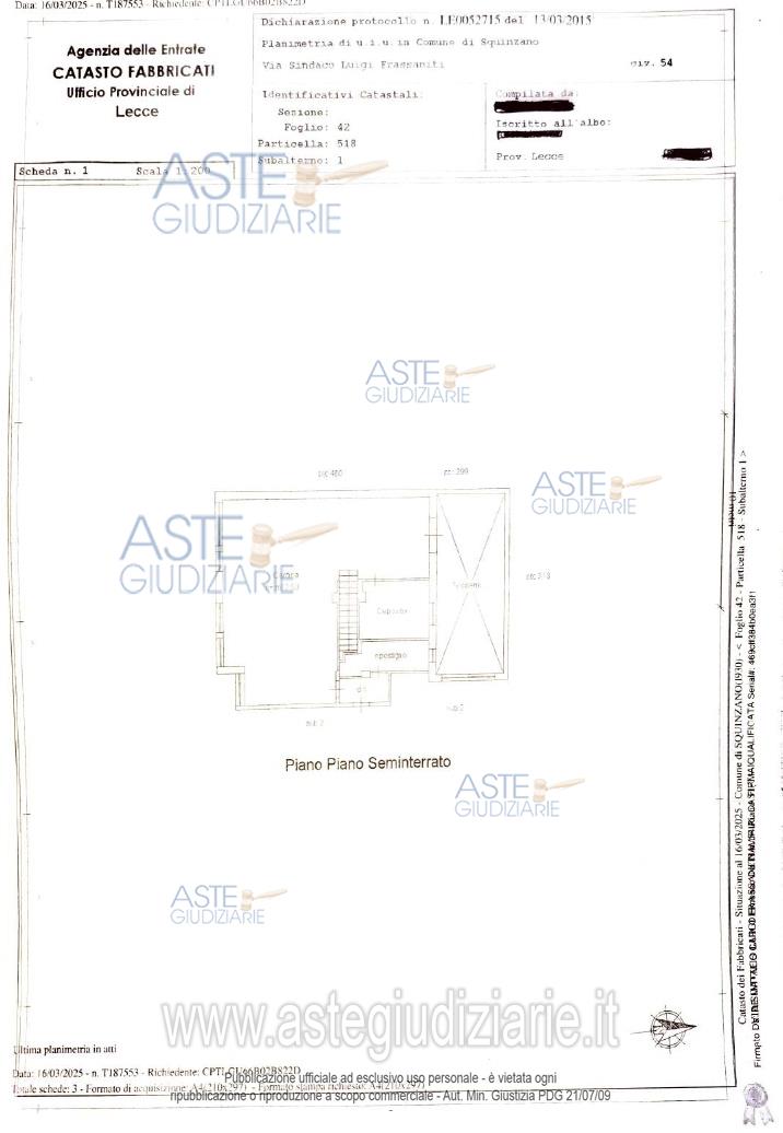 Vendita all'asta Senza incanto, con gara telematica asincrona - LOTTO UNICO: A. Una villa singola adibita a civile abitazione sita in Squinzano (Le) alla Via Luigi Sindaco Frassaniti n. 54/56 - B. Garage con annesso ripostiglio al piano seminterrato, della superficie lorda complessiva di circa 102,95 mq. Prezzo base € 349.579,00 (offerta minima € 262.185,00). Data inizio operazioni di vendita: 09/06/2026 ore 10:00. Professionista delegato alla vendita Rag. Alessandra Fragola - Email "alessandrafragola@libero.it"; Cell. 3392956325. Custode Giudiziario Rag. Alessandra Fragola - Email "alessandrafragola@libero.it"; Cell. 3392956325. Rif. Tribunale di Lecce - Espropriazione immobiliare (cartabia) n. 216/2024