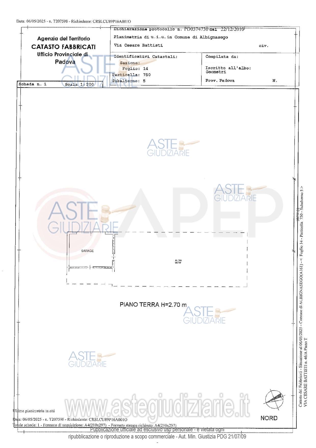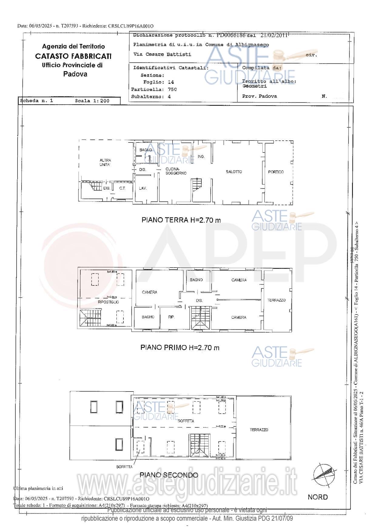 Vendita all'asta Senza incanto, con gara telematica sincrona - LOTTO UNICO: Lotto Unico - piena proprietà di edificio unifamiliare, sito in Comune di Albignasego (PD), via Cesare Battisti n. 46/A, e precisamente consiste in un villino sviluppato su tre piani fuori terra, con portico e terrazza soprastante, garage al piano terra e cortile esclusivo per una superficie commerciale di mq. 366. Occupato dal debitore. Prezzo base € 350.000,00 (offerta minima € 262.500,00). Data vendita 23/04/2026 ore 10:00. Giudice Pasqualetto. Professionista delegato alla vendita Not. Marianna Russo - Email "aste@apepnotai.it"; Tel. 049651228. Custode Giudiziario Apep - Email "visita@apepnotai.it"; Tel. 049651228. Rif. Tribunale di Padova - Espropriazione immobiliare (cartabia) n. 87/2025