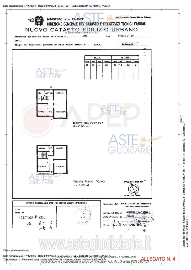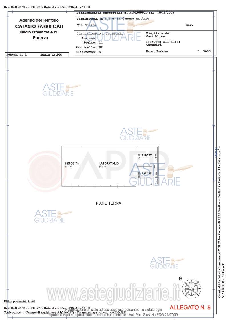 Vendita in attesa dell'emissione del nuovo bando d'asta. LOTTO UNICO: Lotto Unico - piena proprietà di fabbricato monofamiliare in Comune di Arre (PD), via Cristo n. 33, abitazione sviluppata su 2 livelli, piano terra e primo. Al primo piano sono presenti 3 camere da letto con bagno e anti. Sul retro dell'edificio principale si trova un fabbricato accessorio, destinato ad uso ricovero materiale e rimessa macchine da cantiere e pollaio, per un superficie commerciale complessiva di mq. 273; il tutto insistente su area coperta e scoperta esclusiva di catastali mq. 1.519. Libero. Ultimo prezzo base € 94.000,00 (offerta minima € 70.500,00). Giudice Rossi. Professionista delegato alla vendita Not. Emanuela Lo Buono - Email "aste@apepnotai.it"; Tel. 049651228. Custode Giudiziario Apep - Email "visita@apepnotai.it"; Tel. 049651228. Rif. Tribunale di Padova - Espropriazione immobiliare (cartabia) n. 200/2024