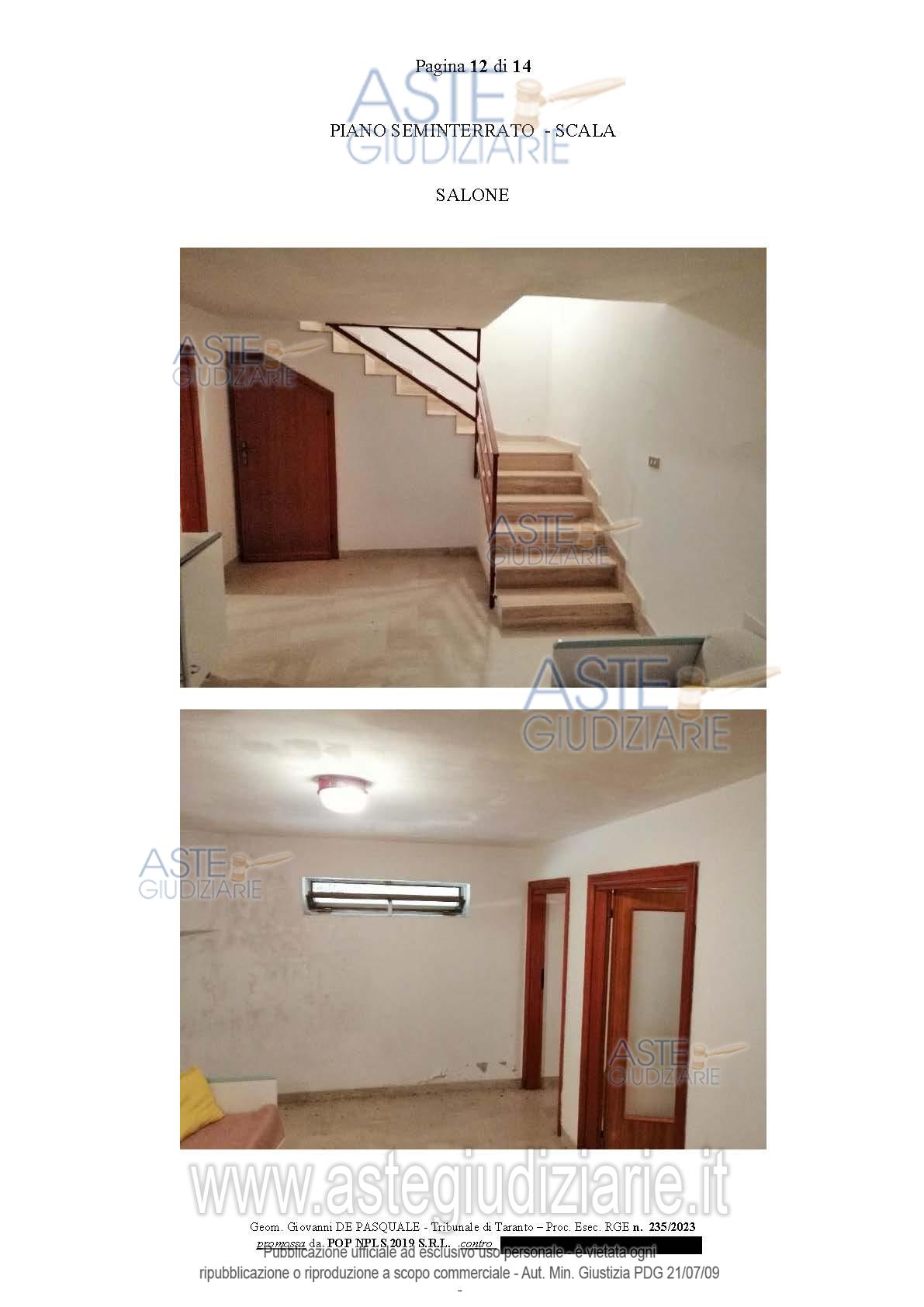 Vendita all'asta Senza incanto, con gara telematica asincrona - LOTTO UNICO: Villetta a schiera composta da piano seminterrato, piano rialzato e primo piano con giardino pertinenziale per due lati ad uso esclusivo e con accesso autonomo da Via Schirra. Prezzo base € 192.000,00 (offerta minima € 144.000,00). Data inizio operazioni di vendita: 13/01/2026 ore 16:30. Giudice Andrea Paiano. Professionista delegato alla vendita Avv. Gennaro Rispoli - Email "rispoli971@gmail.com"; Cell. 3454121633; Tel. 0997794787. Custode Giudiziario Ivg Taranto - Email "ivgta.visiteimmobili@gmail.com". Rif. Tribunale di Taranto - Espropriazione immobiliare (cartabia) n. 235/2023