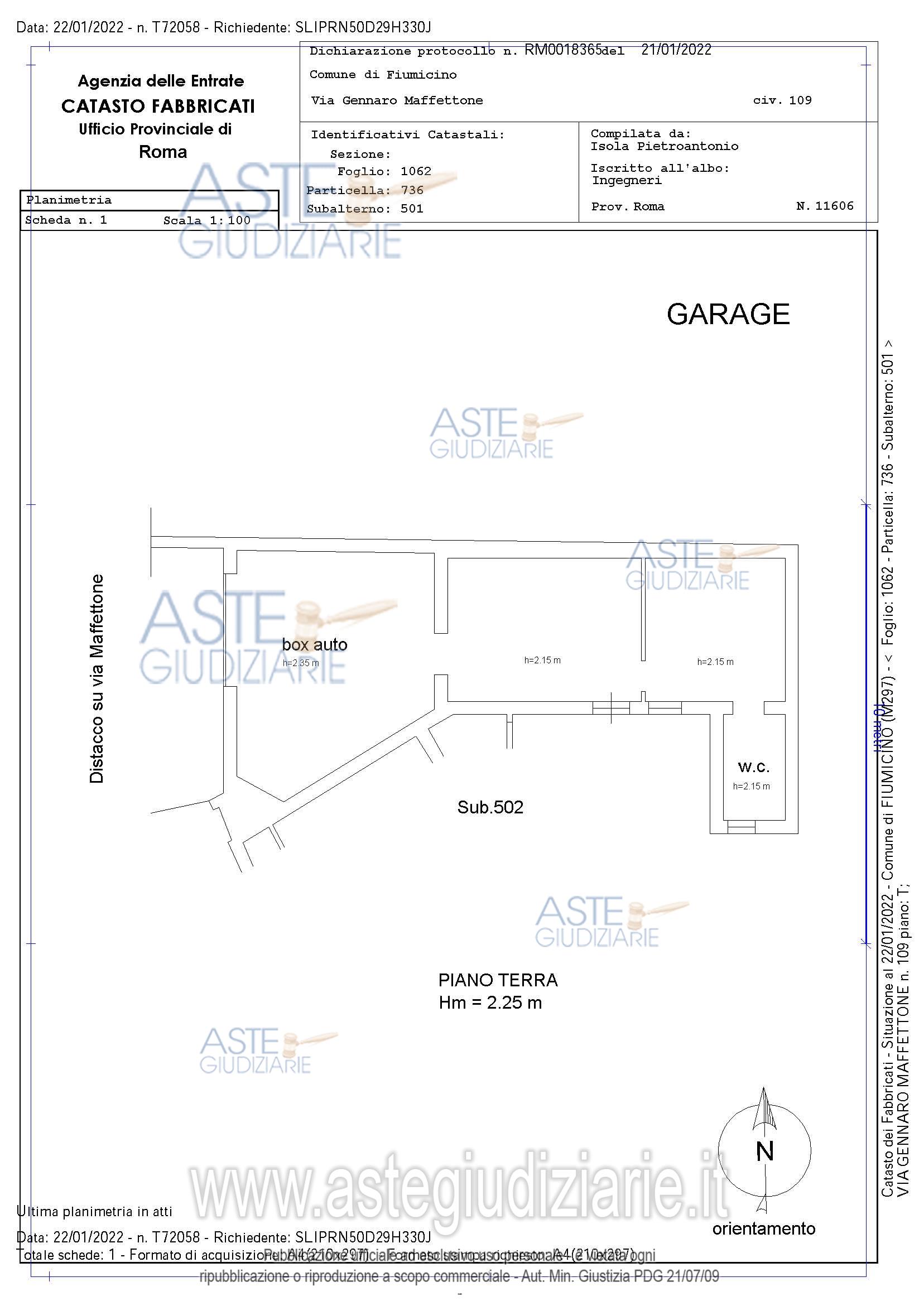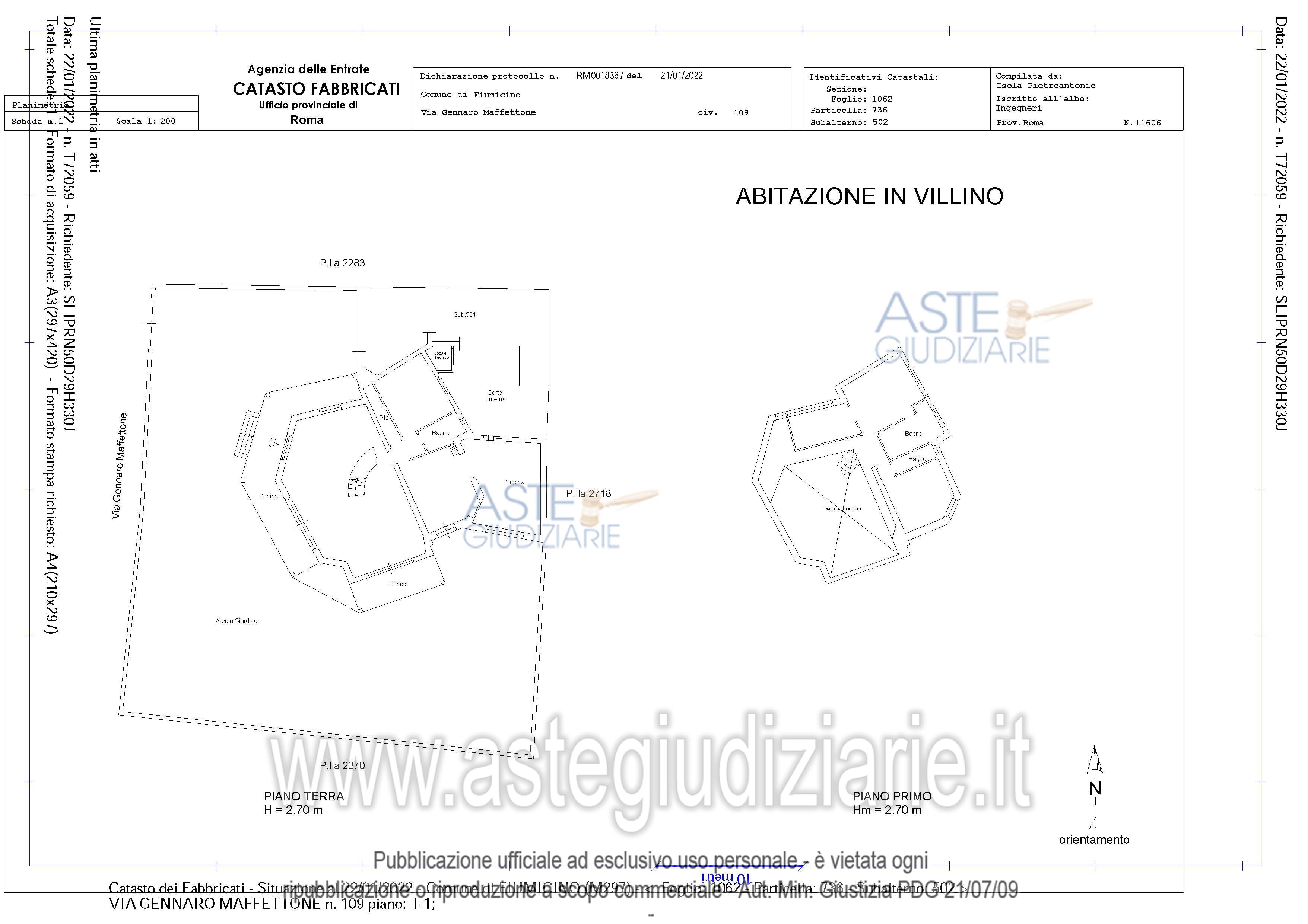 Vendita all'asta Senza incanto, con gara telematica asincrona - LOTTO UNICO: Abitazione in villini sita in Fiumicino (RM), Via Gennaro Maffettone n.109 con Identificativo catastale Fg 1062, Part 736, Sub 502 (ex sub 1 e 2), Consist. 10,5 vani,R.C. 1.708,18 e annesso locale garage [categoria catastale C/6] Identificativo catastale Fg 1062,Part 736, Sub 501 (ex sub 3), Consist. Mq 50, R.C. 258,23.Il compendio esecutato consiste in una villa su due piani (terreno e primo) e di un garage separato posti sul terreno foglio 60, particella 1192 di superfice complessiva di circa mq 800. Prezzo base € 617.000,00 (offerta minima € 462.750,00). Data inizio operazioni di vendita: 16/02/2026 ore 12:00. Professionista delegato alla vendita Not. Cristiano Cavicchioni - Email "anvi@notariato.it"; Tel. 0639745162. Custode Giudiziario Not. Cristiano Cavicchioni - Email "anvi@notarito.it"; Tel. 0639745162. Rif. Tribunale di Civitavecchia - Esecuzione immobiliare post legge 80 n. 210/2020