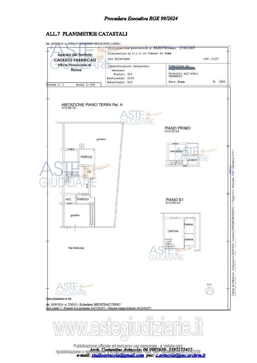 Custode Giudiziario: Avv. Marco Pietrocola - Email "marcopietrocola@gmail.com"; Cell. 329/4917796.