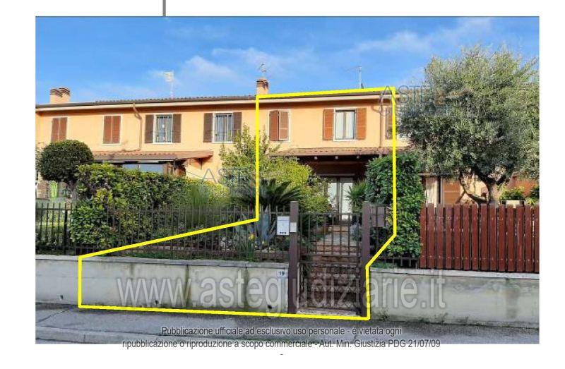 Vendita all'asta Senza incanto, con gara telematica sincrona mista - LOTTO 1: Piena proprietà di villetta a schiera centrale disposta su tre livelli, dotata di giardini esclusivi e pertinenziali autorimessa e cantina al piano interrato.