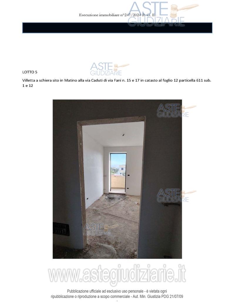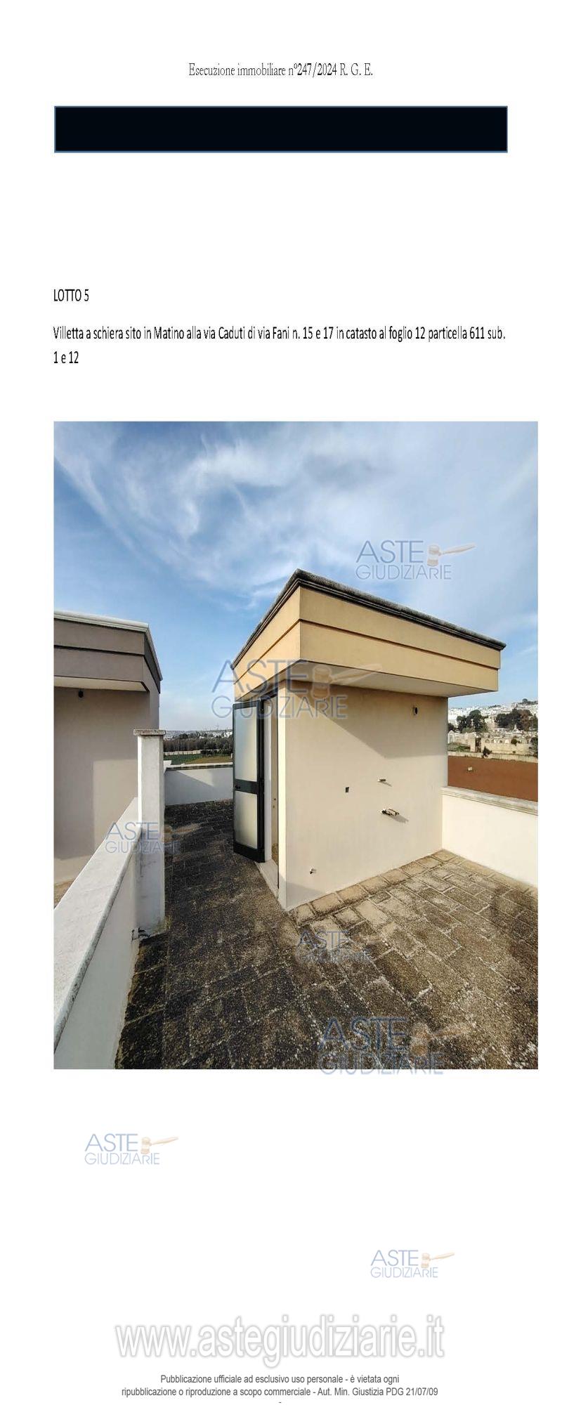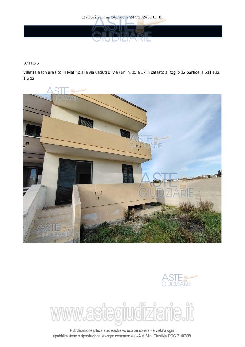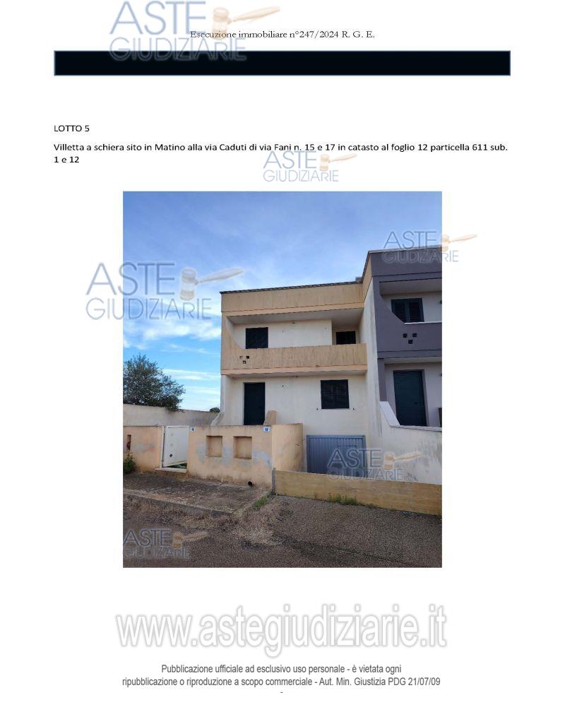 Vendita all'asta Senza incanto, con gara telematica asincrona - LOTTO 5: Villetta a schiera sita a MATINO alla via Caduti di via Fani n. 15, per la quota di 1/1 di piena proprietà. Garage, sito a MATINO alla via Caduti di via Fani n. 17 posto a piano seminterrato, accessibile da rampa carrabile e composto da unico vano intervallato nel mezzo da scala di collegamento ai piani superiori. Prezzo base € 88.900,00 (offerta minima € 66.675,00). Data inizio operazioni di vendita: 20/01/2026 ore 12:00. Giudice Dott. Anna Francesca Capone. Professionista delegato alla vendita Avv. Gabriele Toma - Tel. 3493932555 - 3928274. Custode Giudiziario Avv. Gabriele Toma - Email "avvocato.gabrieletoma@gmail.com"; Tel. 3493932555 - 3928274. Rif. Tribunale di Lecce - Espropriazione immobiliare (cartabia) n. 247/2024