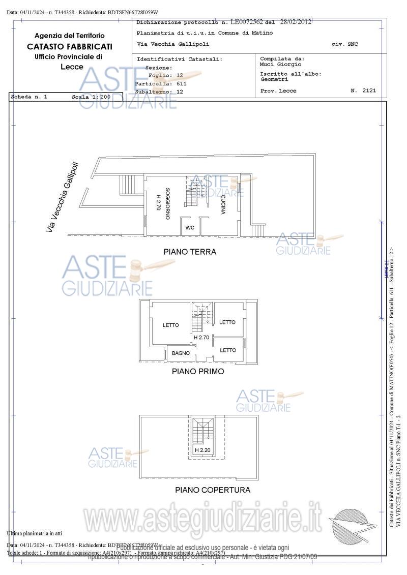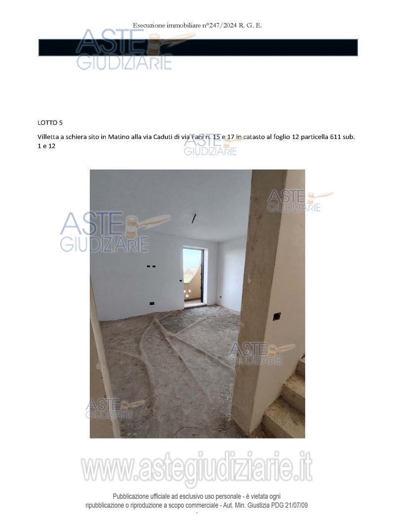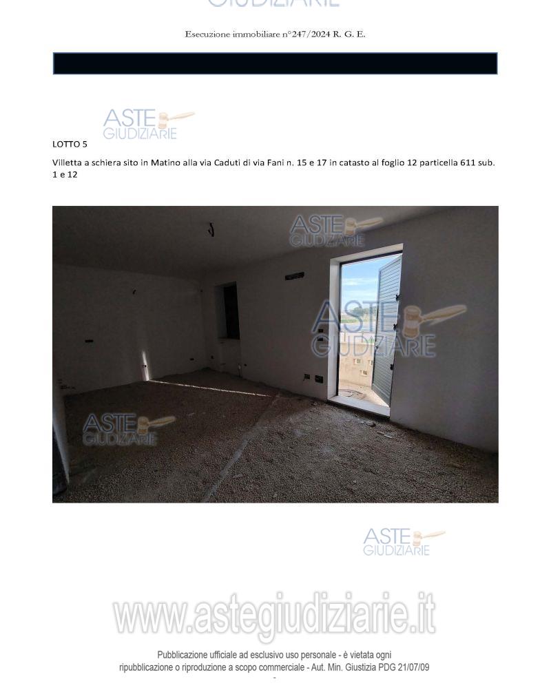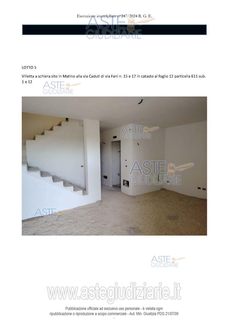 Vendita all'asta Senza incanto, con gara telematica asincrona - LOTTO 5: Villetta a schiera sita a MATINO alla via Caduti di via Fani n. 15, per la quota di 1/1 di piena proprietà. Garage, sito a MATINO alla via Caduti di via Fani n. 17 posto a piano seminterrato, accessibile da rampa carrabile e composto da unico vano intervallato nel mezzo da scala di collegamento ai piani superiori. Prezzo base € 88.900,00 (offerta minima € 66.675,00). Data inizio operazioni di vendita: 20/01/2026 ore 12:00. Giudice Dott. Anna Francesca Capone. Professionista delegato alla vendita Avv. Gabriele Toma - Tel. 3493932555 - 3928274. Custode Giudiziario Avv. Gabriele Toma - Email "avvocato.gabrieletoma@gmail.com"; Tel. 3493932555 - 3928274. Rif. Tribunale di Lecce - Espropriazione immobiliare (cartabia) n. 247/2024