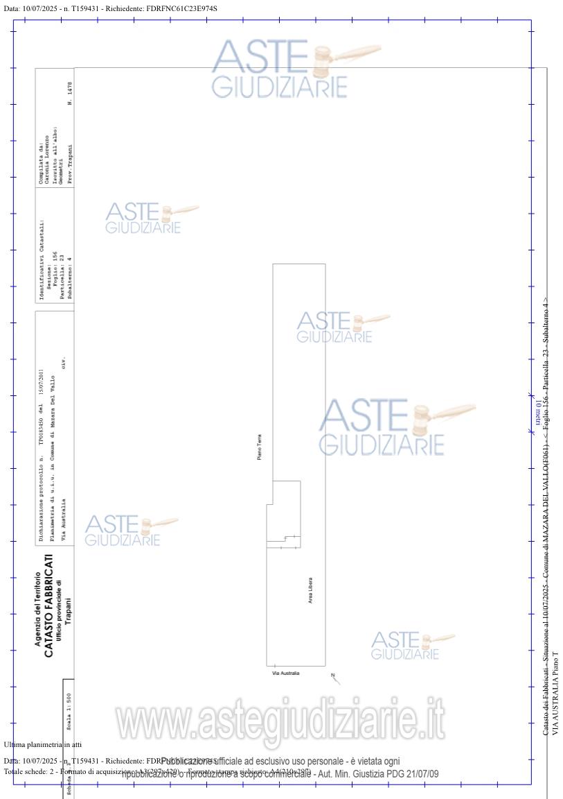 Vendita all'asta Senza incanto, con gara telematica asincrona - LOTTO UNICO: piena proprietà di una villetta di mq.134 circa oltre ad una veranda coperta di 30 mq. circa con terreno pertinenziale di mq.1310 circa sita in Mazara del Vallo nella via Australia n.66. Identificata al catasto fabbricati al foglio di mappa n.156 part.23 sub.4 ed al catasto terreni al foglio 156 part.23. Prezzo base € 121.920,00 (offerta minima € 91.440,00). Data inizio operazioni di vendita: 07/05/2026 ore 16:00. Professionista delegato alla vendita Avv. Giuseppe Peloso - Email "avvpeloso@libero.it". Custode Giudiziario Avv. Giuseppe Peloso - Email "avvpeloso@libero.it". Rif. Tribunale di Marsala - Espropriazione immobiliare (cartabia) n. 11/2025