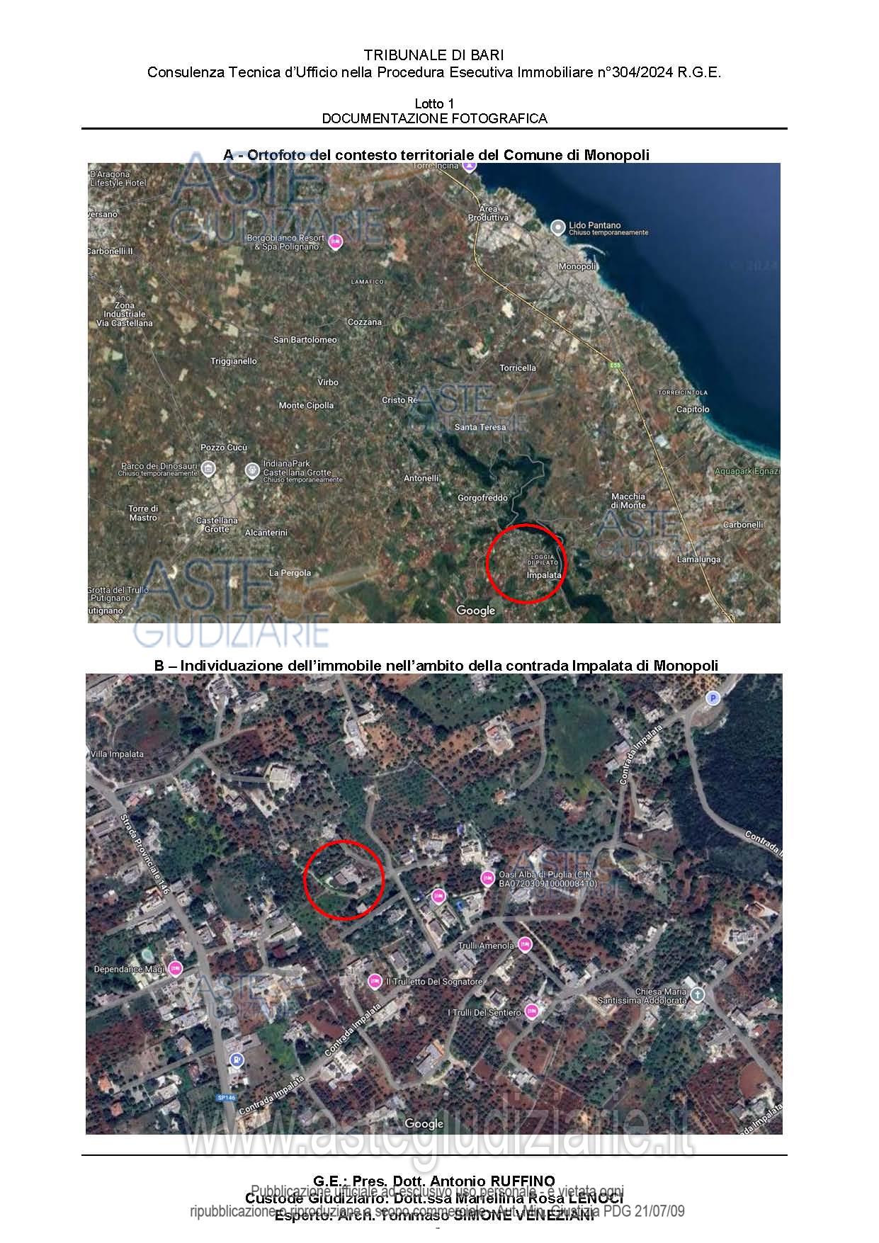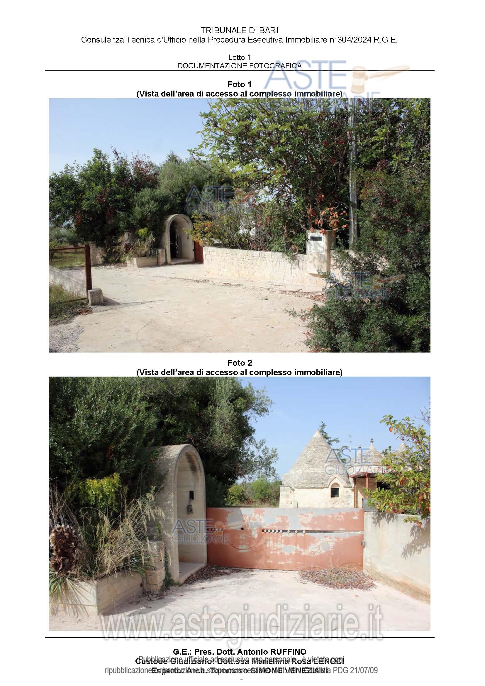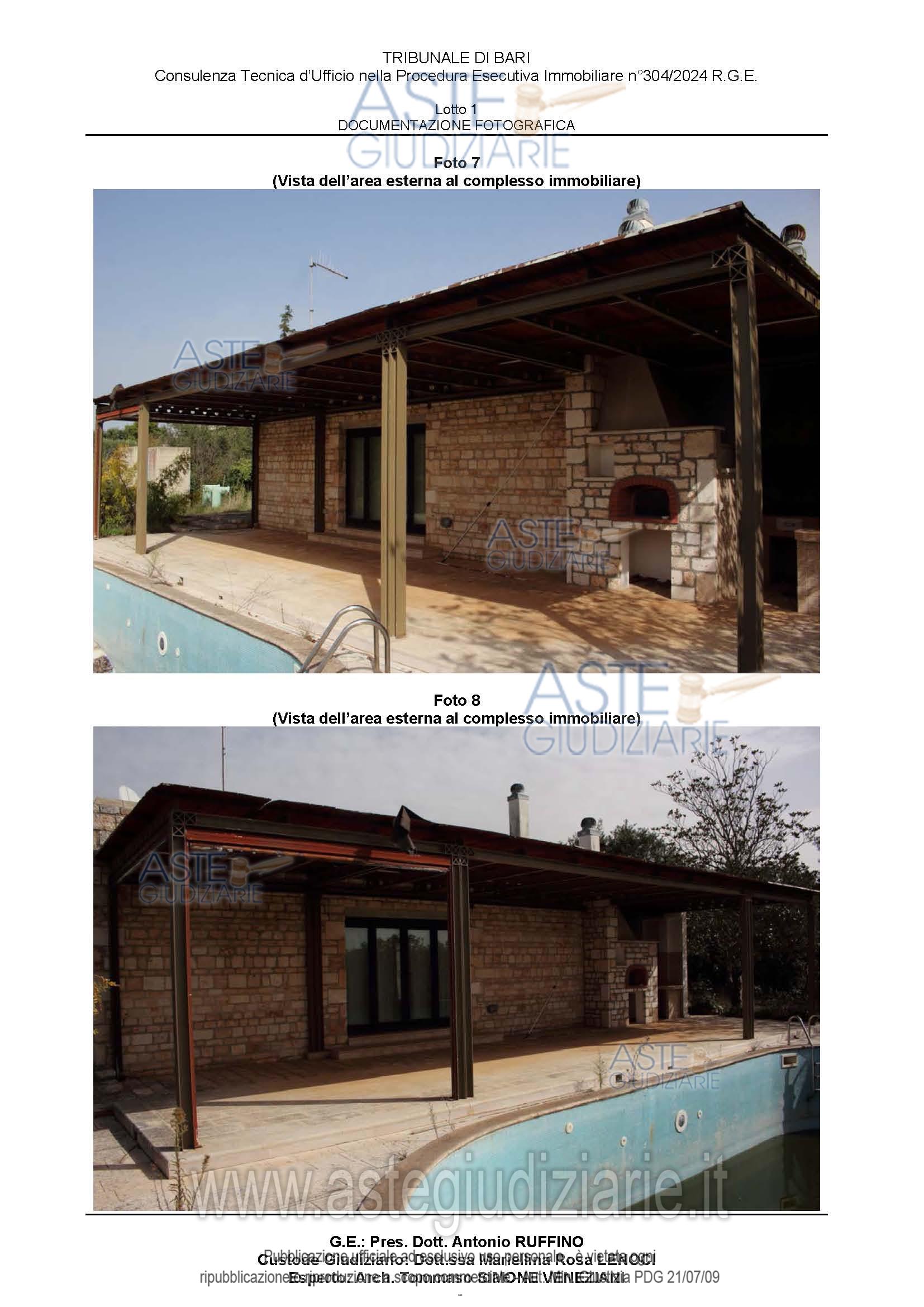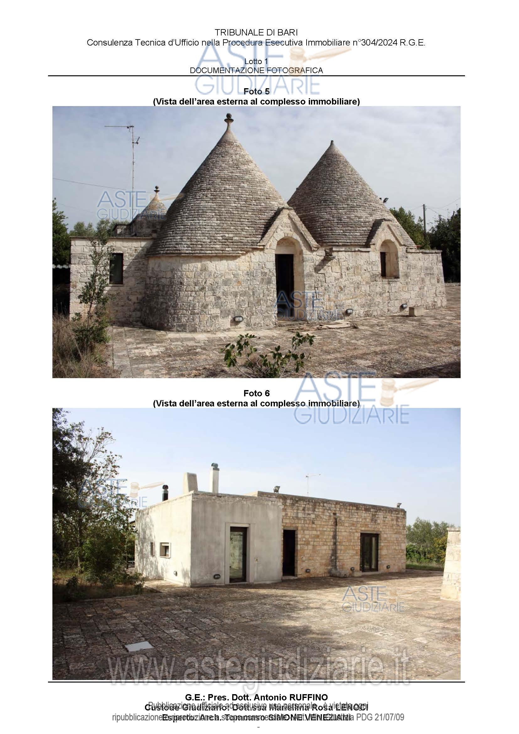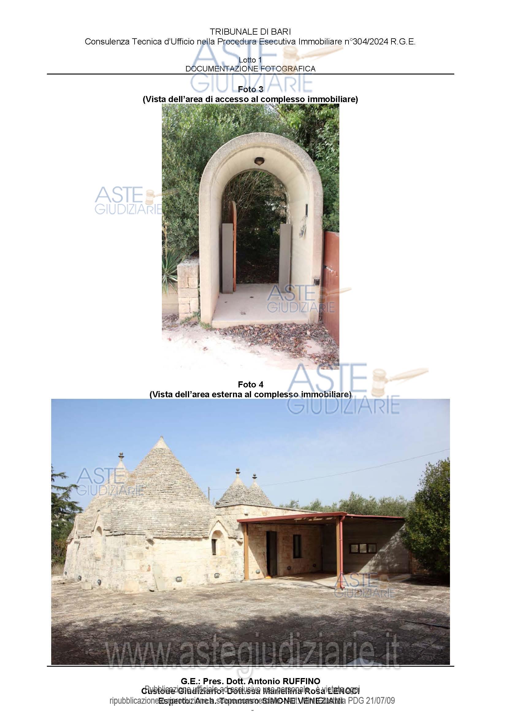 Vendita all'asta Senza incanto, con gara telematica asincrona - LOTTO 1: Piena proprietà dell’unità immobiliare a destinazione abitativa sita a Monopoli alla contrada Impalata n.c. composta da vani principali a trullo al piano terra con pertinenziale corpo di fabbrica adibito a tavernetta al piano terra e locale macchine e cisterna al piano interrato, compresa l'area esterna coperta, scoperta e piscina. Prezzo base € 134.000,00 (offerta minima € 100.500,00). Data inizio operazioni di vendita: 22/01/2026 ore 17:15. Giudice Dott. Antonio Ruffino. Professionista delegato alla vendita Not. Mariellina Rosa Lenoci - Email "mlenoci@notariato.it". Custode Giudiziario Not. Mariellina Rosa Lenoci - Email "mlenoci@notariato.it"; Tel. 0805289033. Rif. Tribunale di Bari - Espropriazione immobiliare (cartabia) n. 304/2024