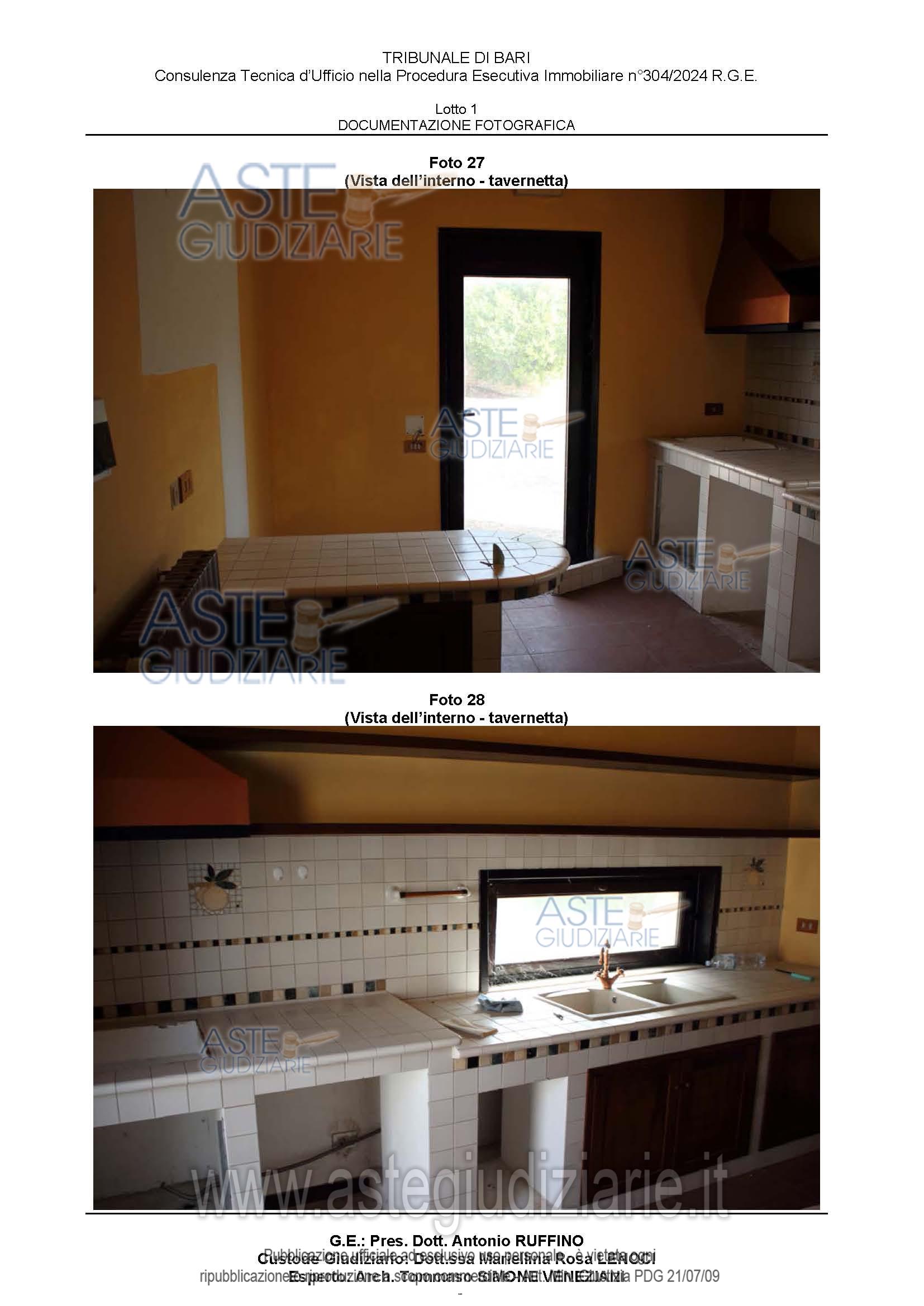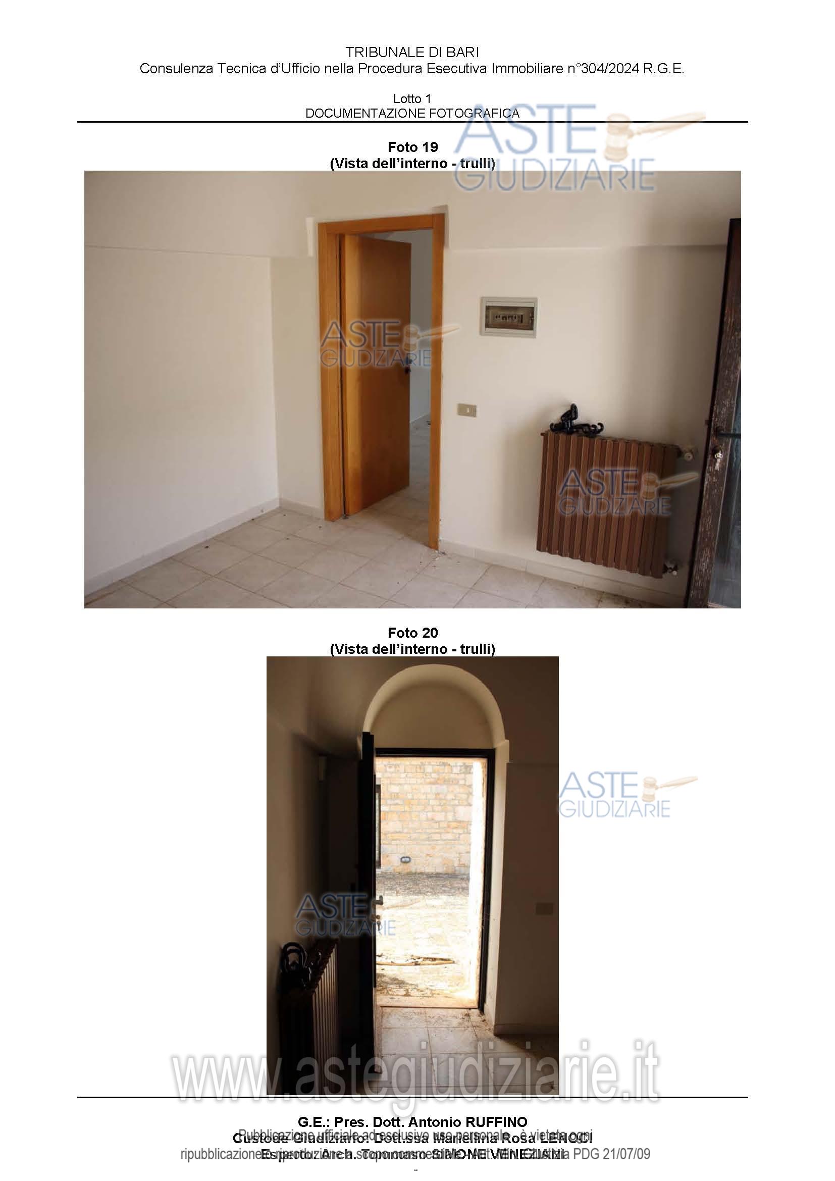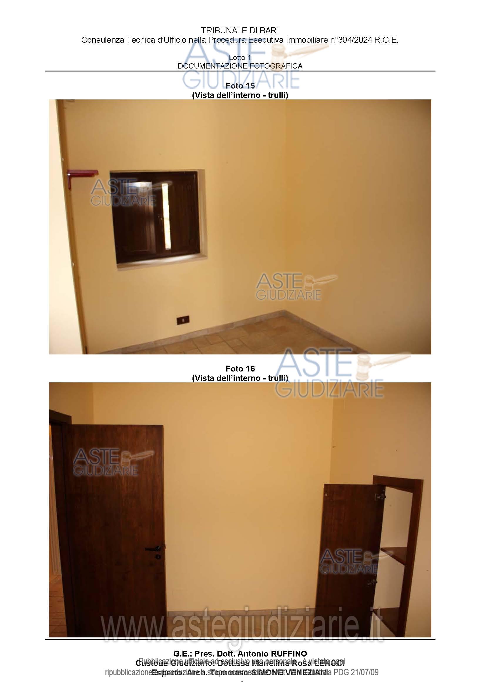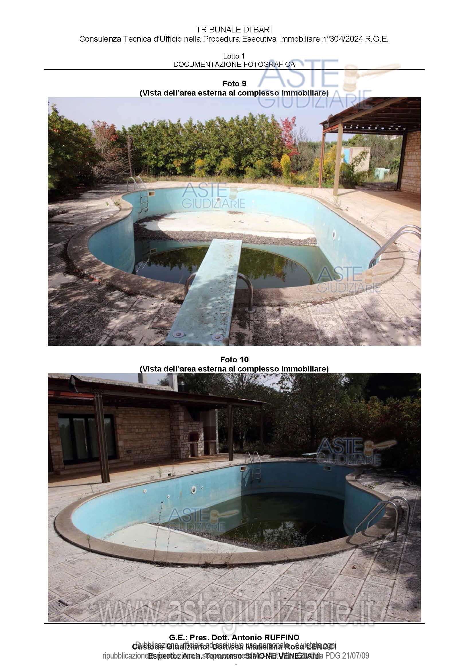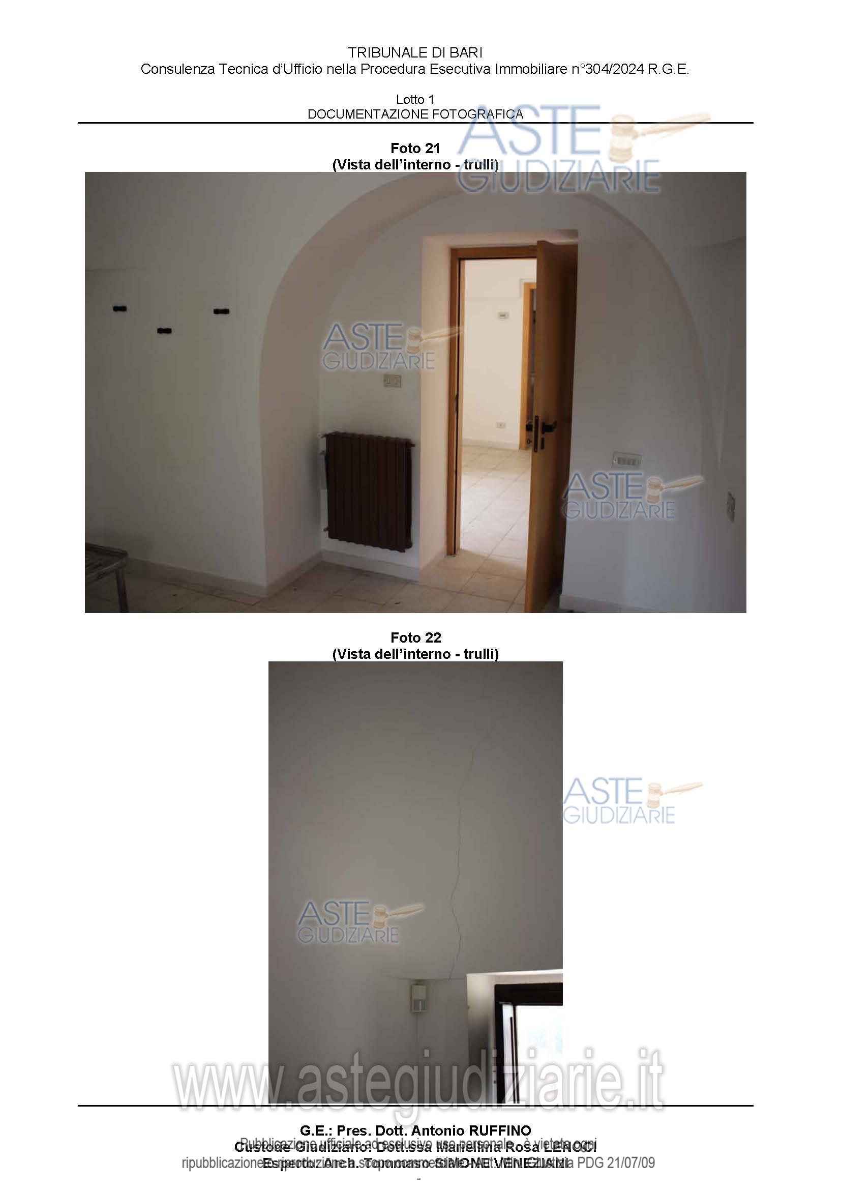 Vendita all'asta Senza incanto, con gara telematica asincrona - LOTTO 1: Piena proprietà dell’unità immobiliare a destinazione abitativa sita a Monopoli alla contrada Impalata n.c. composta da vani principali a trullo al piano terra con pertinenziale corpo di fabbrica adibito a tavernetta al piano terra e locale macchine e cisterna al piano interrato, compresa l'area esterna coperta, scoperta e piscina. Prezzo base € 134.000,00 (offerta minima € 100.500,00). Data inizio operazioni di vendita: 22/01/2026 ore 17:15. Giudice Dott. Antonio Ruffino. Professionista delegato alla vendita Not. Mariellina Rosa Lenoci - Email "mlenoci@notariato.it". Custode Giudiziario Not. Mariellina Rosa Lenoci - Email "mlenoci@notariato.it"; Tel. 0805289033. Rif. Tribunale di Bari - Espropriazione immobiliare (cartabia) n. 304/2024