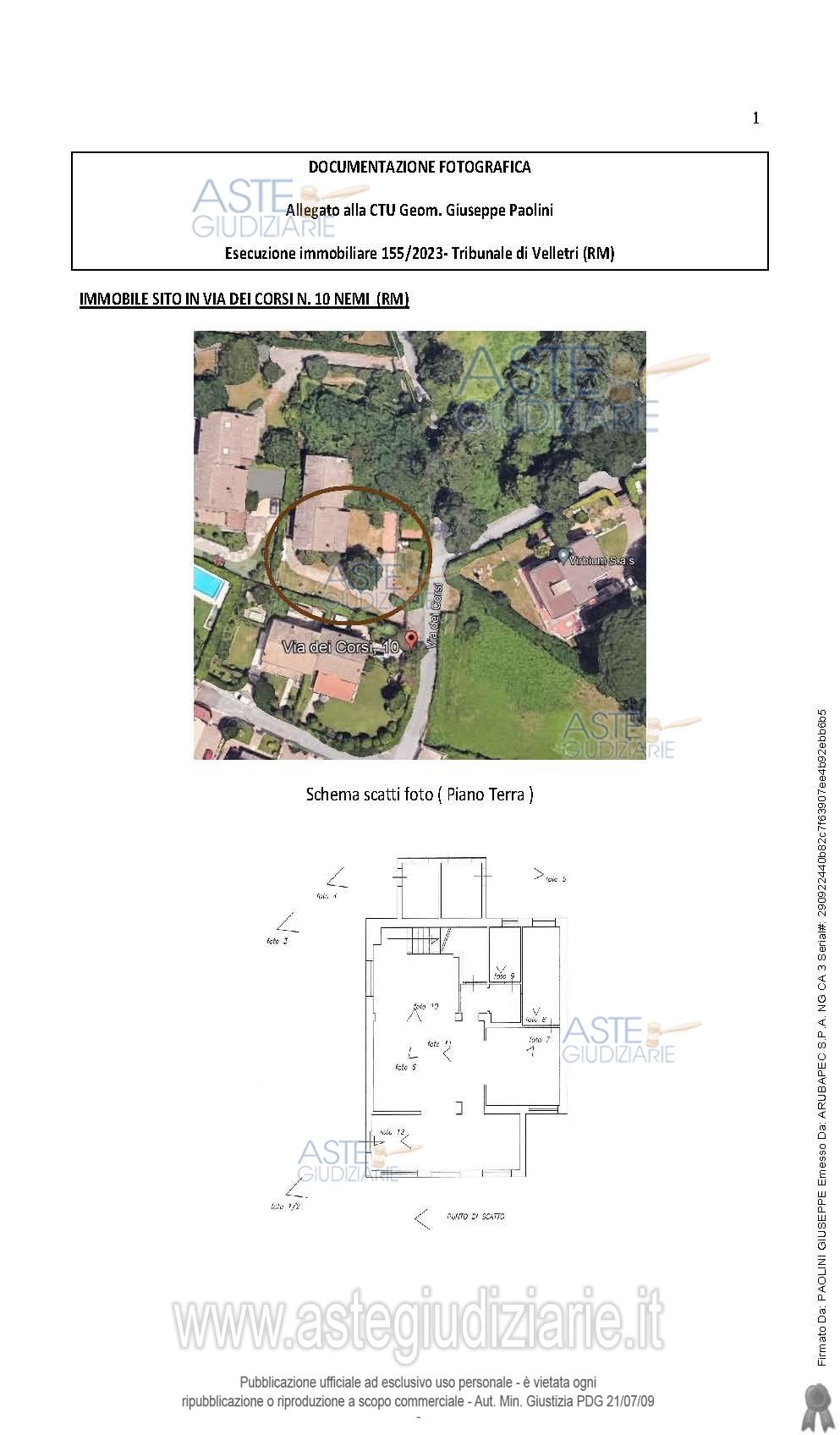 Vendita all'asta Senza incanto, con gara telematica asincrona - LOTTO 1: Villetta ubicata a Nemi (RM) composta da piano T-1-S1 con corte e box auto. Prezzo base € 210.000,00 (offerta minima € 157.500,00). Data inizio operazioni di vendita: 27/11/2025 ore 10:00. Professionista delegato alla vendita Avv. Luana Guercini - Email "luanaguercini@live.it"; Cell. 3409179294; Tel. 0693667934. Custode Giudiziario Avv. Luana Guercini - Email "luanaguercini@live.it"; Cell. 3409179294; Tel. 0693667934. Rif. Tribunale di Velletri - Espropriazione immobiliare (cartabia) n. 155/2023