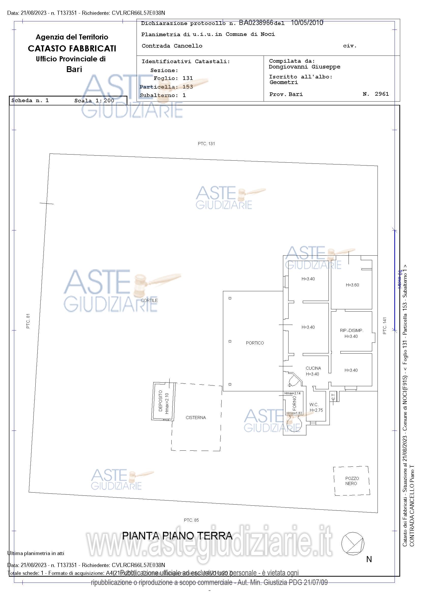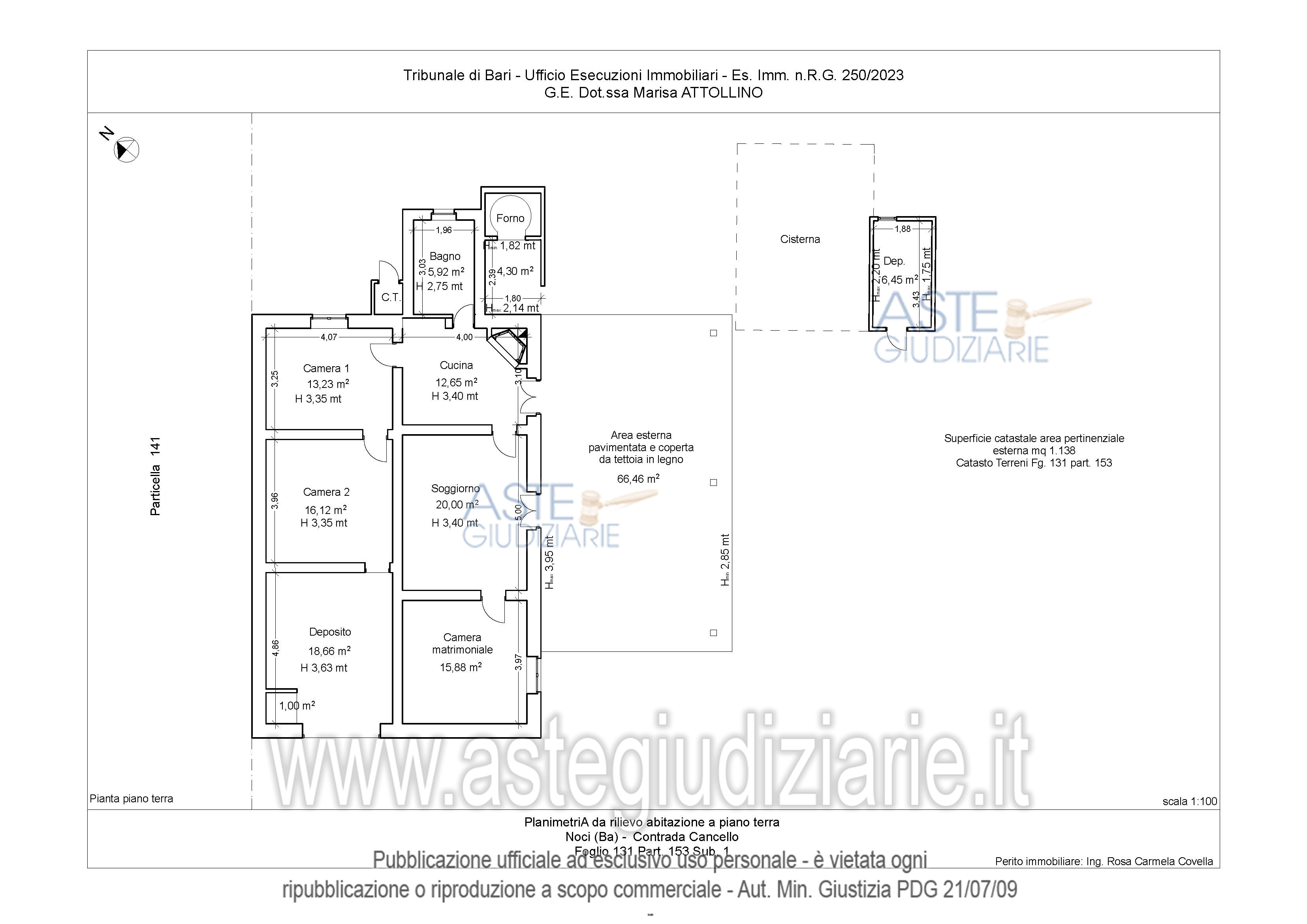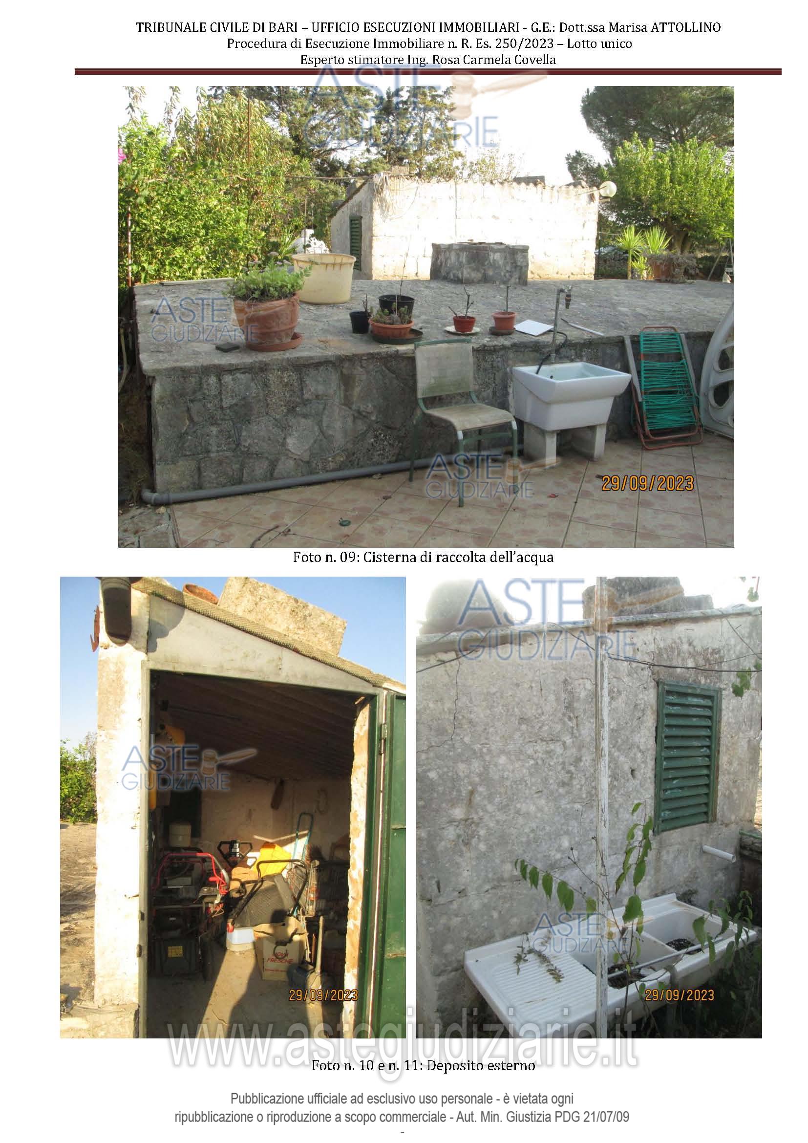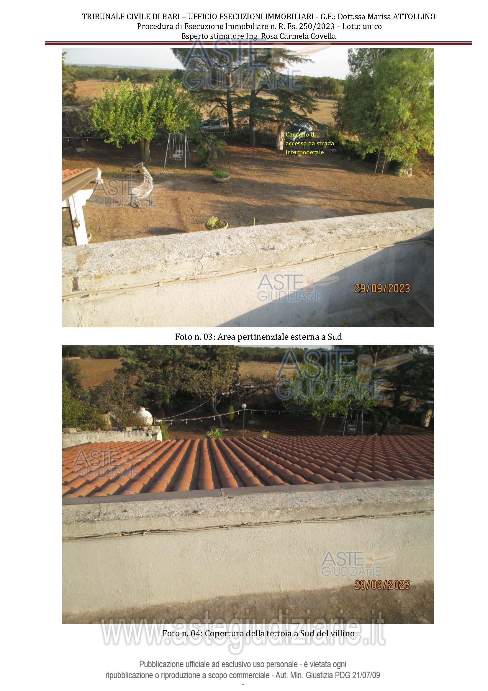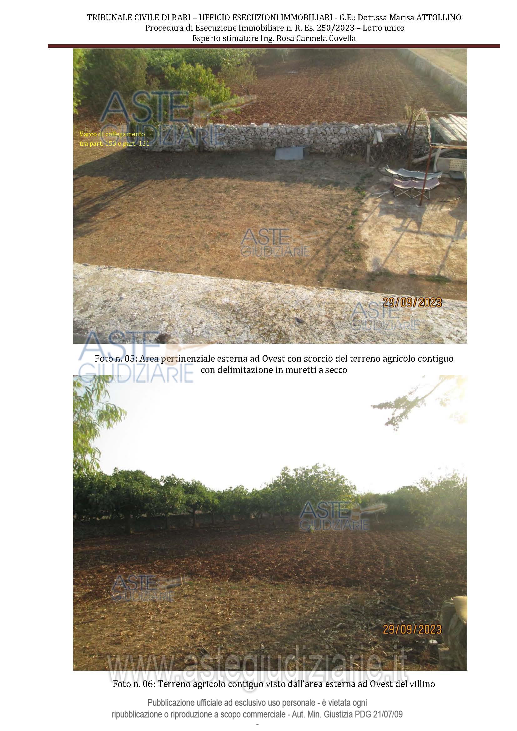 Vendita all'asta Senza incanto, con gara telematica asincrona - LOTTO UNICO: Piena proprietà di villino composto da quattro vani ed accessori al piano terra, con annesso forno, locale ad uso deposito, cisterna, pozzo nero e pertinenziale area esterna. Terreno agricolo. Prezzo base € 75.075,00 (offerta minima € 56.306,25). Data inizio operazioni di vendita: 10/02/2026 ore 10:00. Giudice Dott. Marisa Attollino. Professionista delegato alla vendita Avv. Angela Antonicelli - Email "antonicelliangela@alice.it". Custode Giudiziario Avv. Angela Antonicelli - Email "antonicelliangela@alice.it". Rif. Tribunale di Bari - Espropriazione immobiliare (cartabia) n. 250/2023