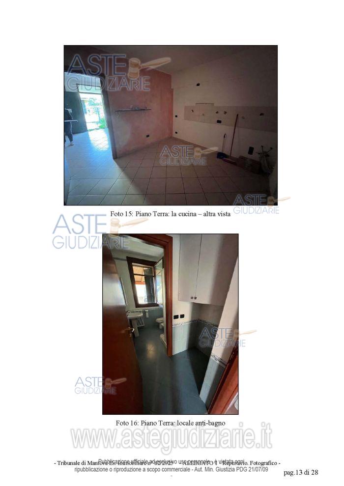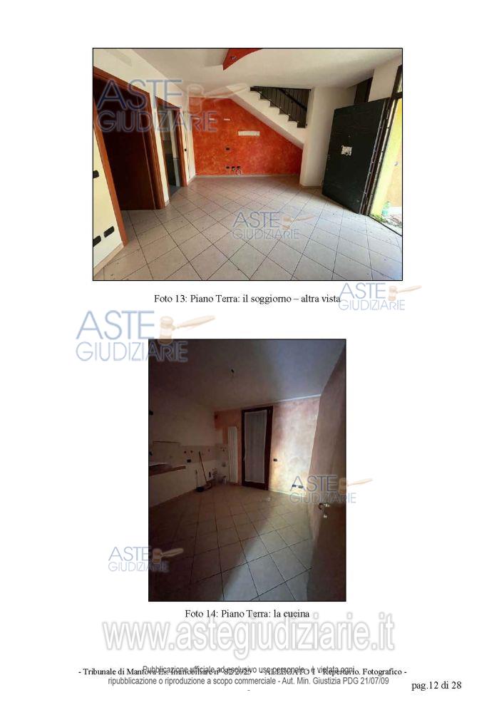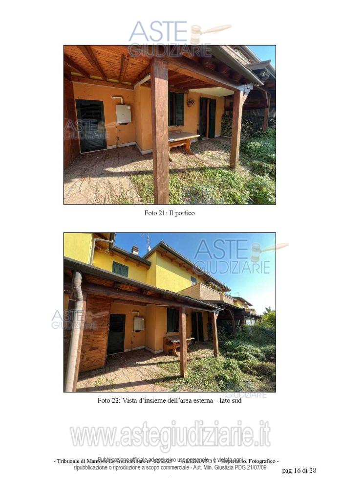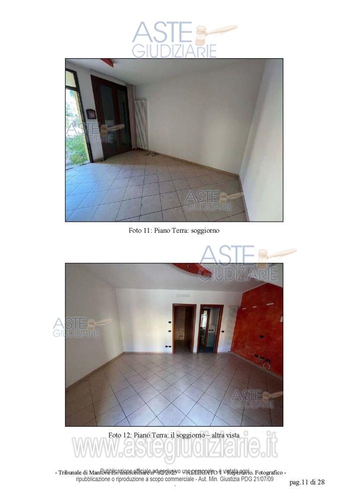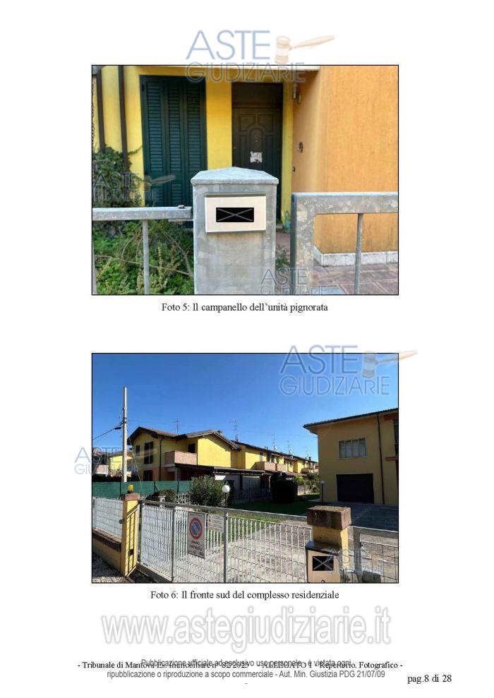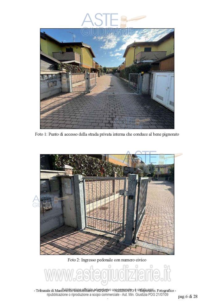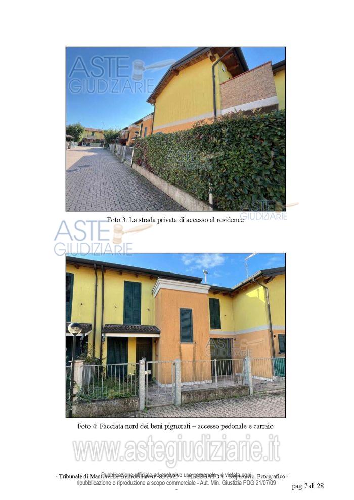 Vendita all'asta Senza incanto, con gara telematica sincrona mista - LOTTO UNICO: Intera piena proprietà di villetta a schiera sviluppantesi su due piani fuori terra, facente parte di complesso residenziale e composta: al piano terra, da ingresso-soggiorno-pranzo con vano scale, cucina, antibagno, bagno e portico; al piano primo, da vano scale, disimpegno, ripostiglio, tre camere da letto, bagno e balcone; con annesse area cortilive antistante e retrostante; garage pertinenziale posto al piano terra del medesimo corpo di fabbrica dellavilletta. Prezzo base € 96.900,00 (offerta minima € 72.675,00). Data vendita 13/03/2026 ore 16:00. Giudice Dott. Francesca Arrigoni. Professionista delegato alla vendita Avv. Franco Benassi. Custode Giudiziario Sovemo Istituto Vendite Giudiziarie Di Mantova - Email "immobiliaremantova@sovemo.com"; Tel. 0376220694. Rif. Tribunale di Mantova - Espropriazione immobiliare (cartabia) n. 82/2025